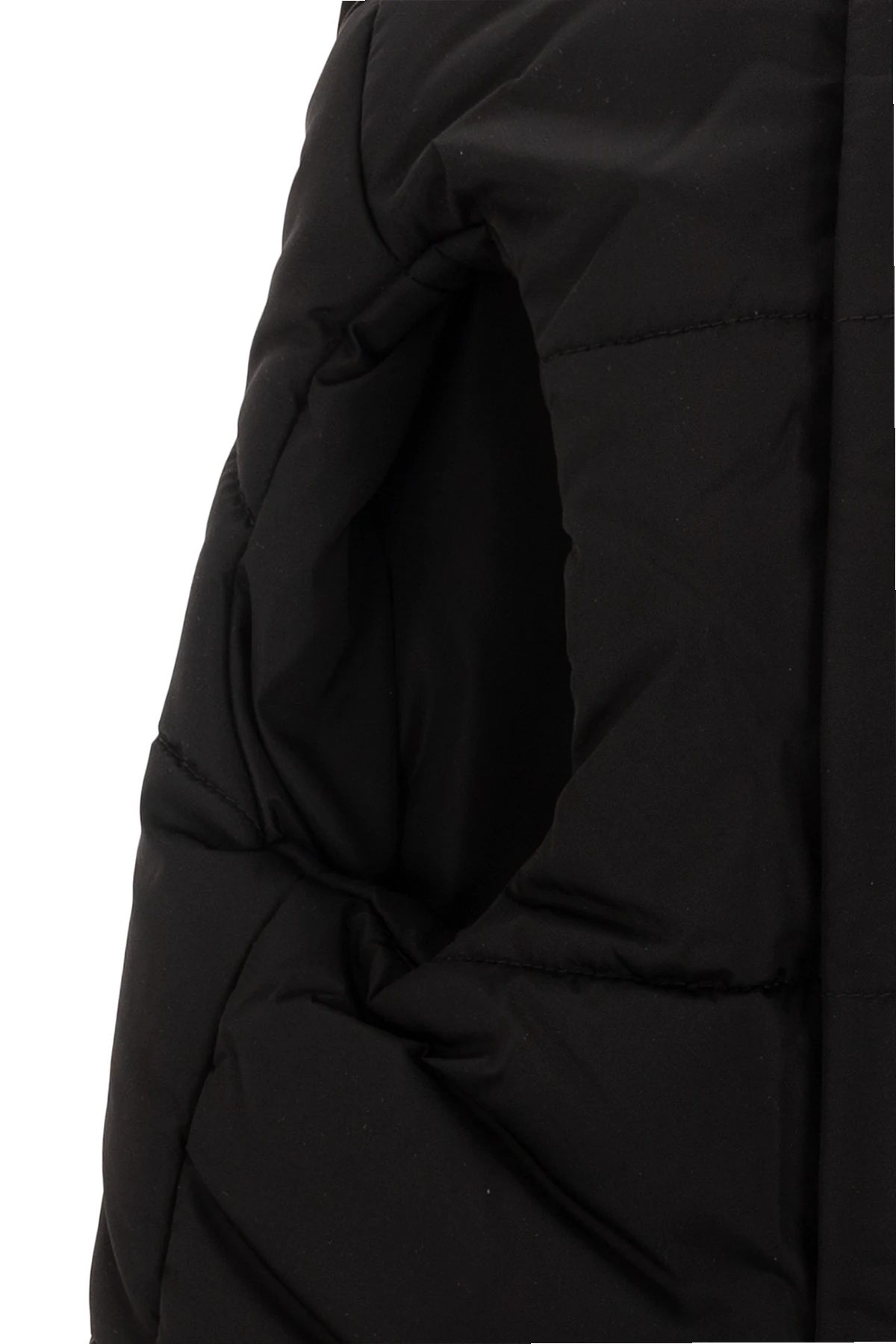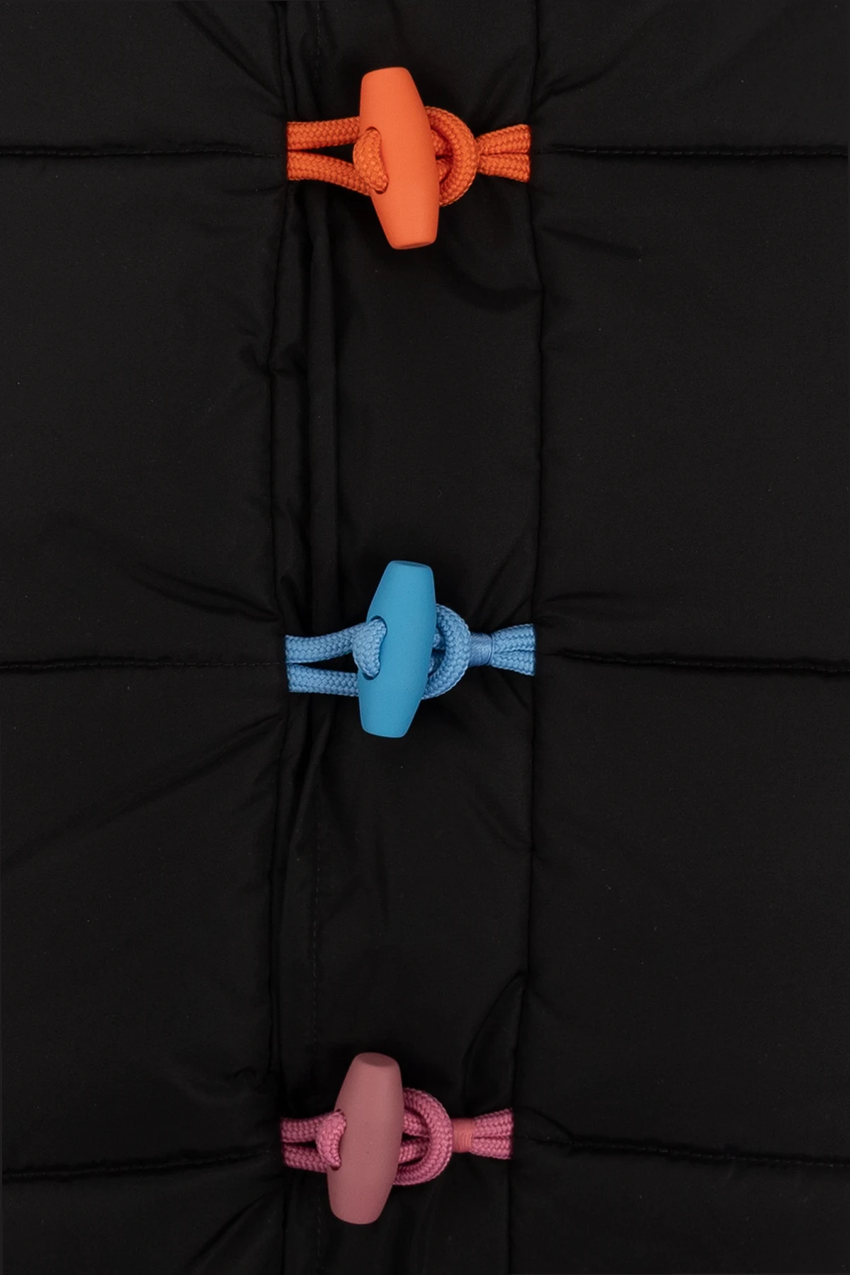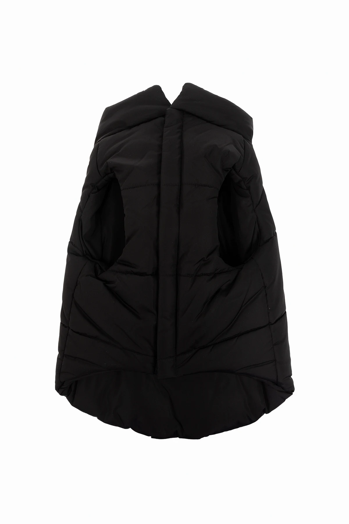 Black quilted dog vest from Moncler Genius, the ‘Moncler Poldo Dog Couture’ collection. Fastened with velcro, this design features a patch, logo detail and decorative buttons in yellow, blue and orange.