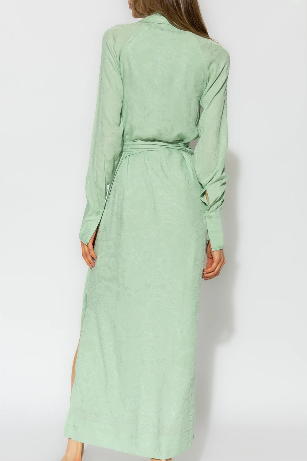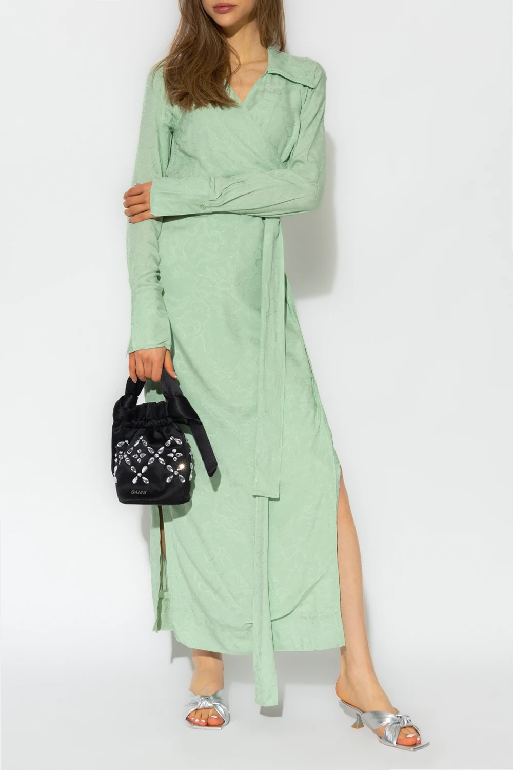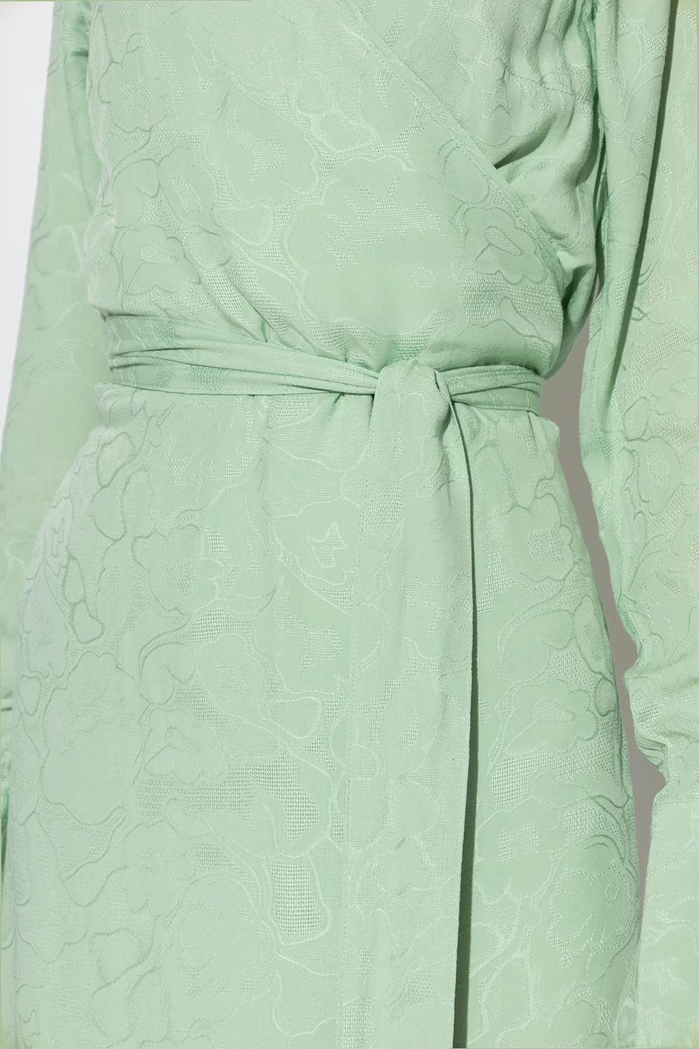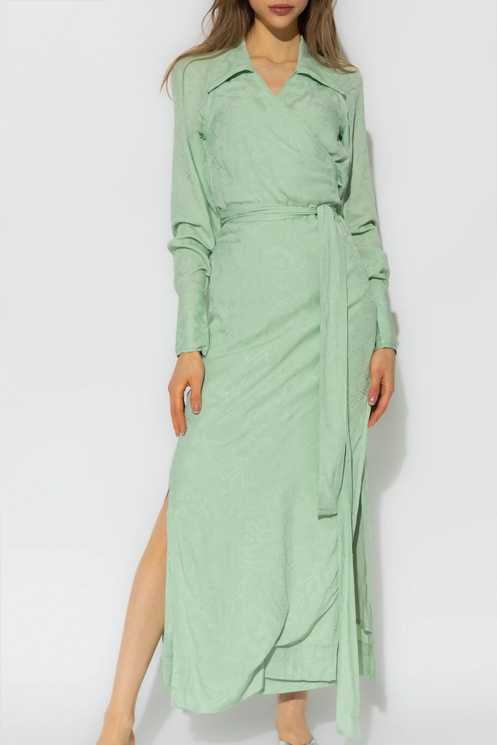 Green ‘Wander’ wrap dress from Holzweiler. Crafted with LENZING™ viscose, this style features a floral pattern and button closures on the cuffs.
