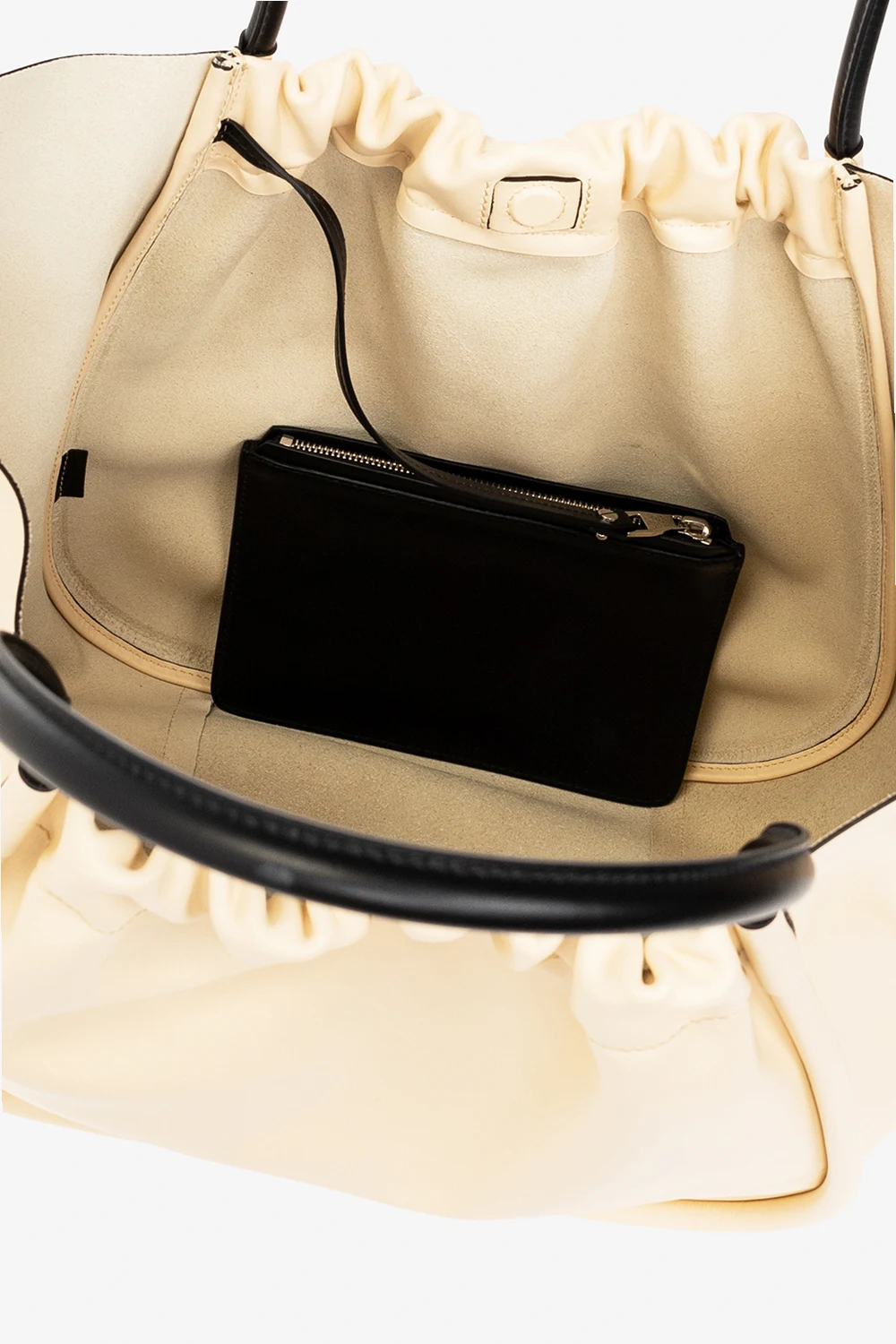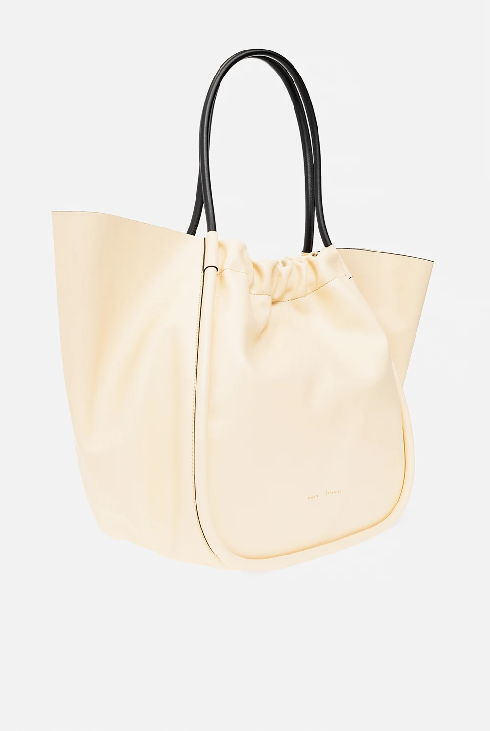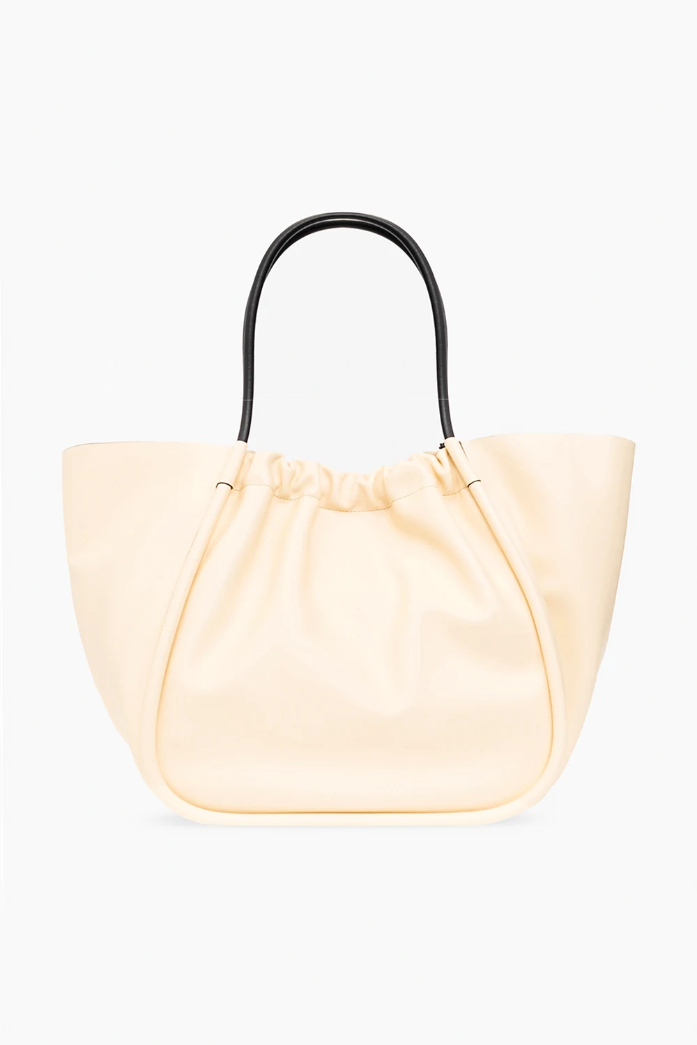 Light yellow ‘Ruched XL’ shopper bag from Proenza Schouler. Crafted from leather, this design secures with a magnetic fastener and showcases a gold-tone logo printed on the front, two half-round straps in black and one internal compartment with a removable black zip pouch.