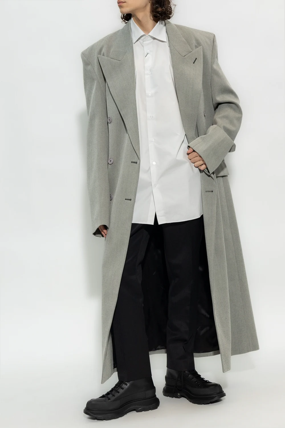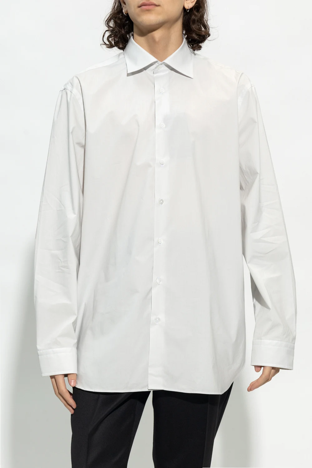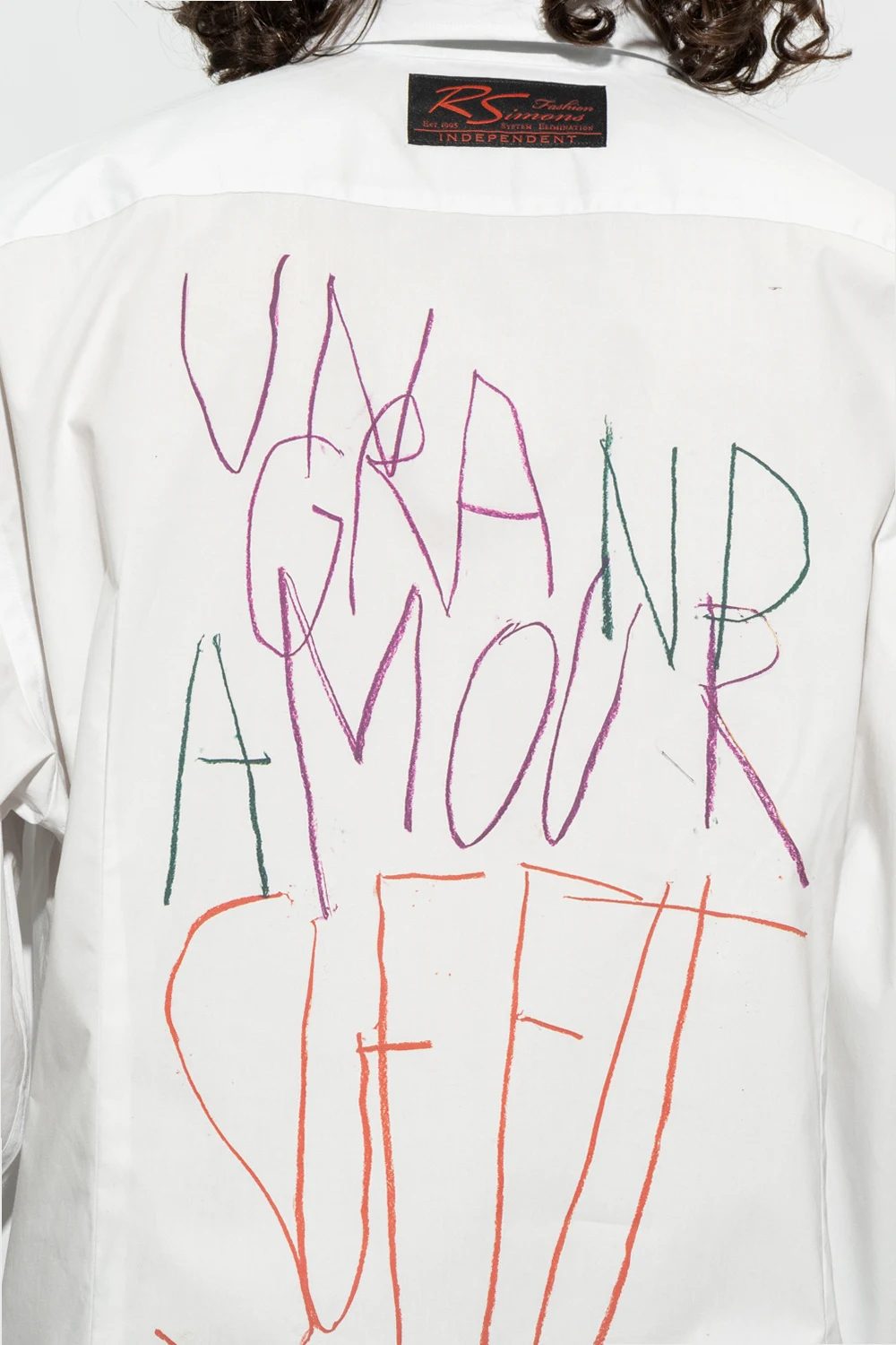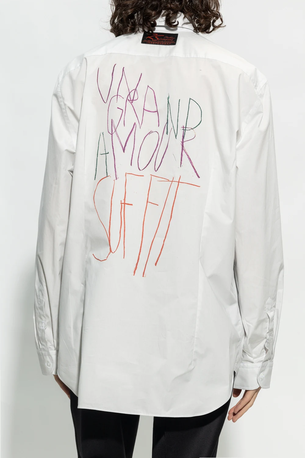 Light grey loose-fitting shirt from Raf Simons x Philippe Vandenberg. Made of cotton, this garment features button fastenings, multicolored prints with the artist’s works at the back, logo patch and long sleeves with buttoned cuffs.