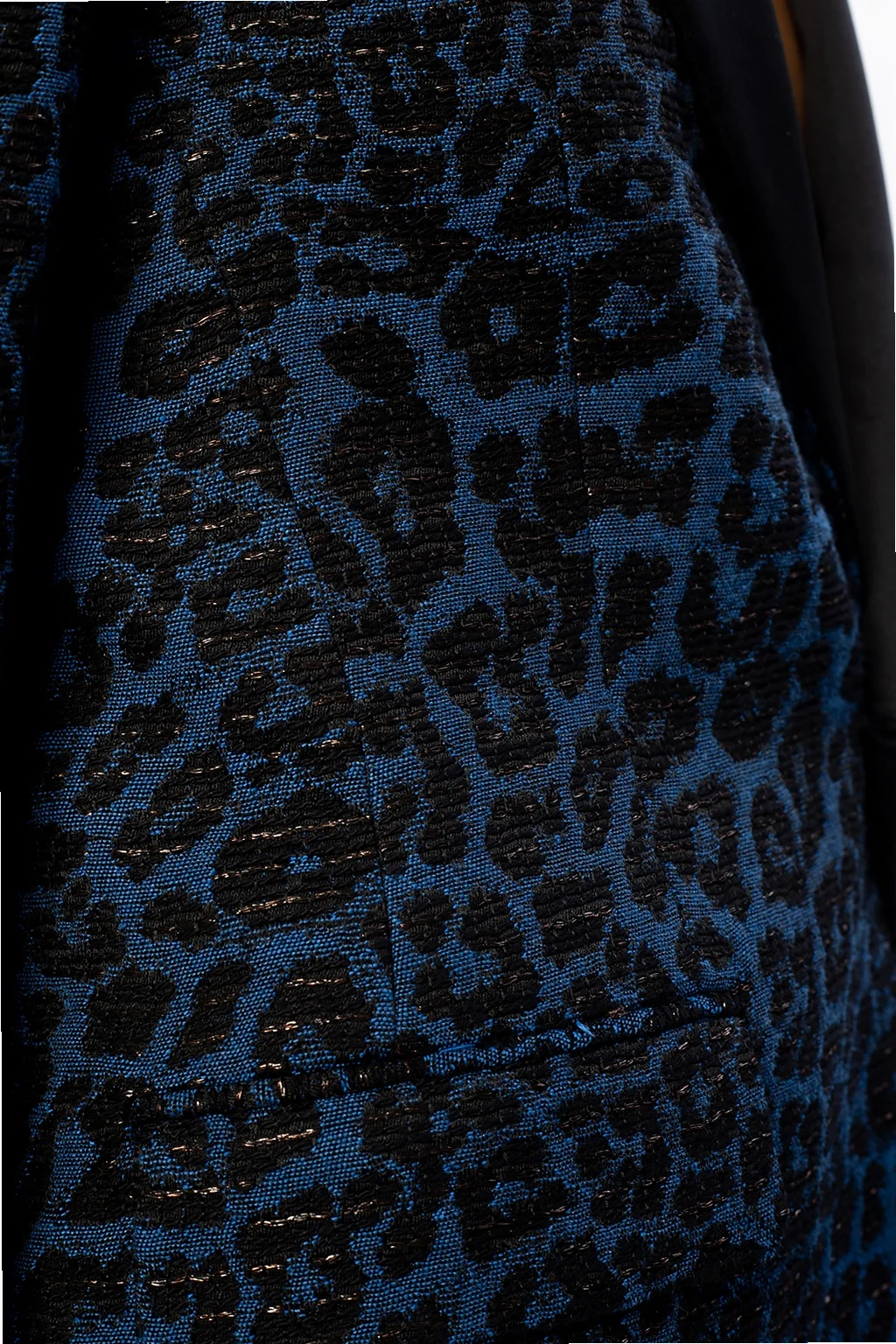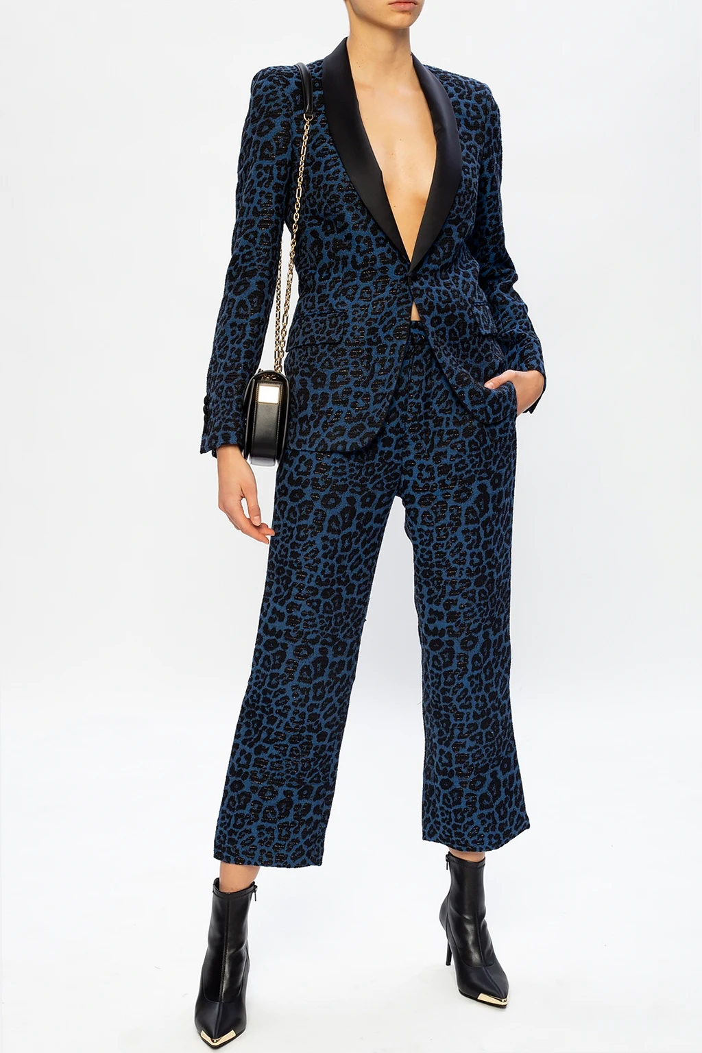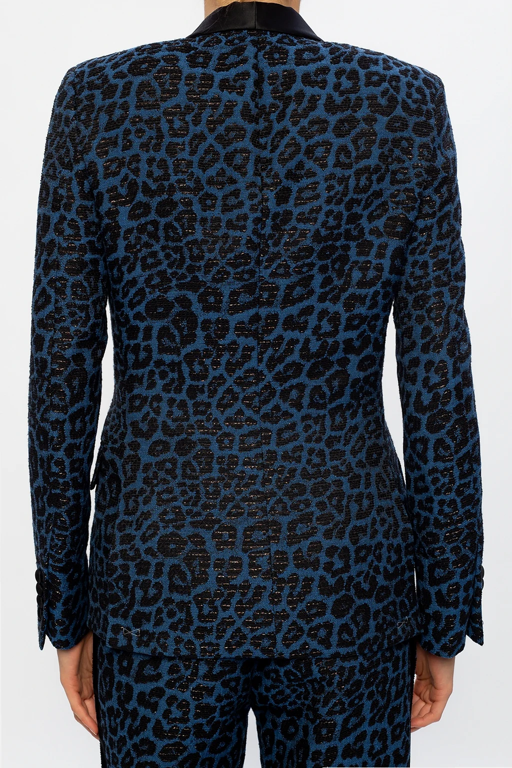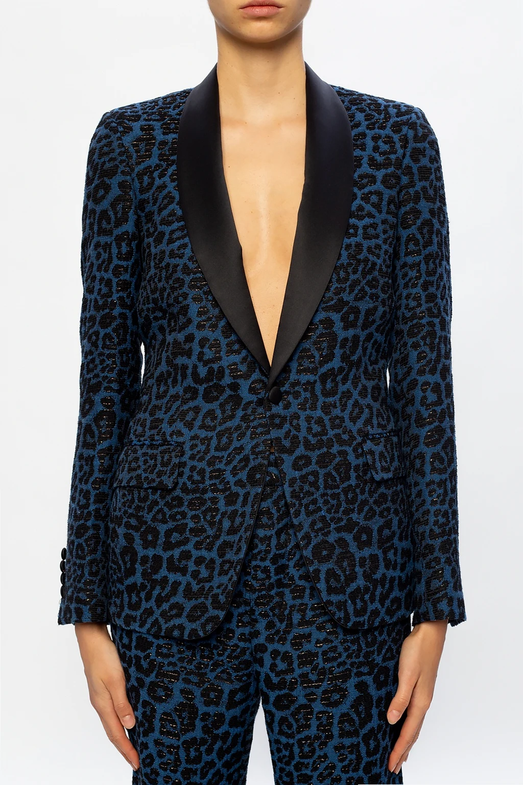 Navy blue and black blazer from R13. Inlaid with lurex yarn, this design showcases leopard motif and employs notched lapels and button closing.