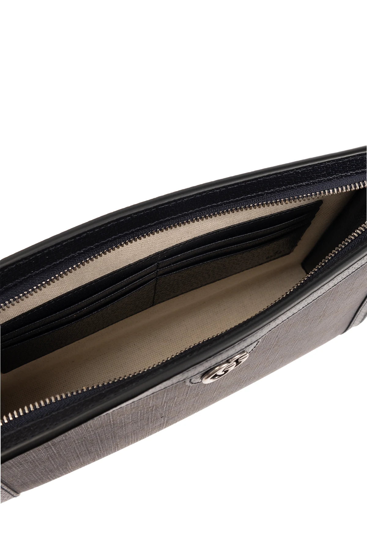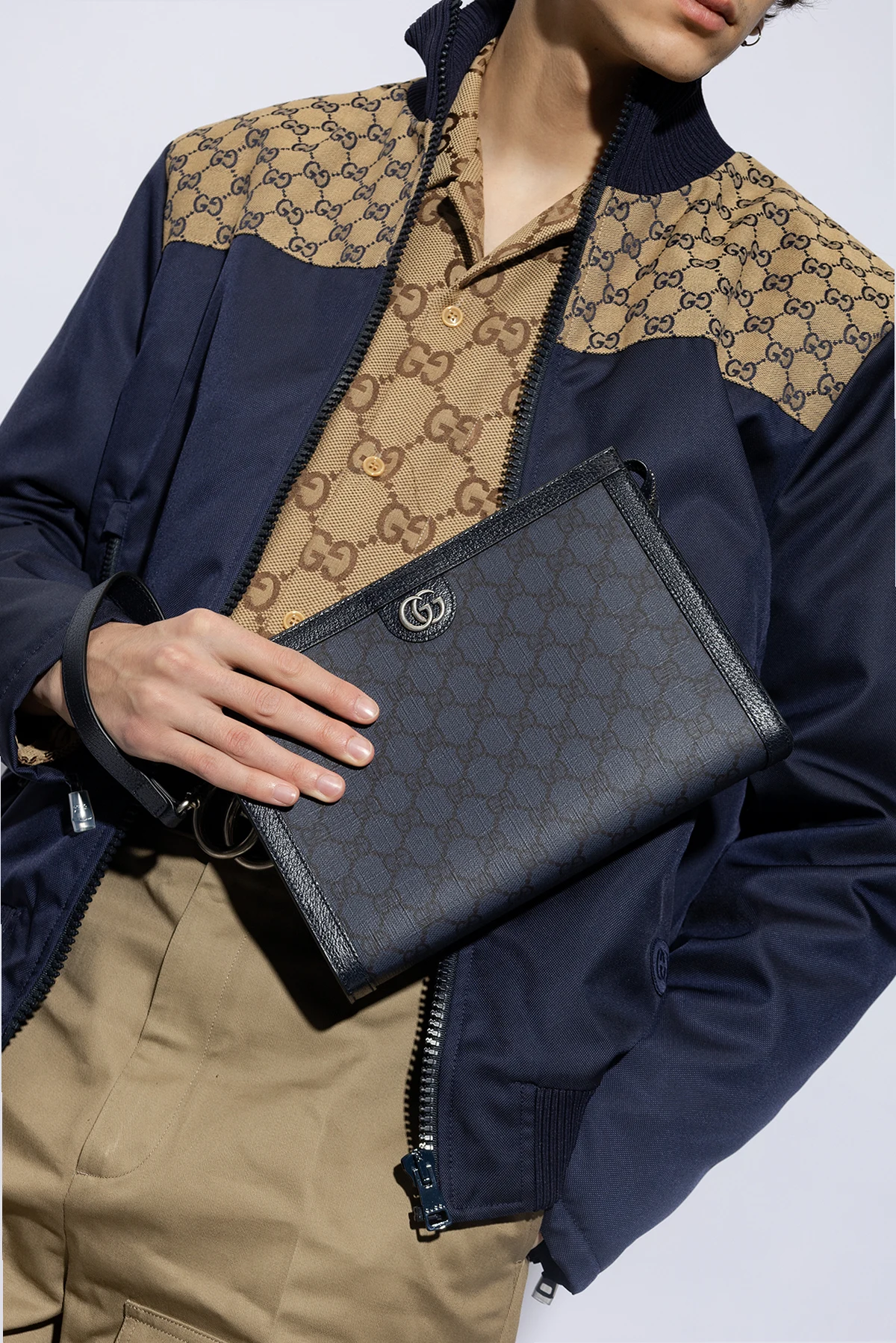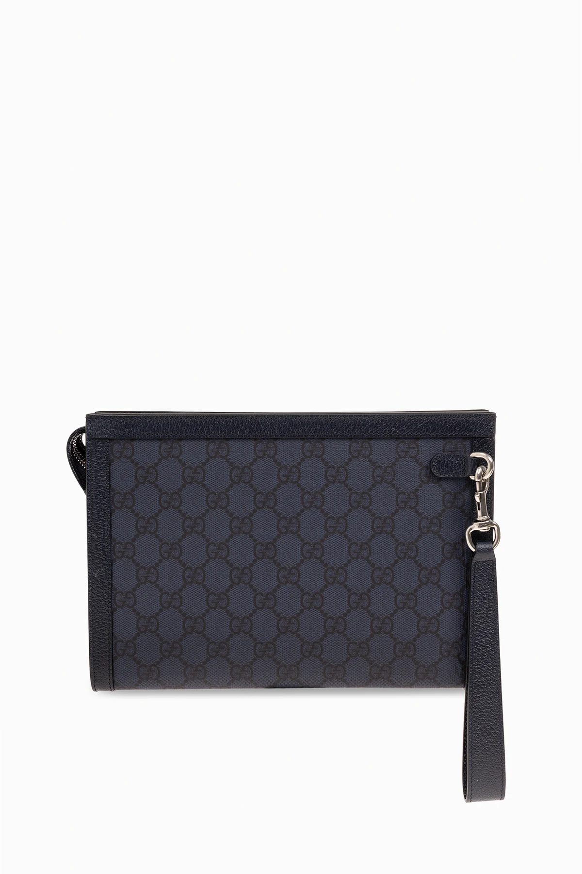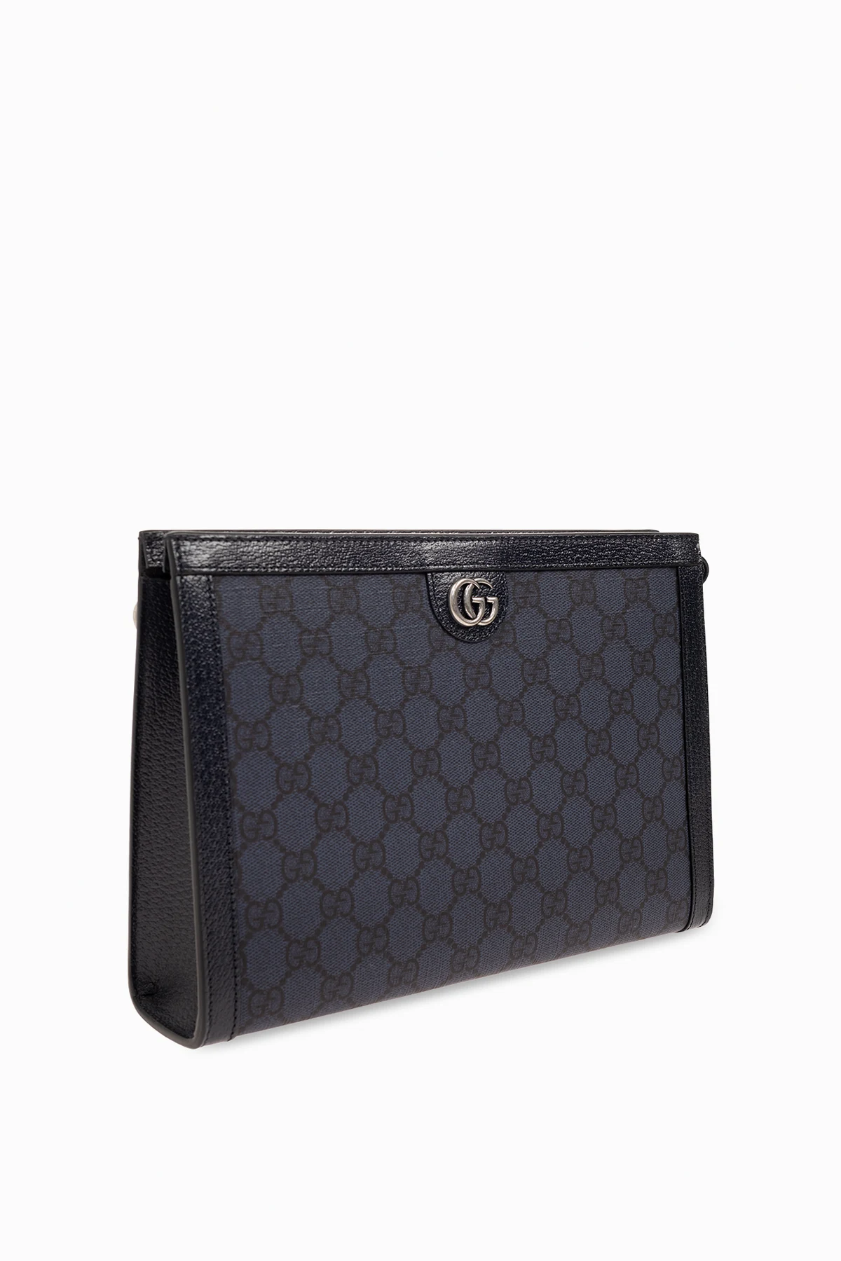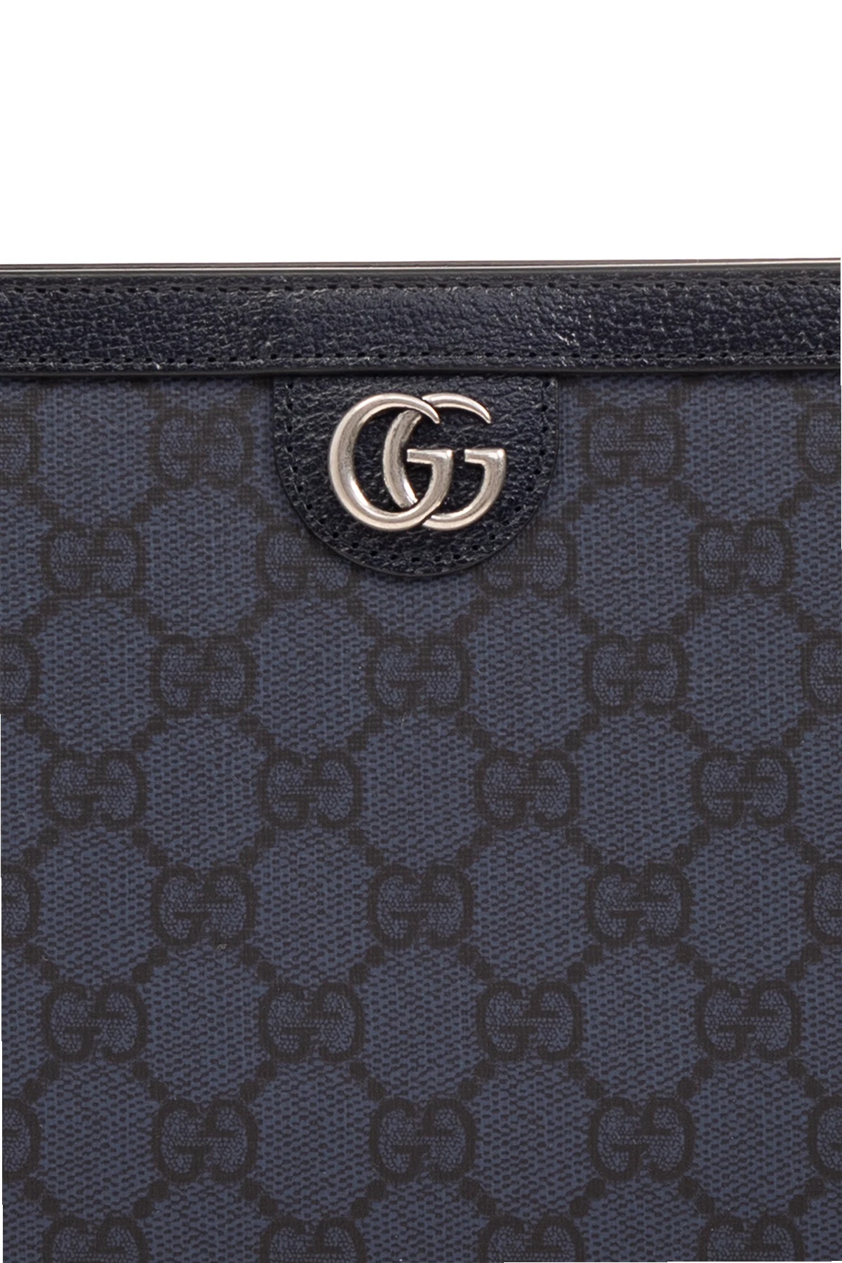 Navy blue and black ‘Ophidia’ handbag from Gucci. Made from ‘GG Supreme’ canvas and calf leather, this design fastens via a zip and showcases ‘Double G’ hardware on the front. It is complete with a detachable wrist strap, silver-tone metal elements and one internal compartment with six card slots.