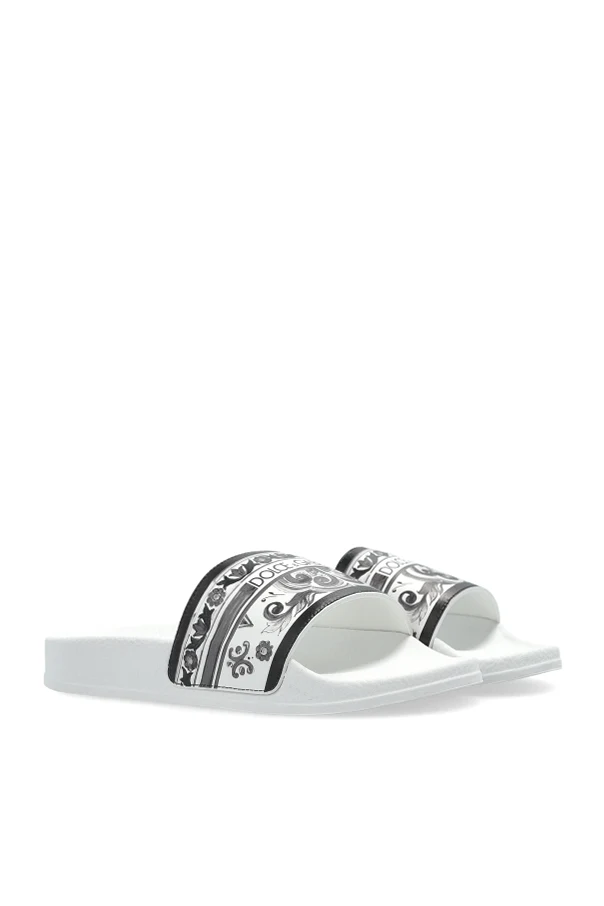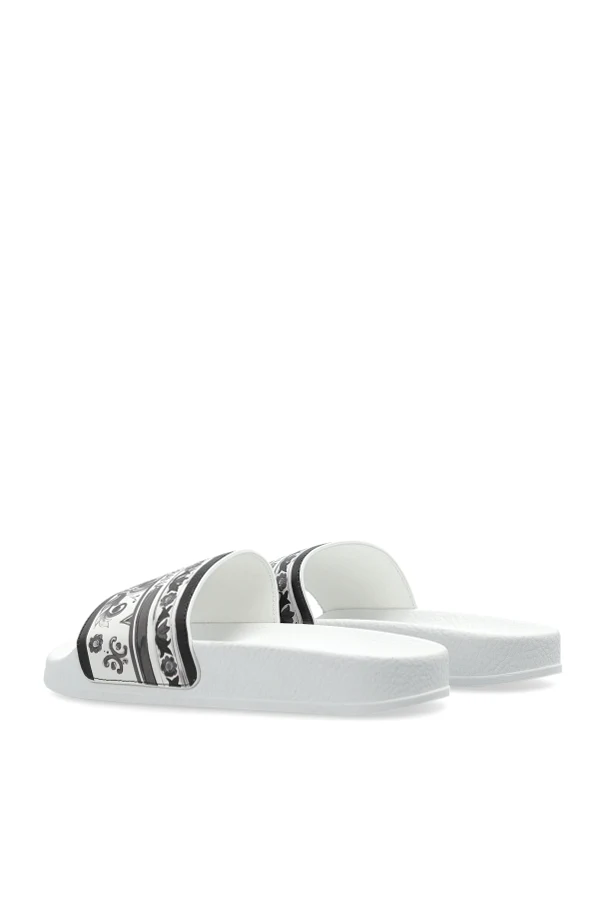 Der einzigartige Riemen ist mit ornamentalen Pflanzen- und geometrischen Motiven in Schwarz- und Grautönen verziert, während das zentral platzierte Dolce & Gabbana Logo alle Blicke auf sich zieht und den exklusiven Charakter des Produkts unterstreicht. Das strapazierfähige, hochwertige Kunststoffmaterial sorgt für Leichtigkeit und ermöglicht es, die Pantoletten in einwandfreier Sauberkeit zu halten.