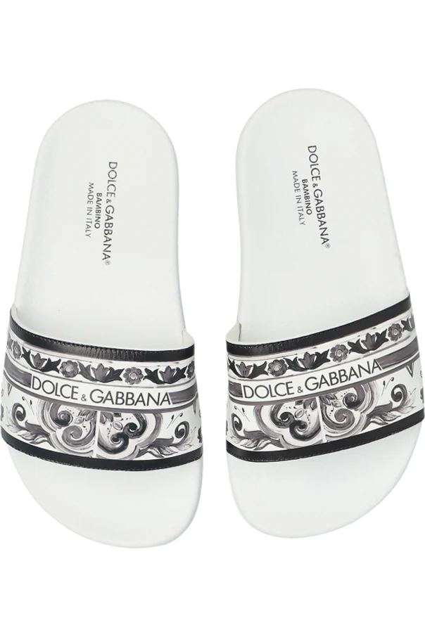 Pantoletten mit Logo der Marke Dolce & Gabbana Kids sind die Essenz jugendlicher Eleganz und italienischer Designkunst. Sie zeichnen sich durch eine anatomisch geformte Sohle sowie einen breiten Riemen über dem Spann aus, der nicht nur außergewöhnlichen Komfort garantiert, sondern auch mit raffinierter Ästhetik besticht. Die weiße Farbe verleiht dem Ganzen Frische und subtile Klassik.