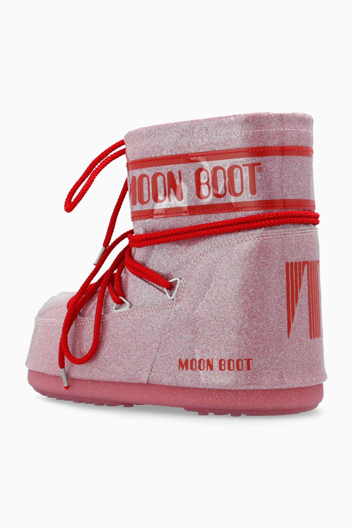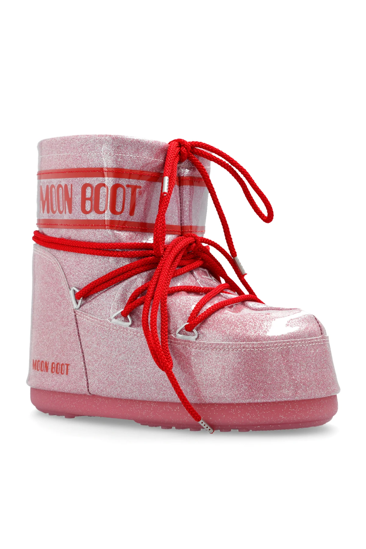Pink ‘Icon Low Glitter’ snow boots from Moon Boot. Made of glittery synthetic material with waterproof properties, this lace-up model sits on a pink thermoplastic rubber tread sole and showcases a drawstring upper decorated with red logo prints.