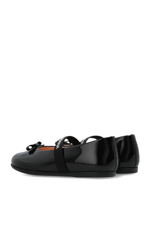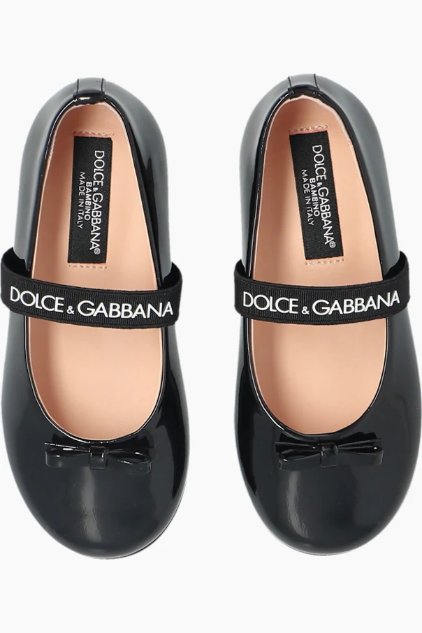 Ballerinas mit Logo vom renommierten Modehaus Dolce & Gabbana Kids sind eine außergewöhnliche Interpretation zeitloser Eleganz für die Jüngsten. Das Modell besticht durch eine klassische Silhouette mit abgerundeter Spitze, einer dezenten schwarzen Schleife und einem bequemen Riemen über dem Spann, der stolz den kontrastierenden Logoprint präsentiert.