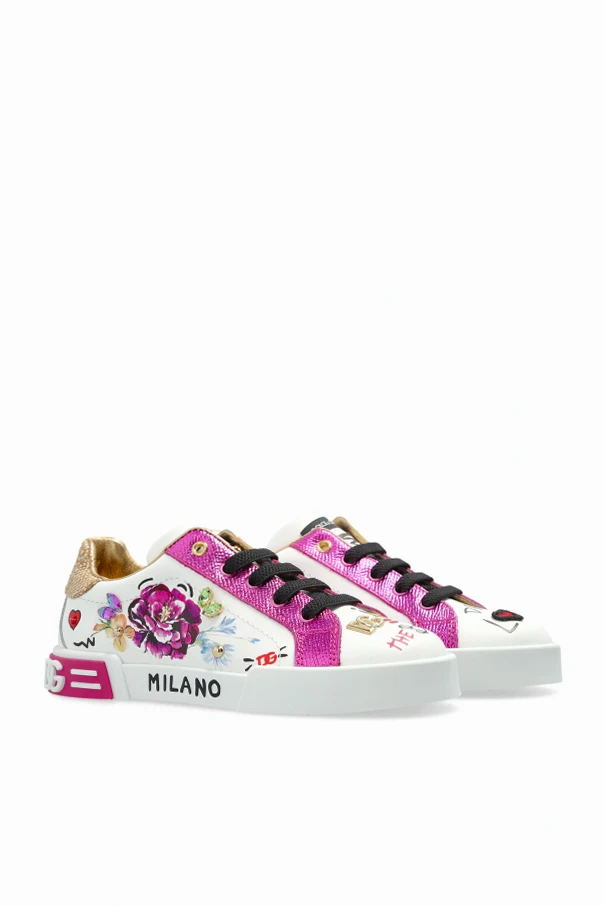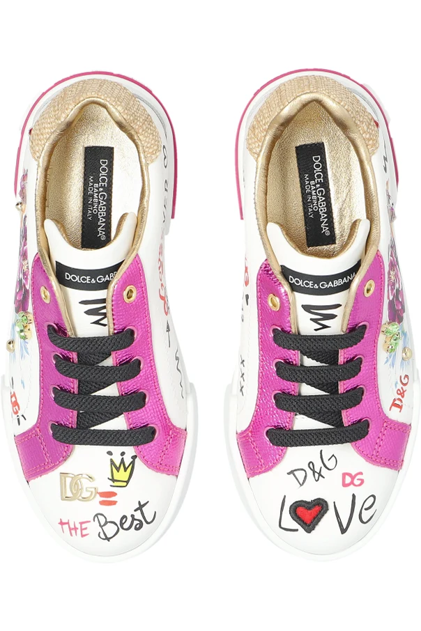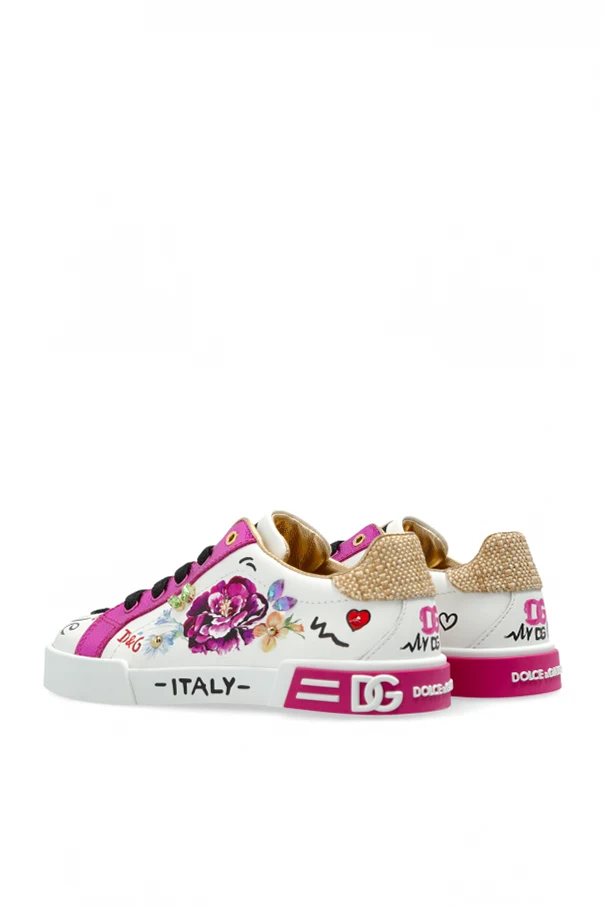 Kindersneaker von Dolce & Gabbana Kids verkörpern die Quintessenz italienischer Eleganz, inspiriert vom mediterranen Erbe und meisterhafter Designkunst. Die klassische Low-Profile-Silhouette der Sneaker wurde mit einem weißen Obermaterial aus ausgewähltem Glattleder veredelt, das mit extravaganten, farbenfrohen Aufdrucken von Blumen, Schmetterlingen und künstlerischen Symbolen versehen ist.