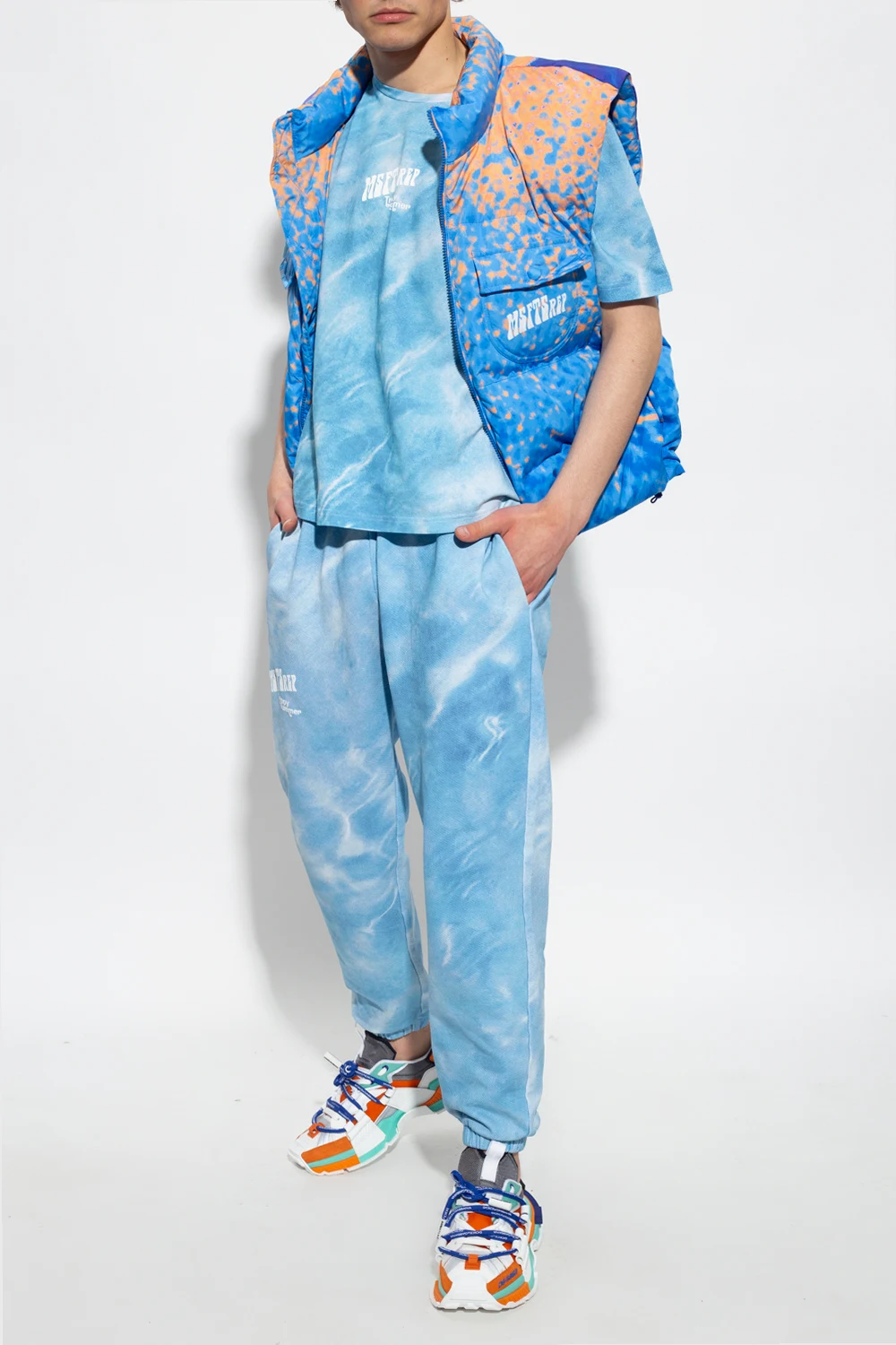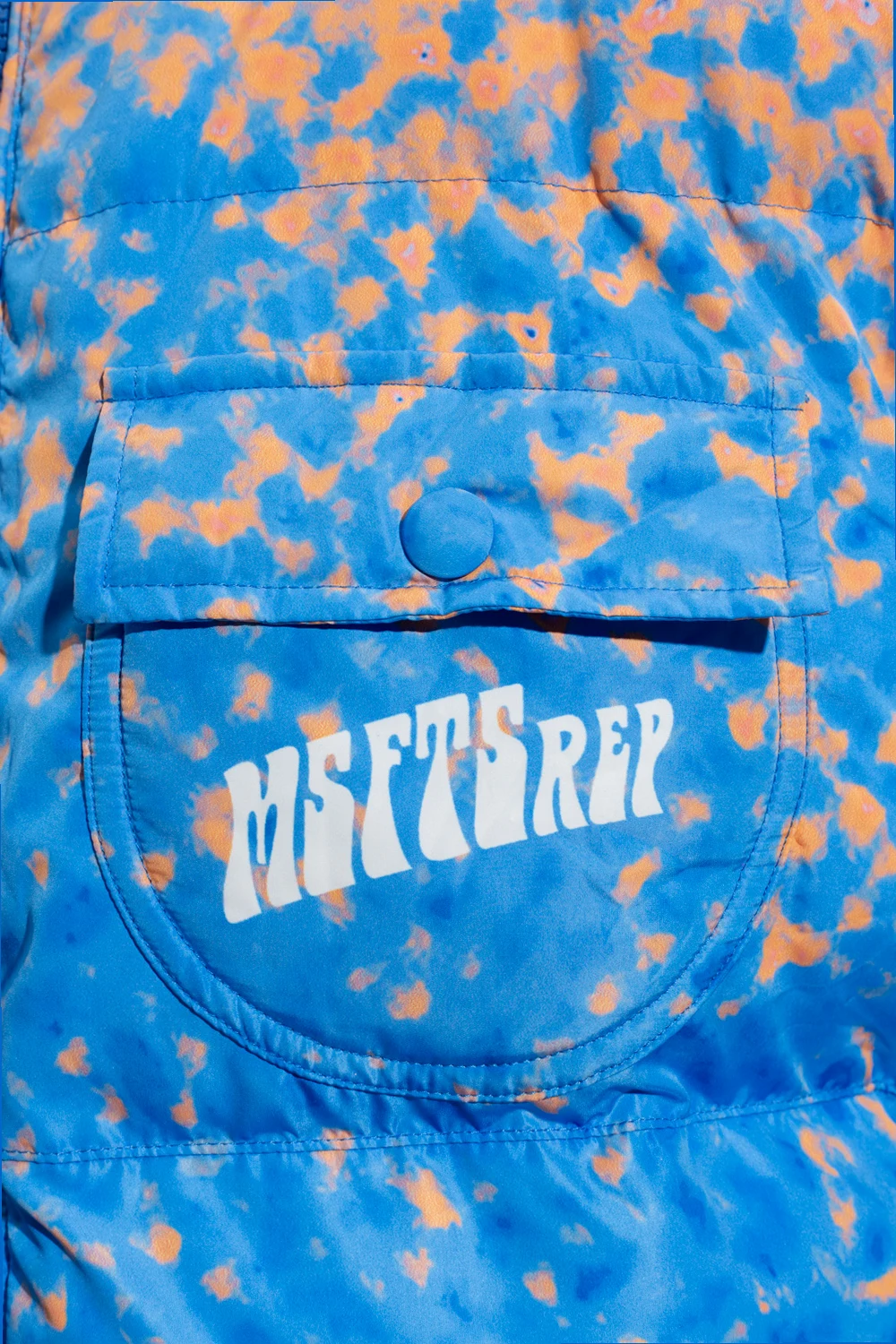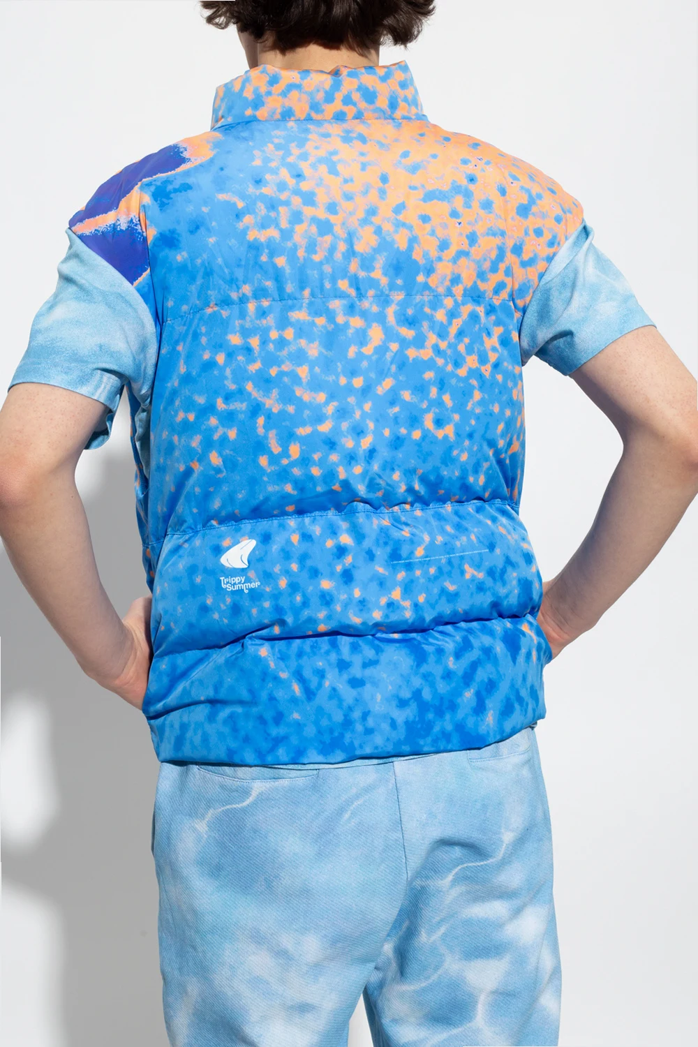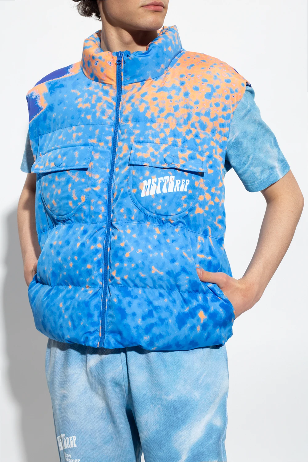 Blue and orange quilted vest with a stand-up collar from MSFTSrep, the ‘Trippy Summer’. Fastened with zip, this garment features a mutlicolored pattern, whtie logo, two side pockets, two snap-fastened flap pockets and drawstring hem.