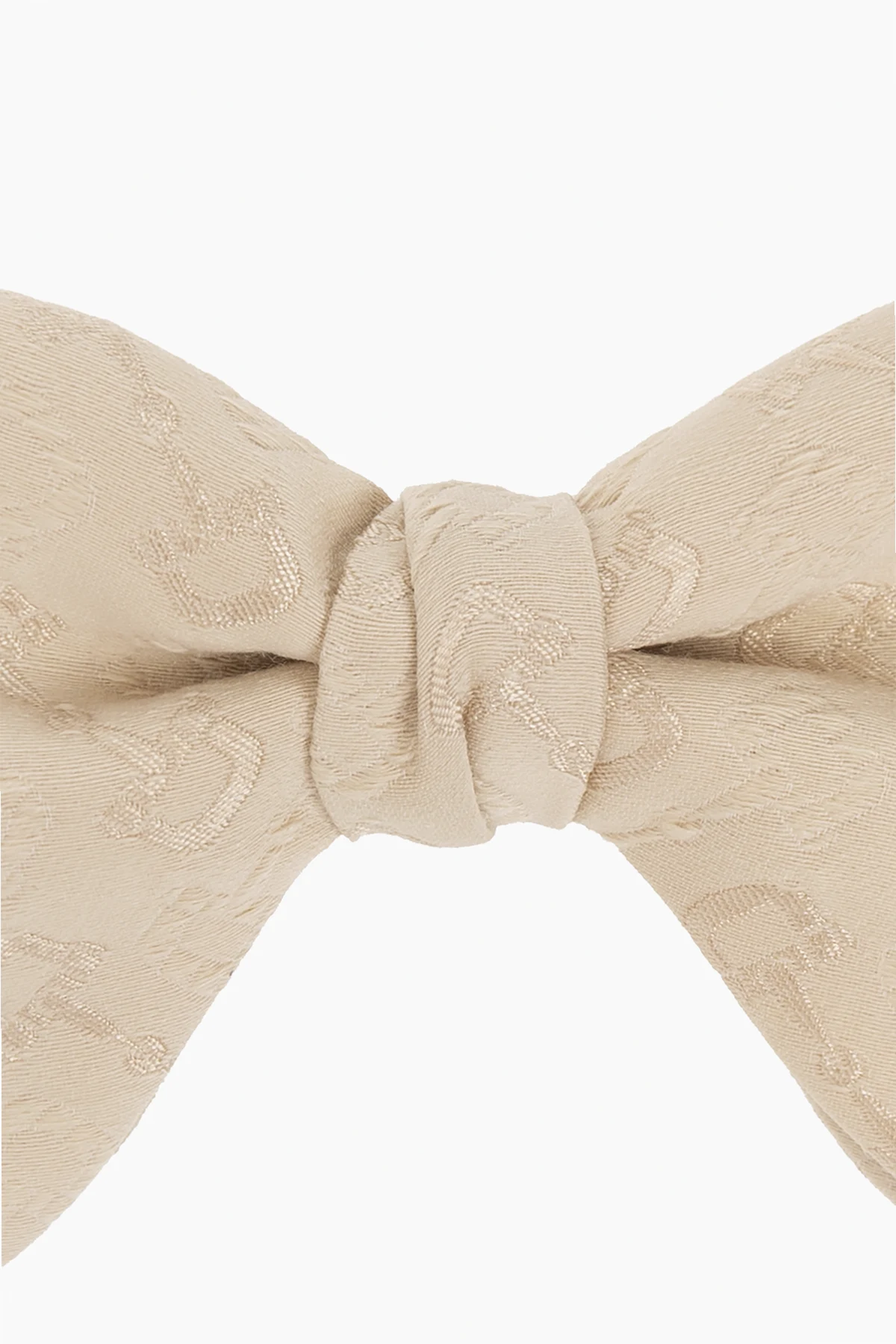 Beige bow tie from Gucci. Made from a blend of wool and silk, this item features the brand's signature horsebit motif and fastens with a hook.