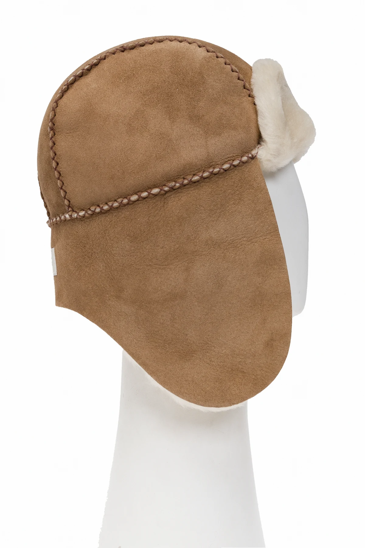Die Mütze zeichnet sich durch ein flauschiges Innenfutter aus cremefarbenem Pelz aus, das nicht nur Wärme, sondern auch Gemütlichkeit garantiert. Im Fliegermütze-Stil mit verlängerten Seiten, die die Ohren schützen, begeistert sie mit dekorativen Nähten, die über die gesamte Oberfläche verlaufen.