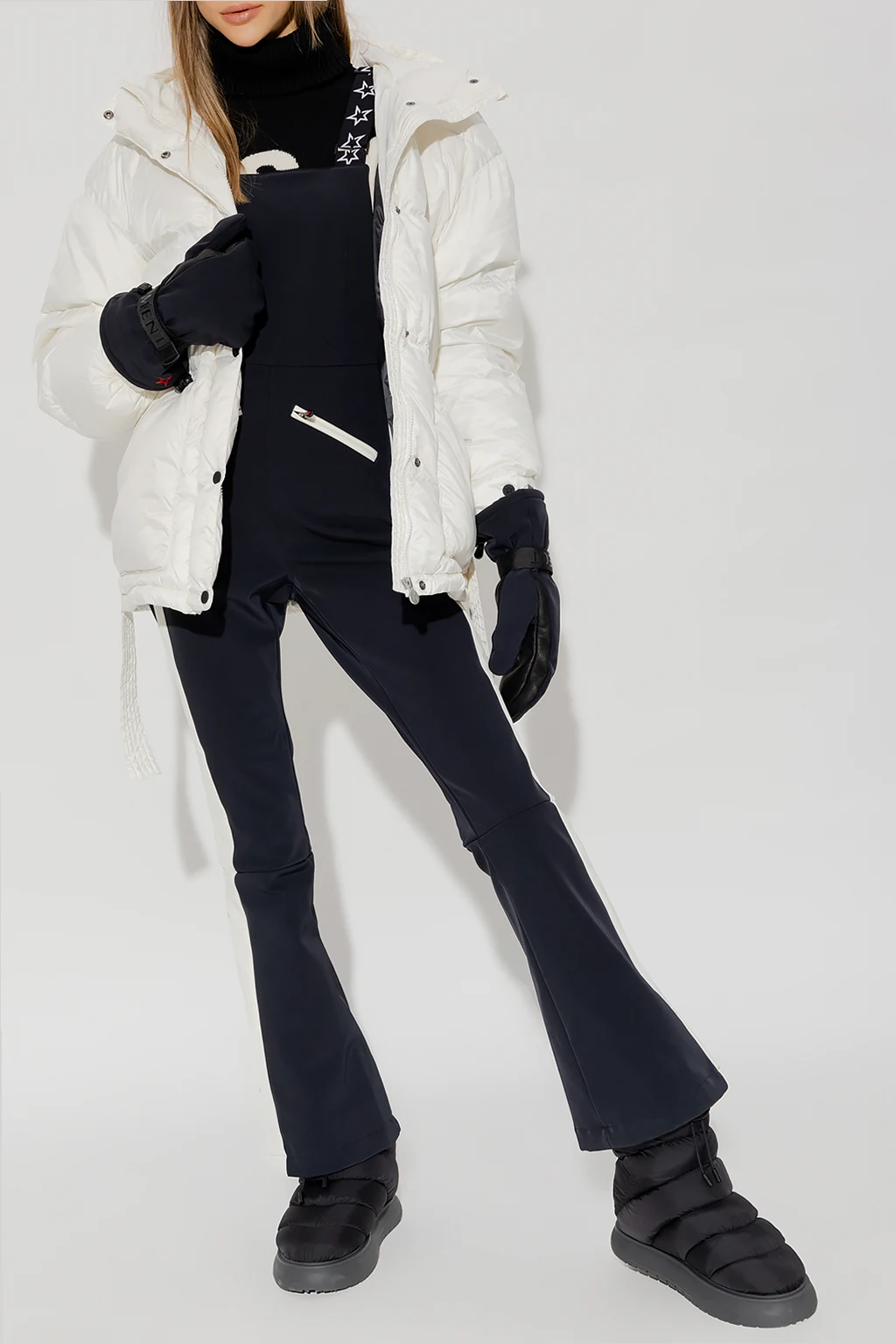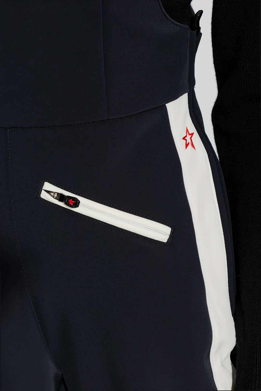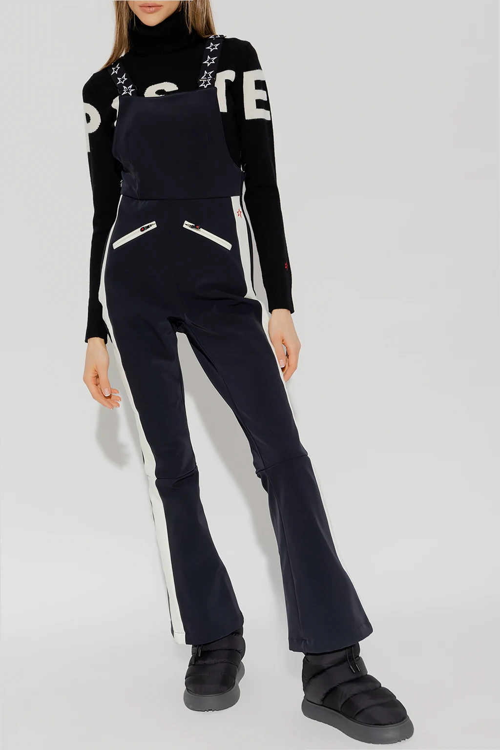 Black and white ‘Thora Solapette’ ski suit from Perfect Moment. Made of breathable Toray Dermizax™ stretch-shell, this design features zips on the sides, decorative stripes, patch with the brand’s signature star motif in red at the back, adjustable shoulder straps, two front zip pockets, fleece lining and long, two-layered, flared legs with a zipped outer layer and elasticated fleece lining with snap fastenings.