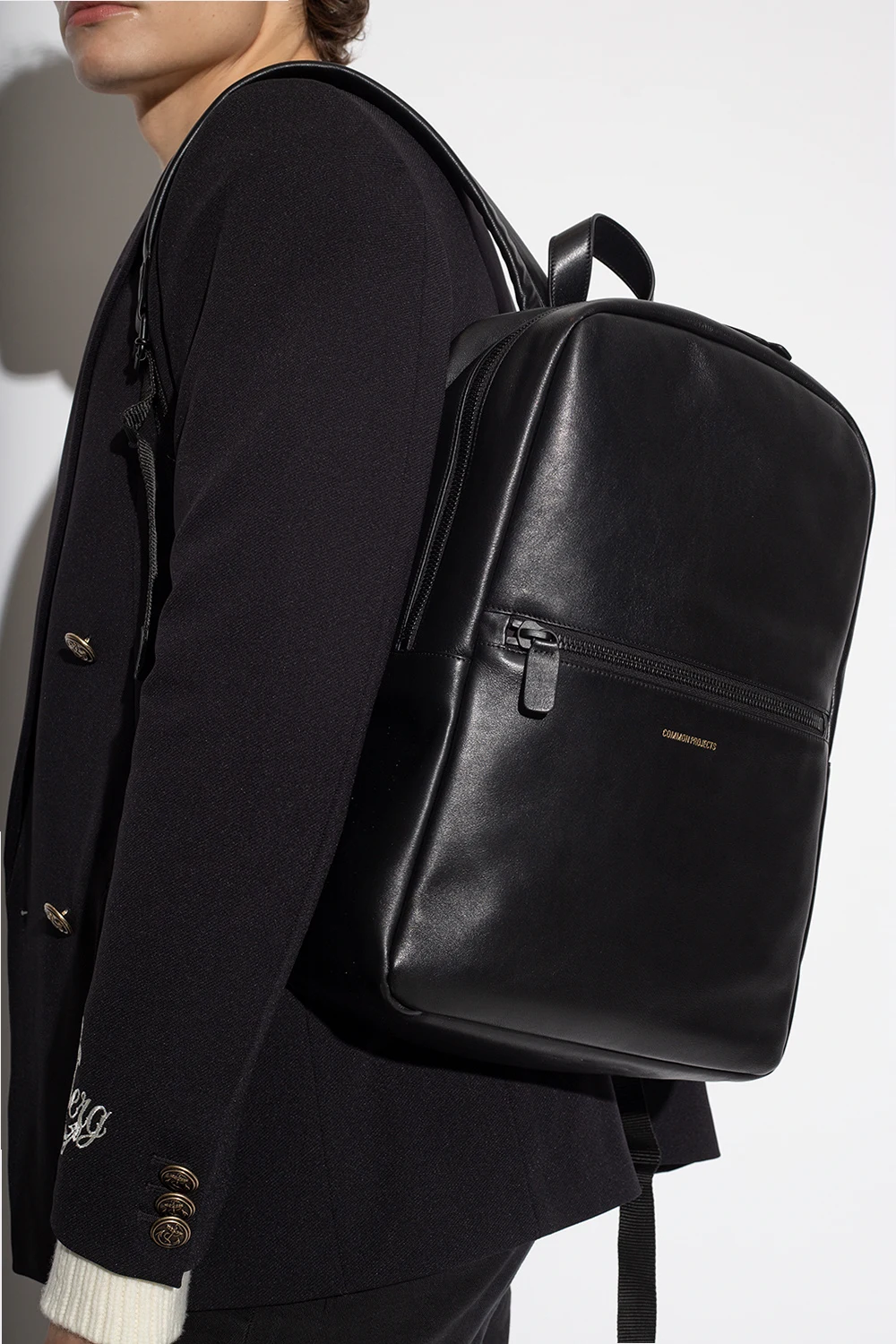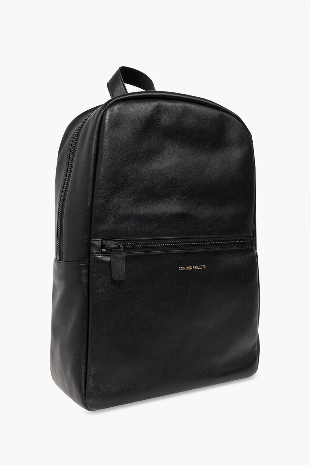 Black backpack from Common Projects. Crafted from leather, this design secures with a two-way zipper and showcases a printed gold-tone logo accompanied by a zip pocket on the front, a top handle, adjustable shoulder straps and one internal compartment with two slip pockets and one zip pocket.