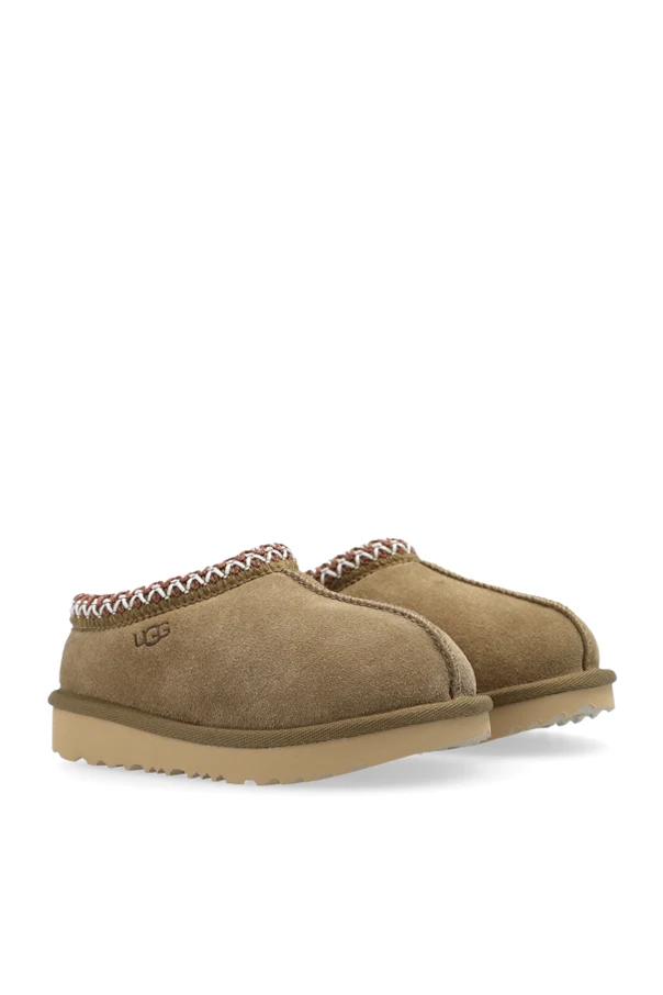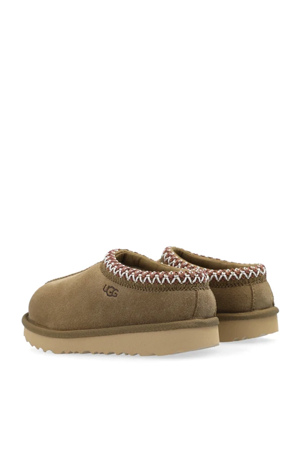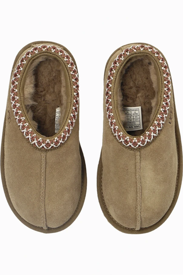 Hergestellt aus hochwertigem braunem Wildleder, bestechen die 'Tasman II' Schuhe durch ihr gemütliches Erscheinungsbild. Das Innere ist mit weichem, flauschigem Material ausgekleidet, wahrscheinlich Schafwolle, das unvergleichliche Wärme und Bequemlichkeit bietet. Der dekorative Rand um die Fußöffnung, gefertigt aus einem Geflecht in den Farben Braun, Weiß und Rot, verleiht ihnen einen einzigartigen Charakter.