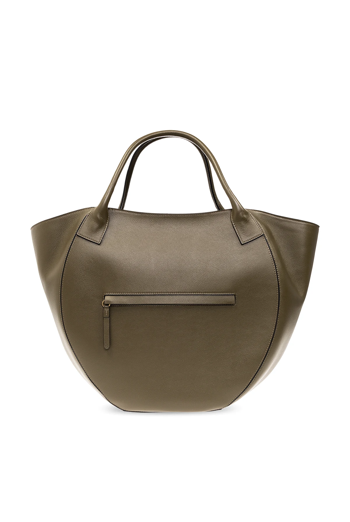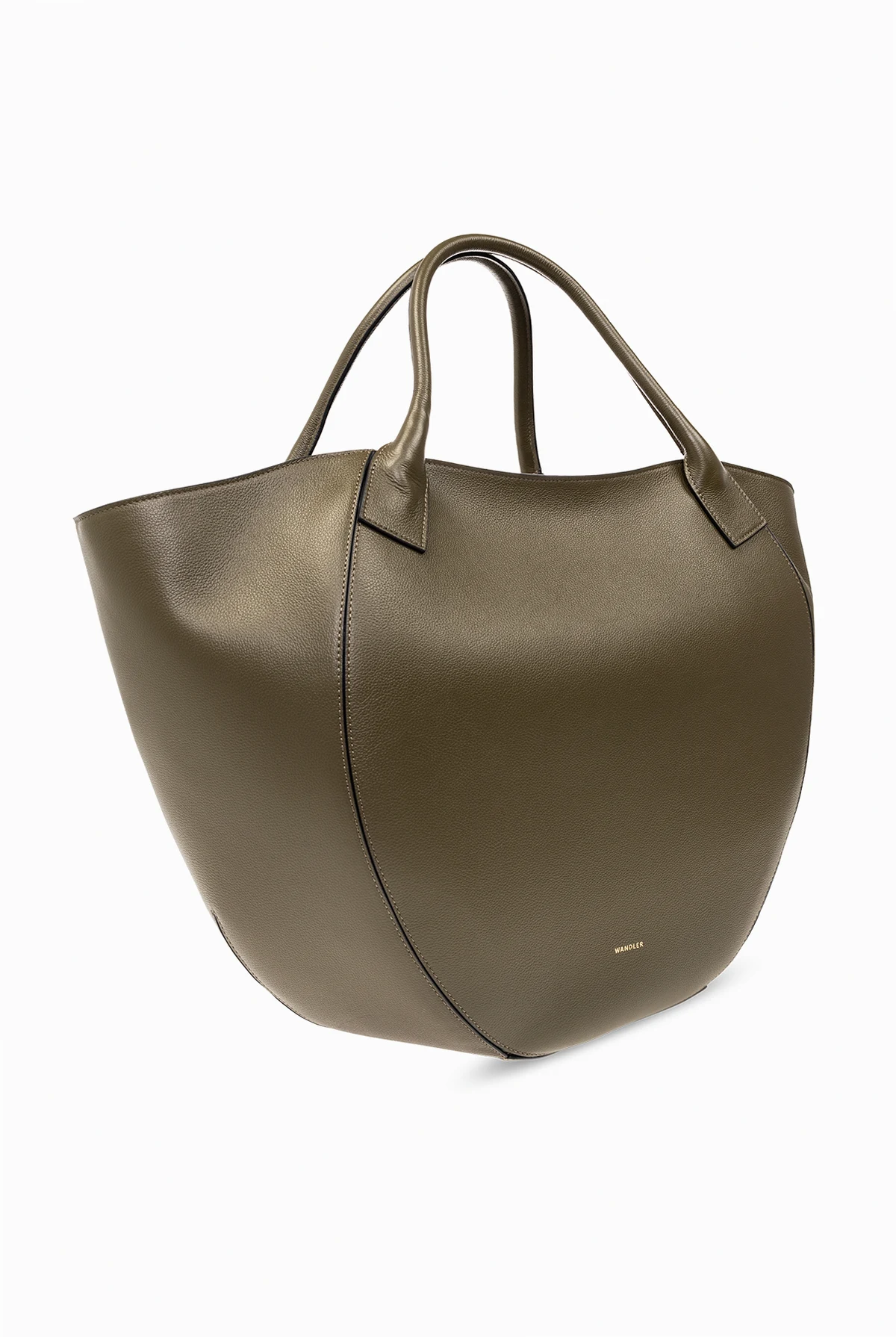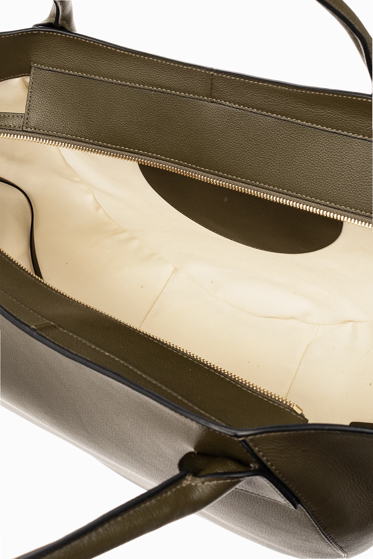 Dark green ‘Mia’ shopper bag from Wandler. Made from calf leather with the LWG certificate, this design cinches closed with drawstrings and showcases a printed logo. It is complete with a zip fastening, one back zip pocket, two half-round handles, gold-tone metal hardware and one internal compartment with a slip pocket. Comes with a detachable shoulder strap.