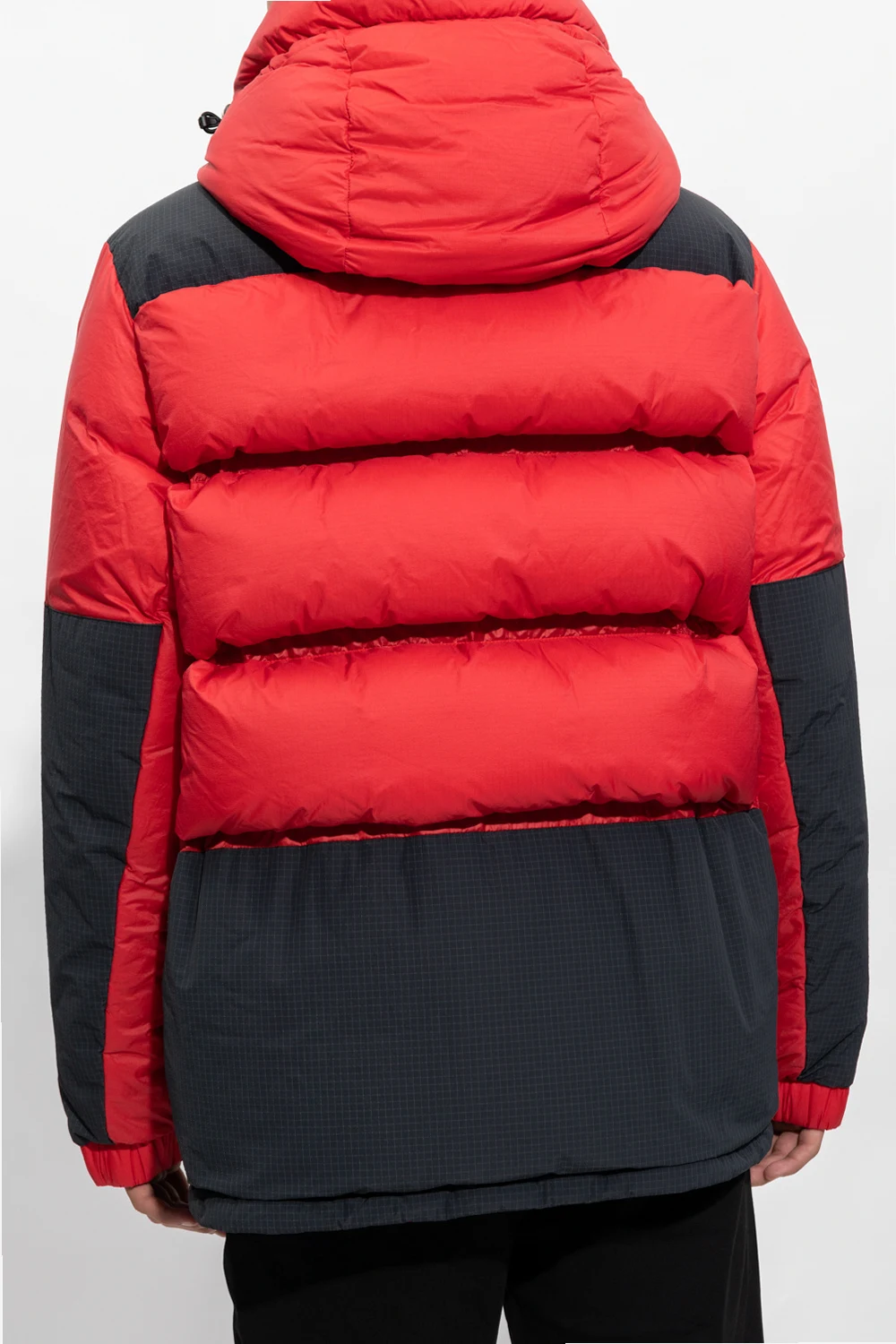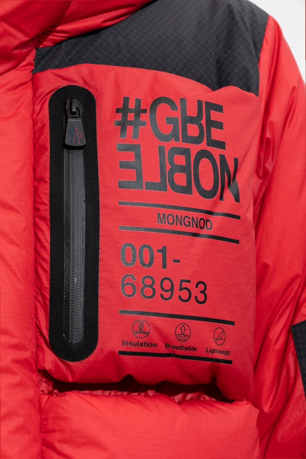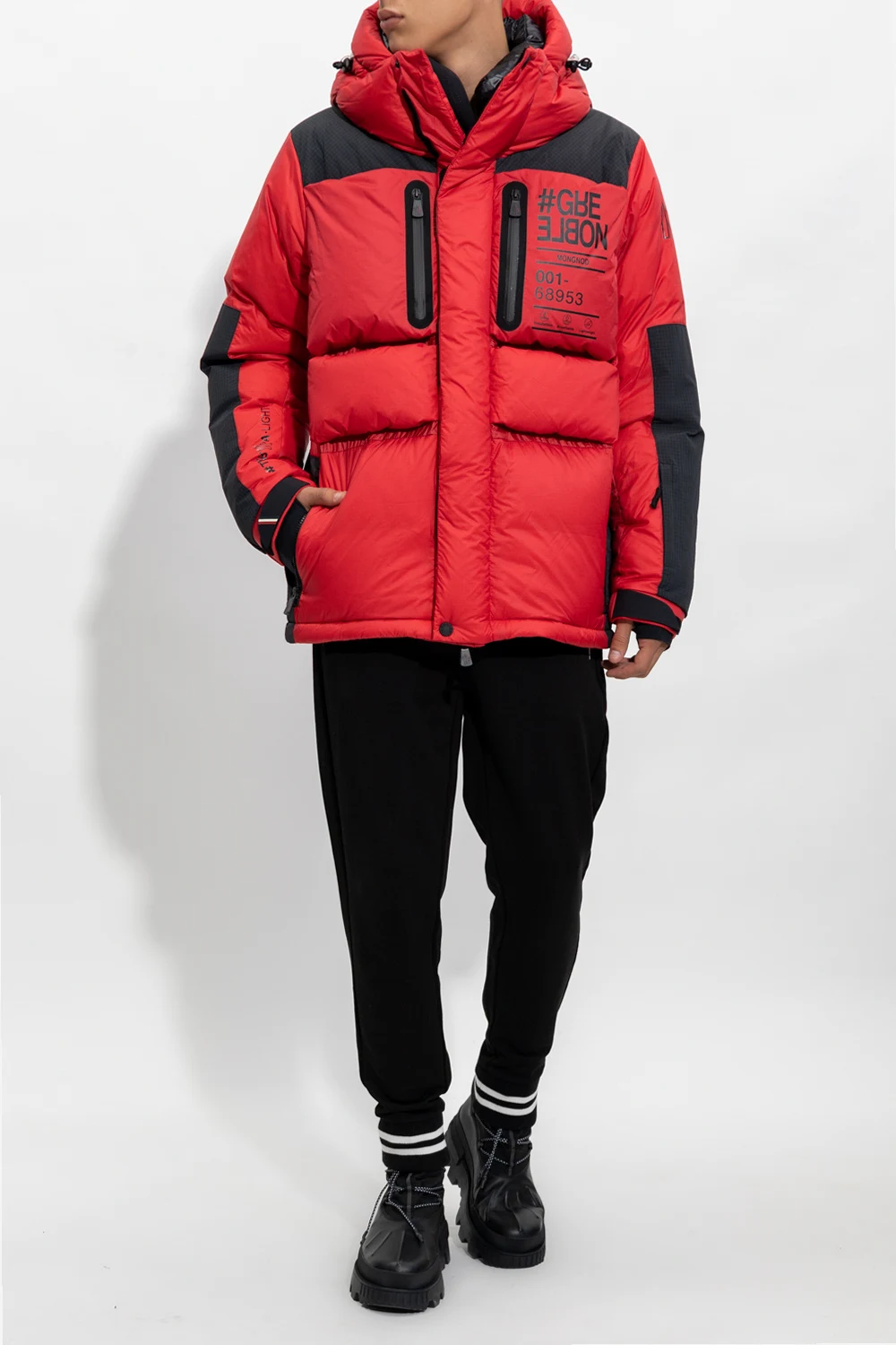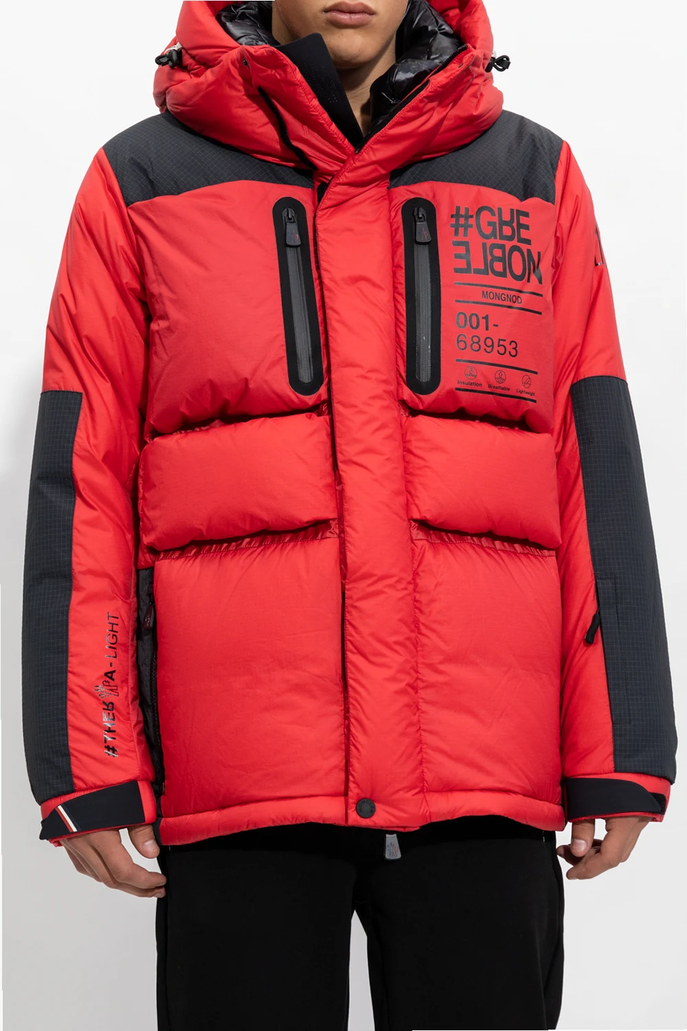 Red and black ‘Mongnod’ down jacket from Moncler Grenoble. Embellished with a black graphic print, this style secures with a two-way zipper and snaps and features a drawcord-adjustable hood and hem, four zip pockets and long sleeves with elasticated cuffs and thumbholes.