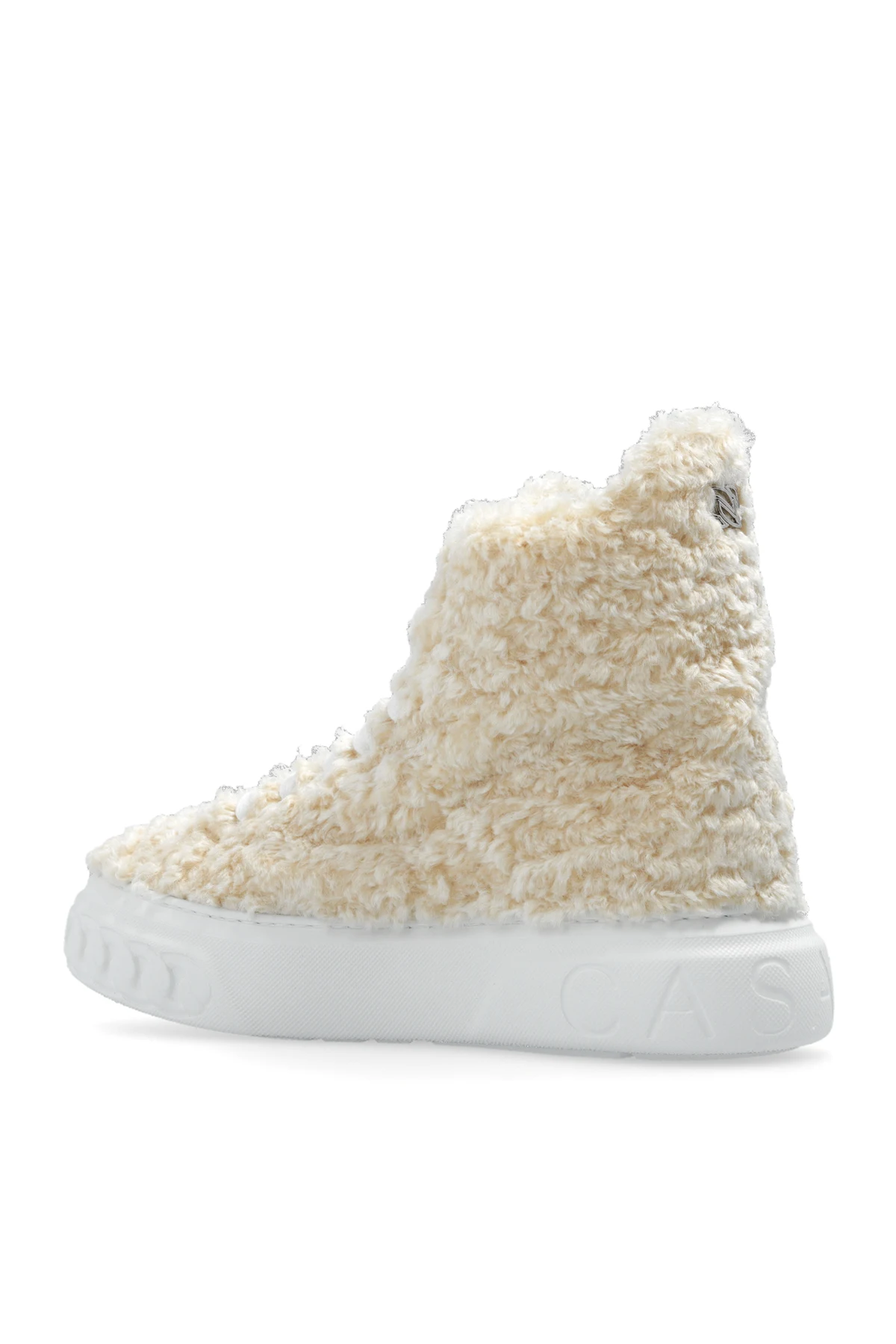 Beige ‘Off-Road’ high-top sneakers from Casadei. Crafted from faux-fur, this lace-up model sits on a white rubber sole and showcases a silver-tone metal logo plaque at the back.