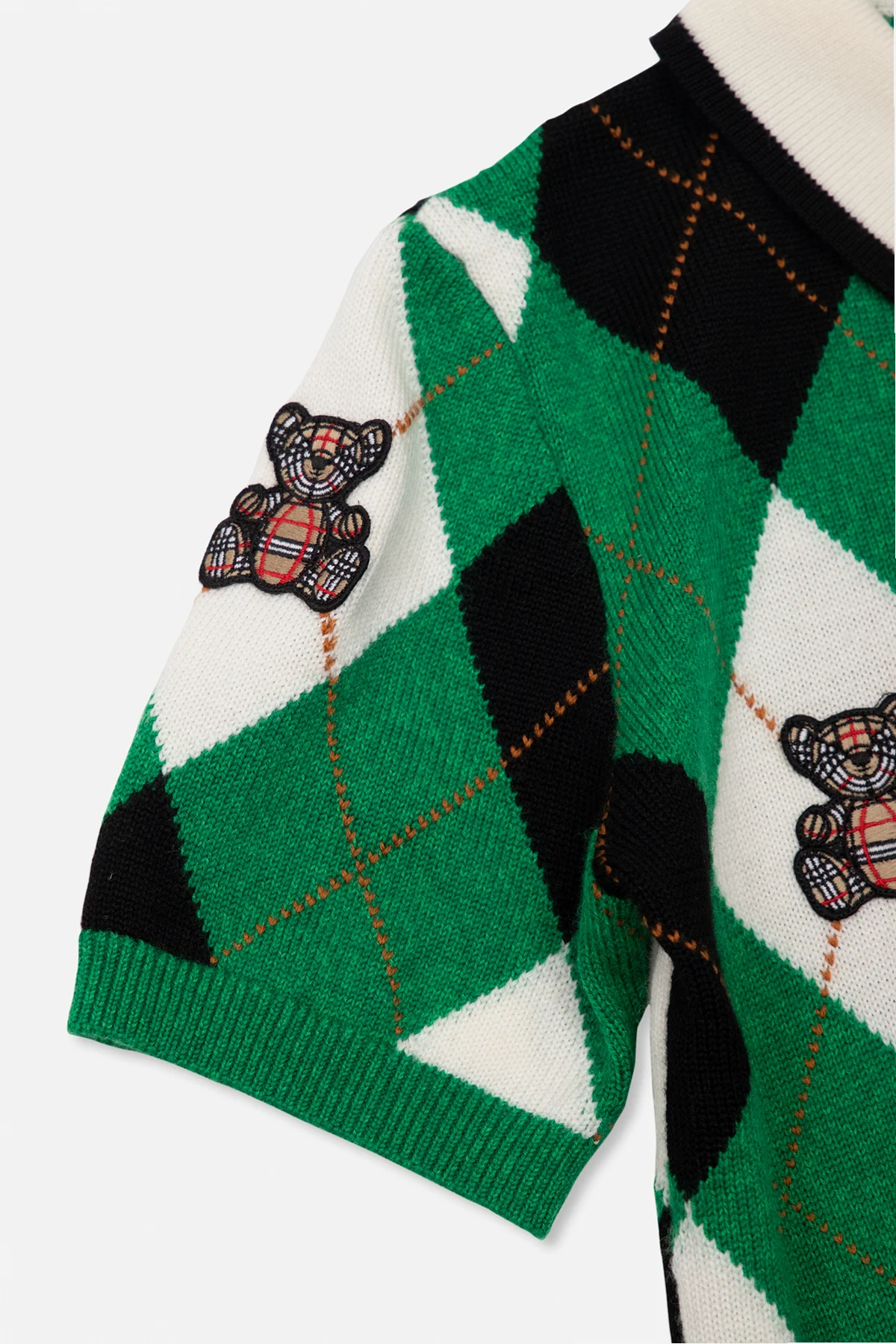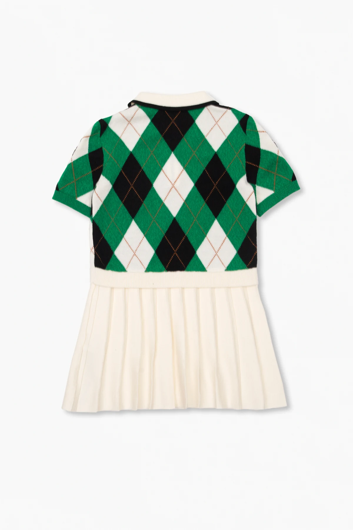 Green, black and cream dress from Burberry Kids. Crafted from a wool and cashmere blend, this design features button fastenings, a geometric pattern, patches and short sleeves with ribbed cuffs.