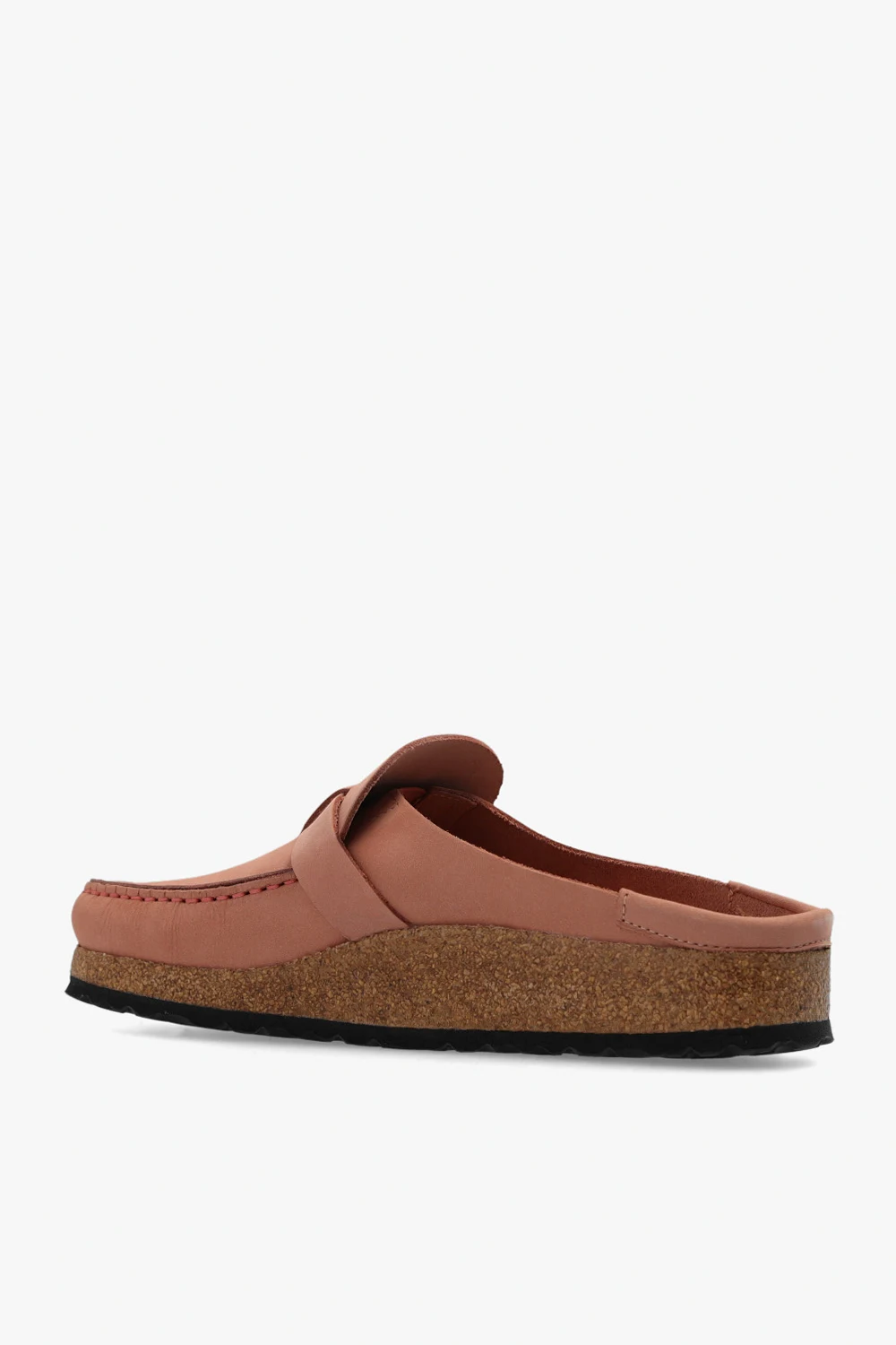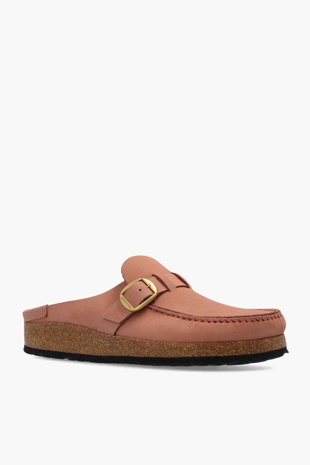 Pink and beige ‘Buckley’ slides from Birkenstock. Made of nubuck, this narrow width pair features a strap with a logo-embossed buckle in gold-tone and sole in brown and dark brown made of natural cork and EVA foam.