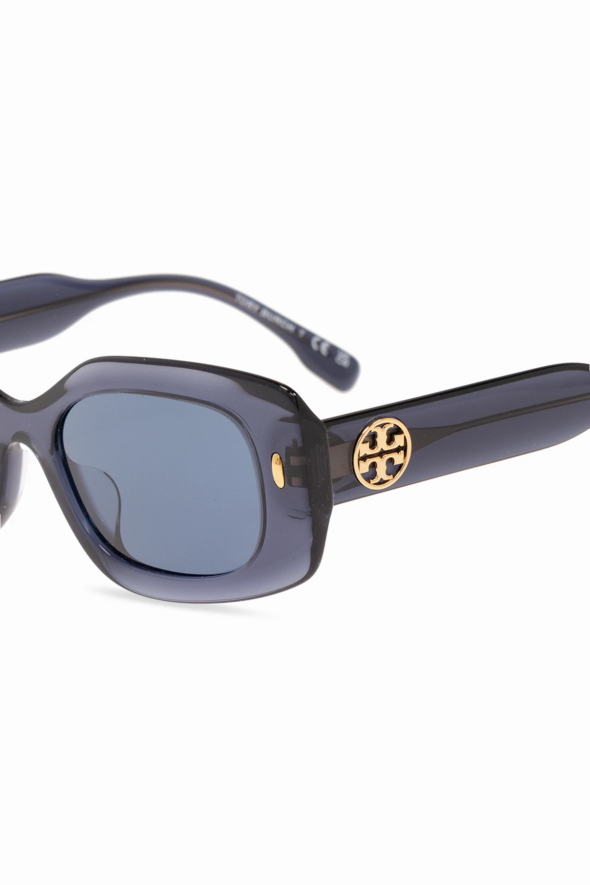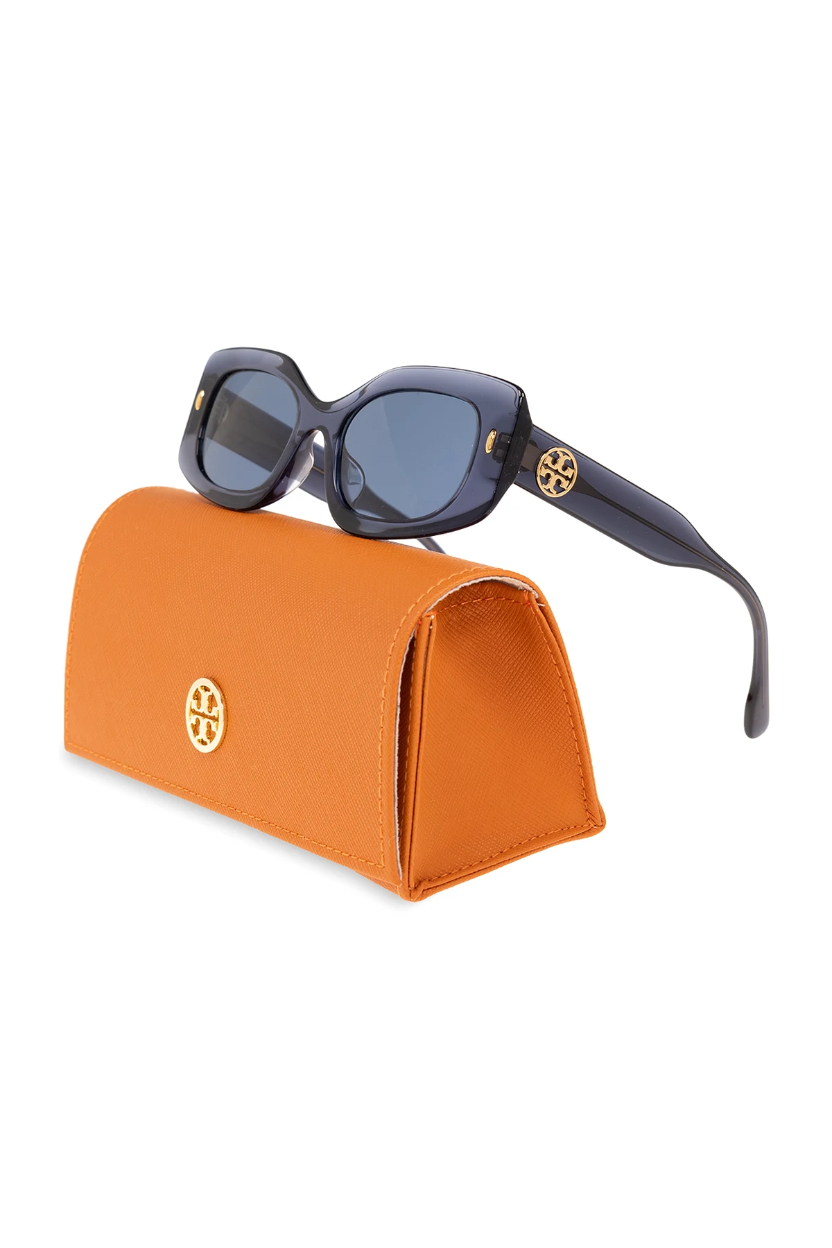 Blue ‘Miller’ sunglasses from Tory Burch. Crafted with a semi-translucent finish, this model features a rectangular framework with a single bridge, integrated nose pads, gold-tone appliqués on the front, branded temples and blue lenses with UV protection. Comes with an orange snap-fastened case.