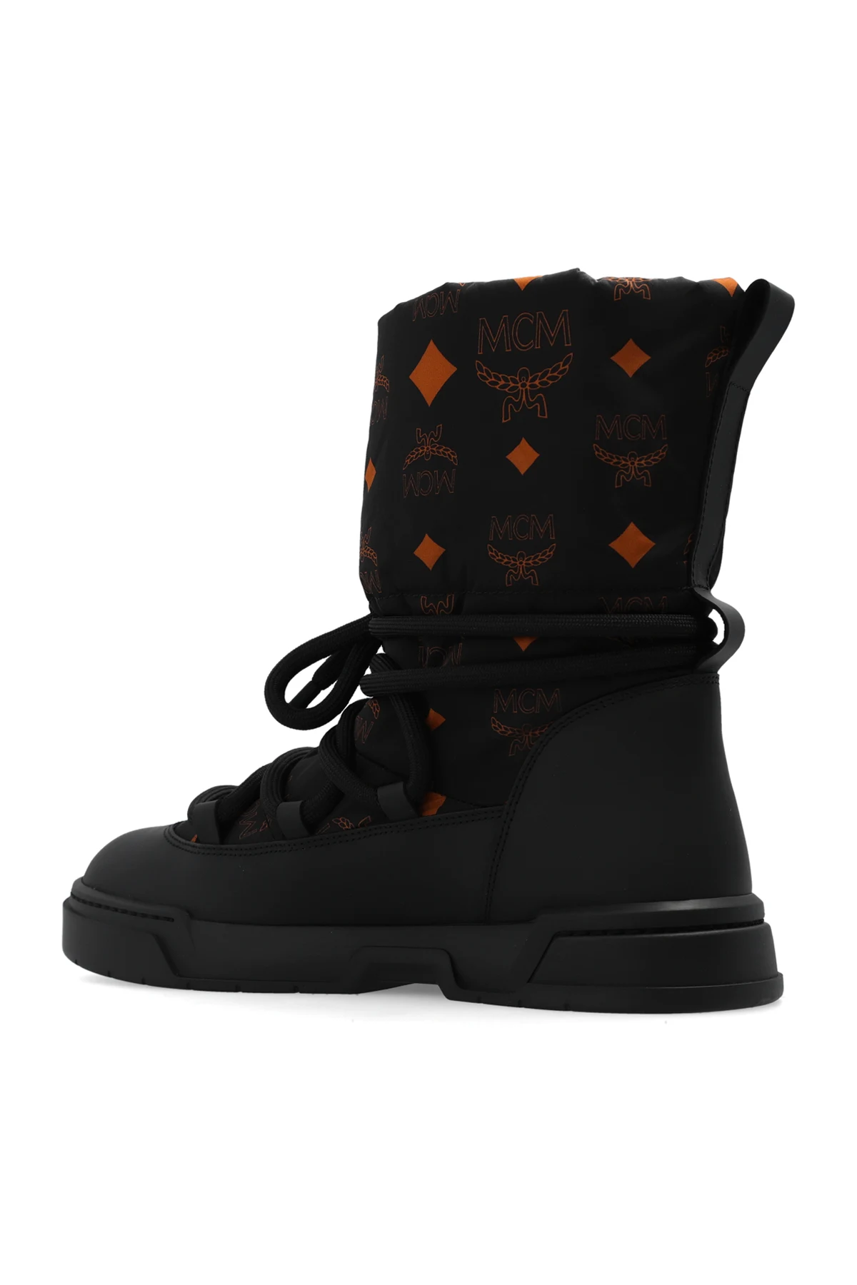 Black ‘Skyward Hi’ snow boots from MCM. Made of fabric trimmed with leather, this pair features decorative lacing, a brown monogram pattern and a black rubber sole.