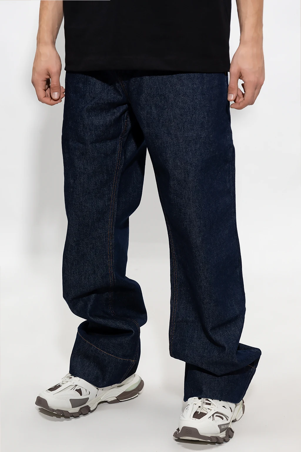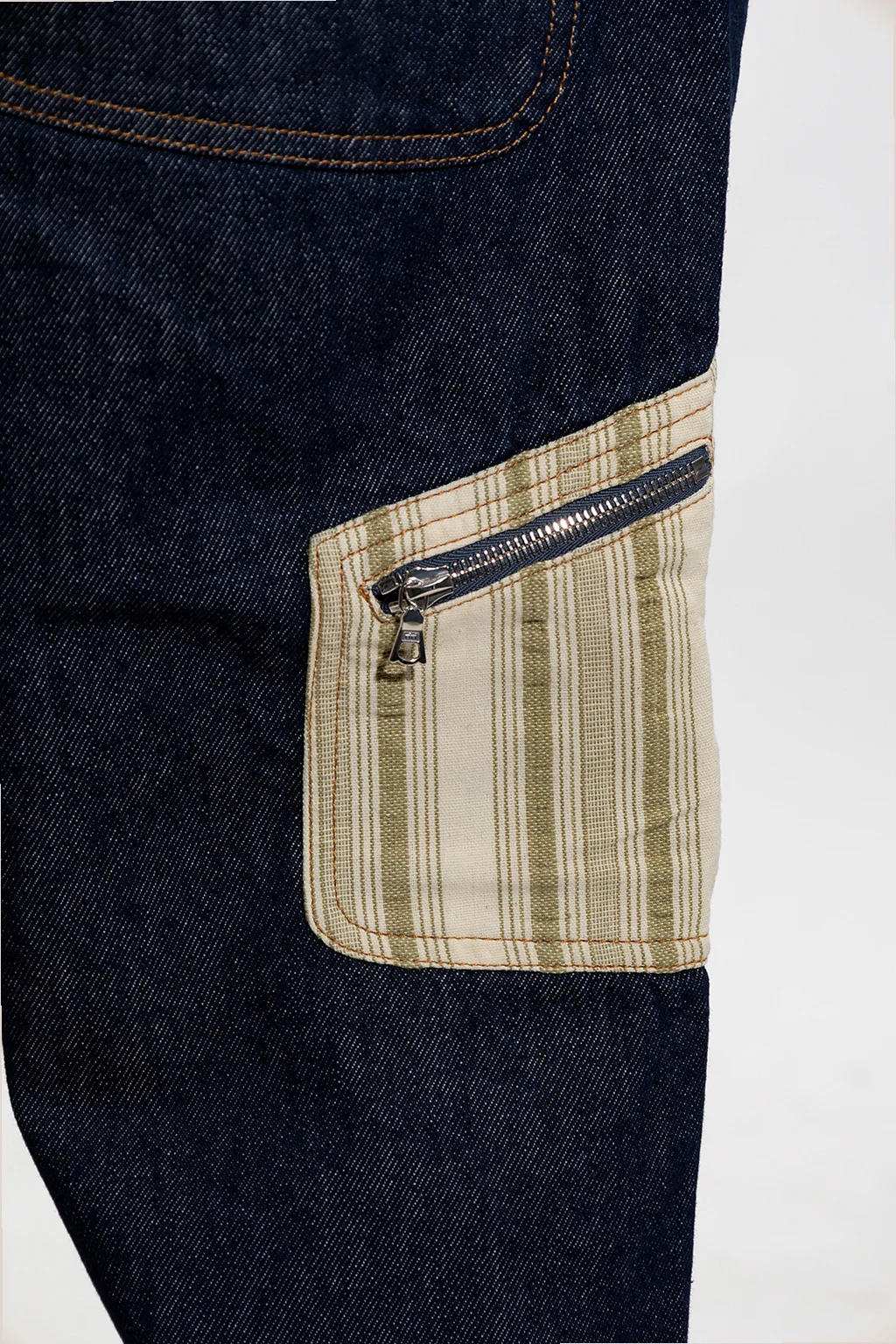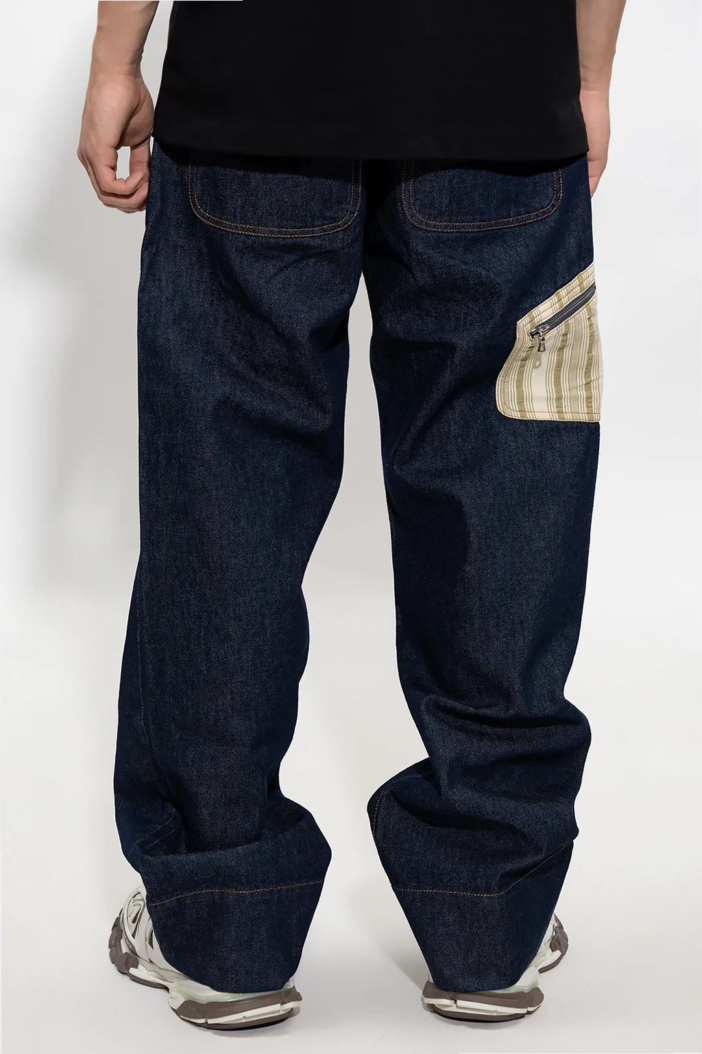 Navy blue 'Miles’ jeans from Wales Bonner. Falling with wide straight legs, this pair features a zip fly with a button, cream and green striped inserts and multiple pockets.