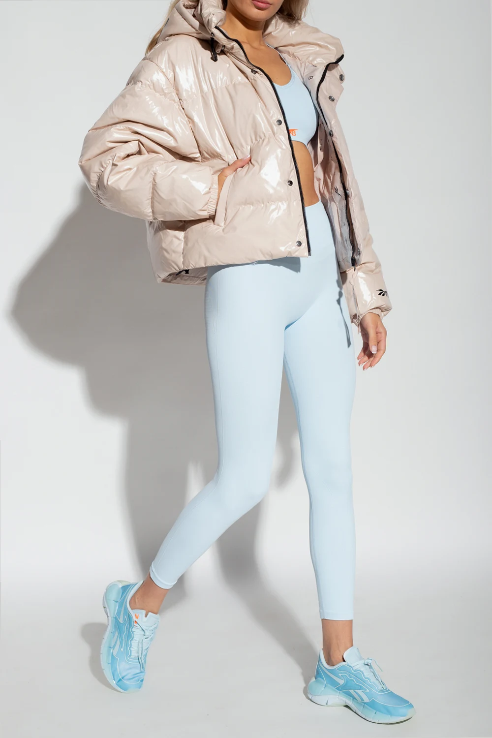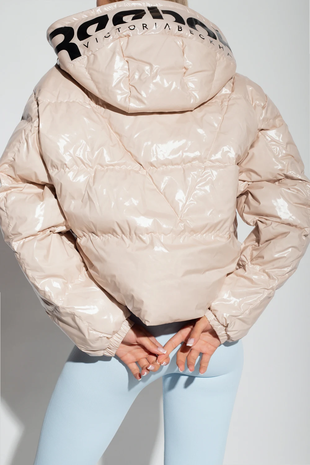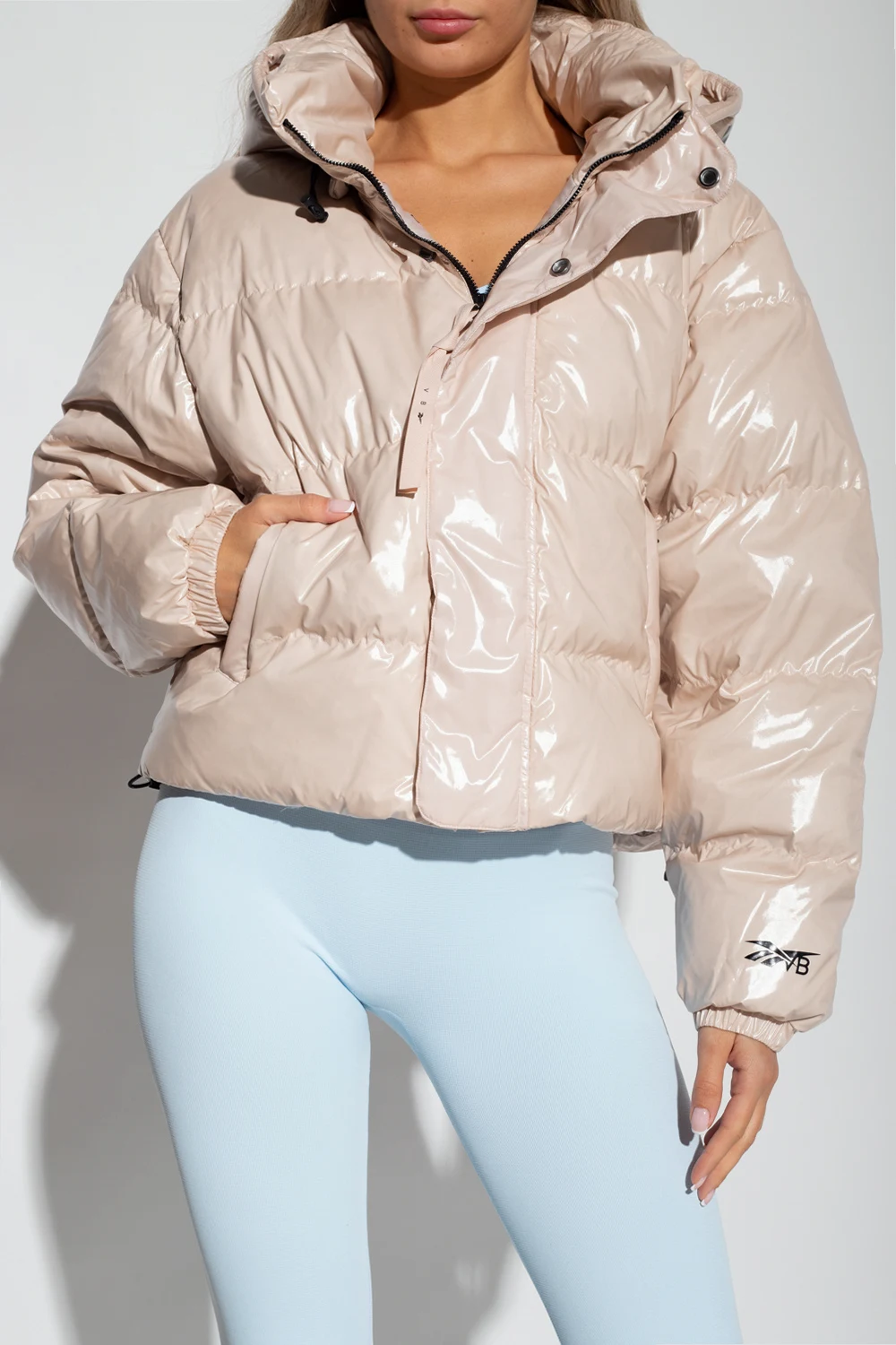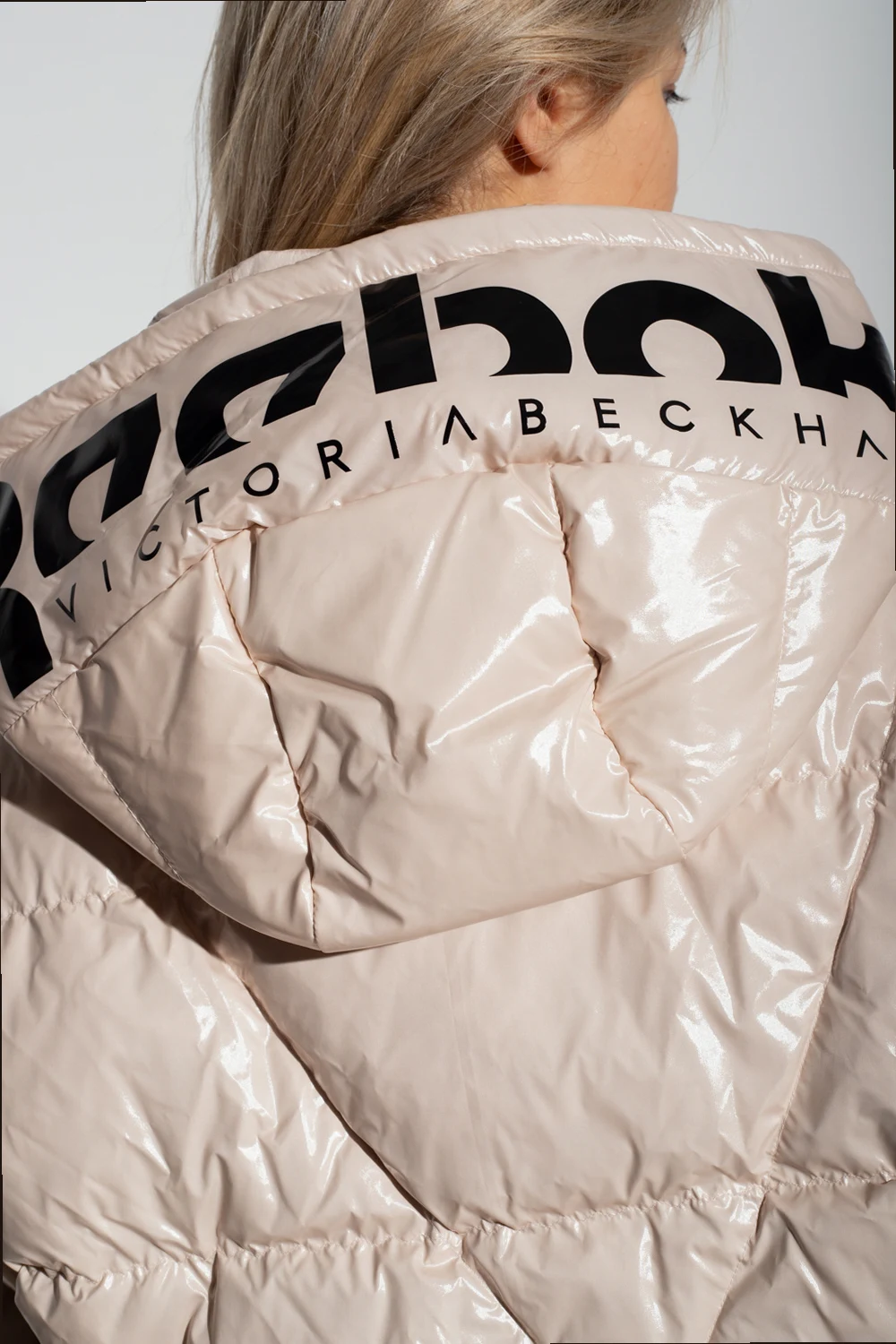 Cream down jacket from Reebok x Victoria Beckham. Fastened with a zip and snaps, this design features a black logo pattern, two zip pockets, drawstring hood and hem as well as long sleeves with ribbed cuffs.