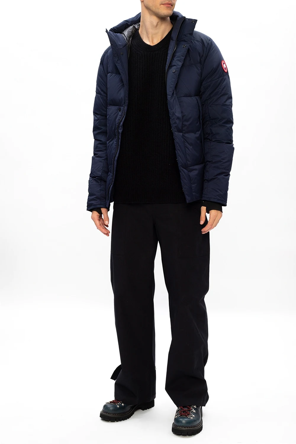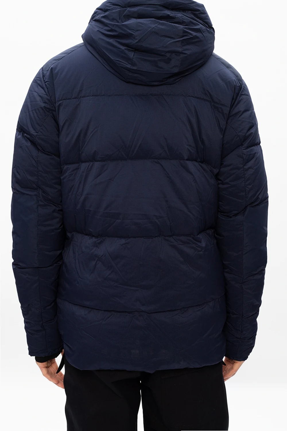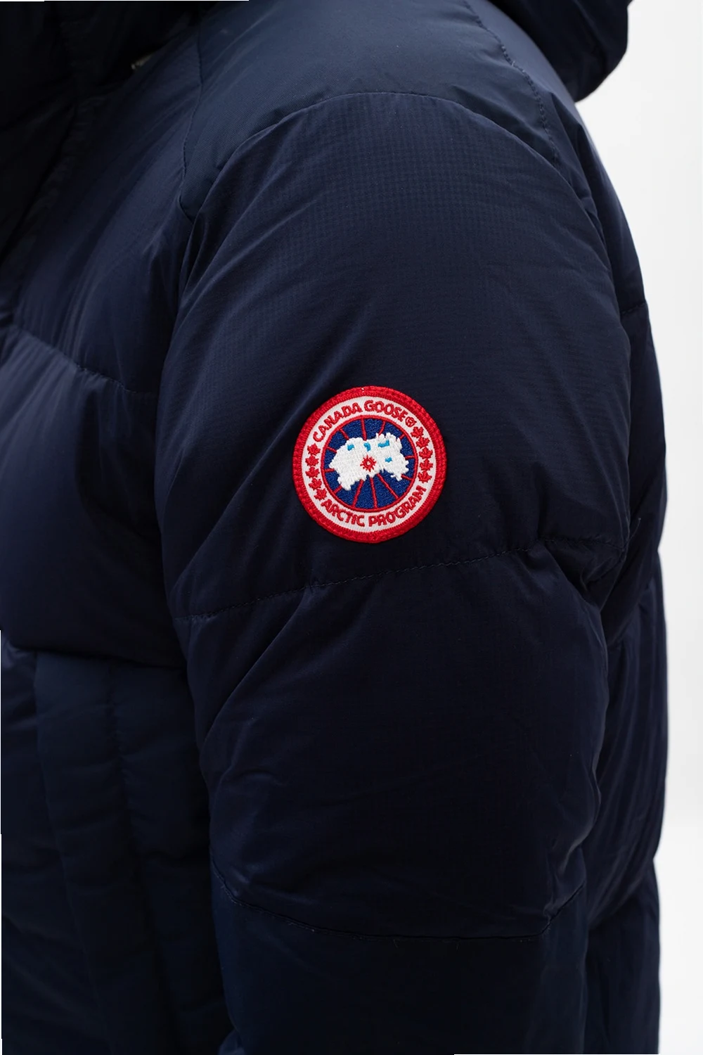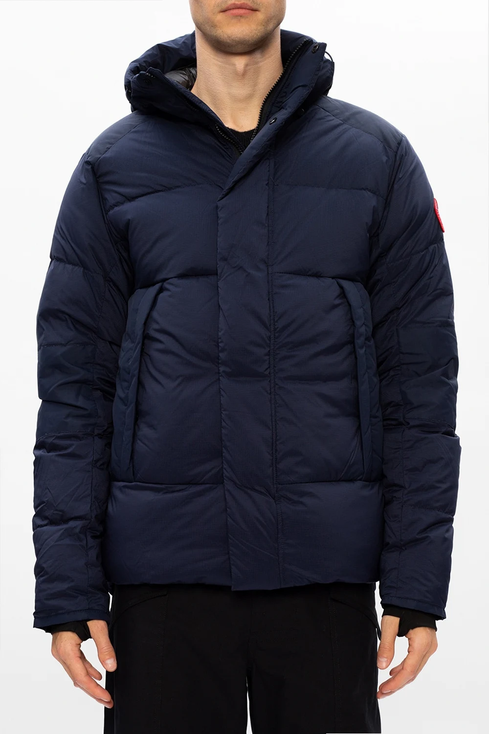 Navy ‘Armstrong’ hooded jacket from Canada Goose. Fastened with a two-way zip and snap buttons, this garment features a drawstring hood, a logo patch in white, red and blue, two snap button pockets and elasticated cuffs with thumb holes.