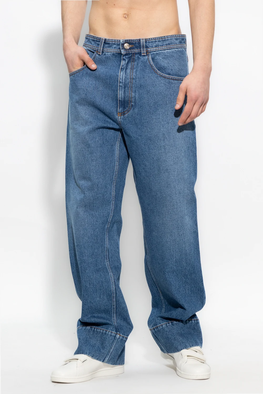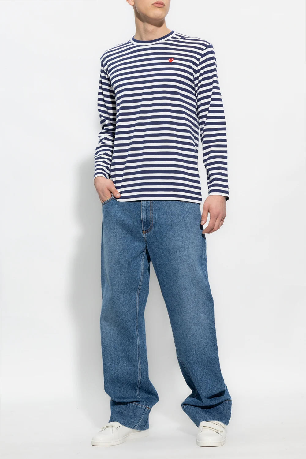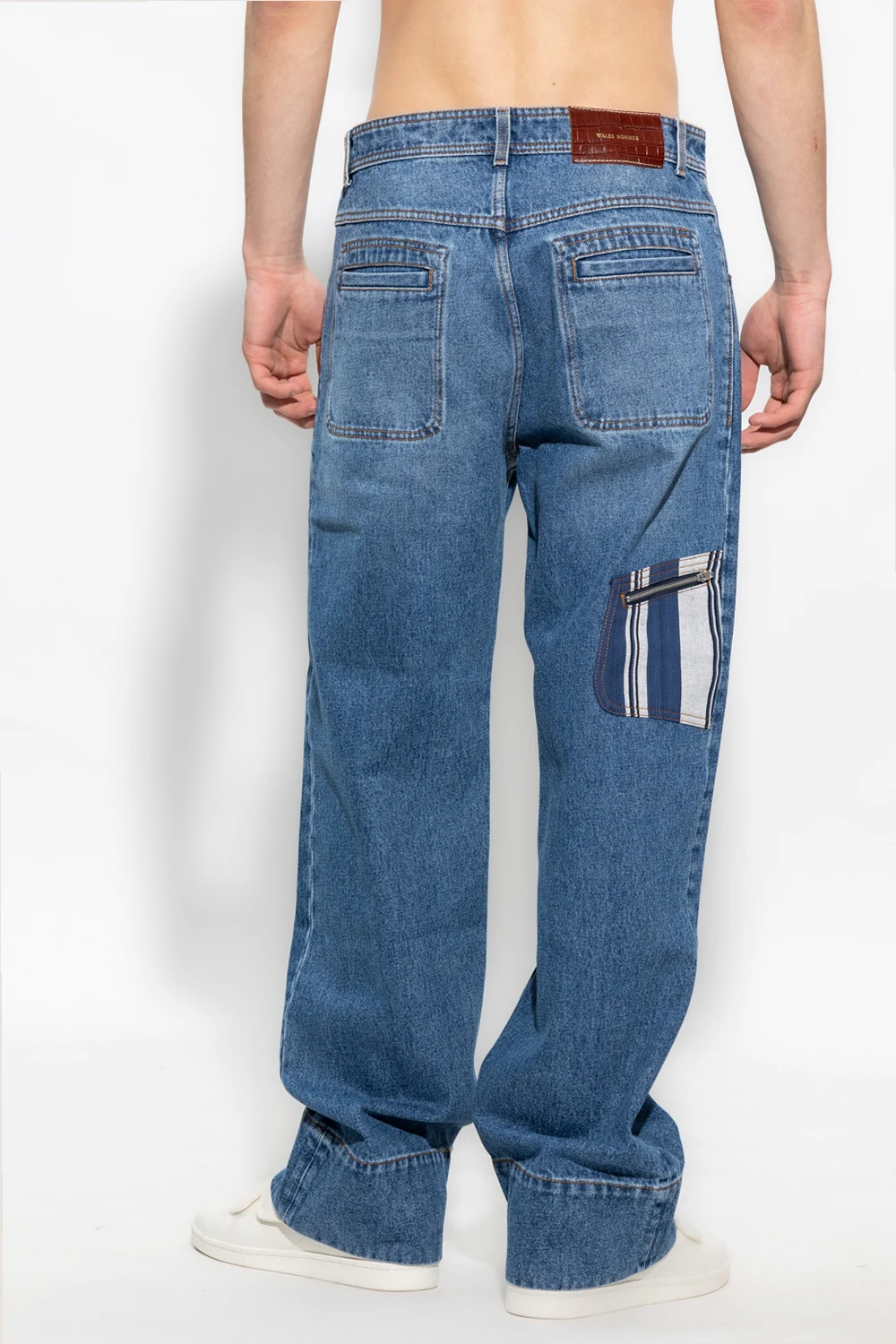 Blue ‘Miles’ jeans from Wales Bonner. Made of organic cotton, this pair features a button and zip fastening, two front pockets, two back pockets, navy, black and white stripes, embroidered inserts as well as wide, straight legs.