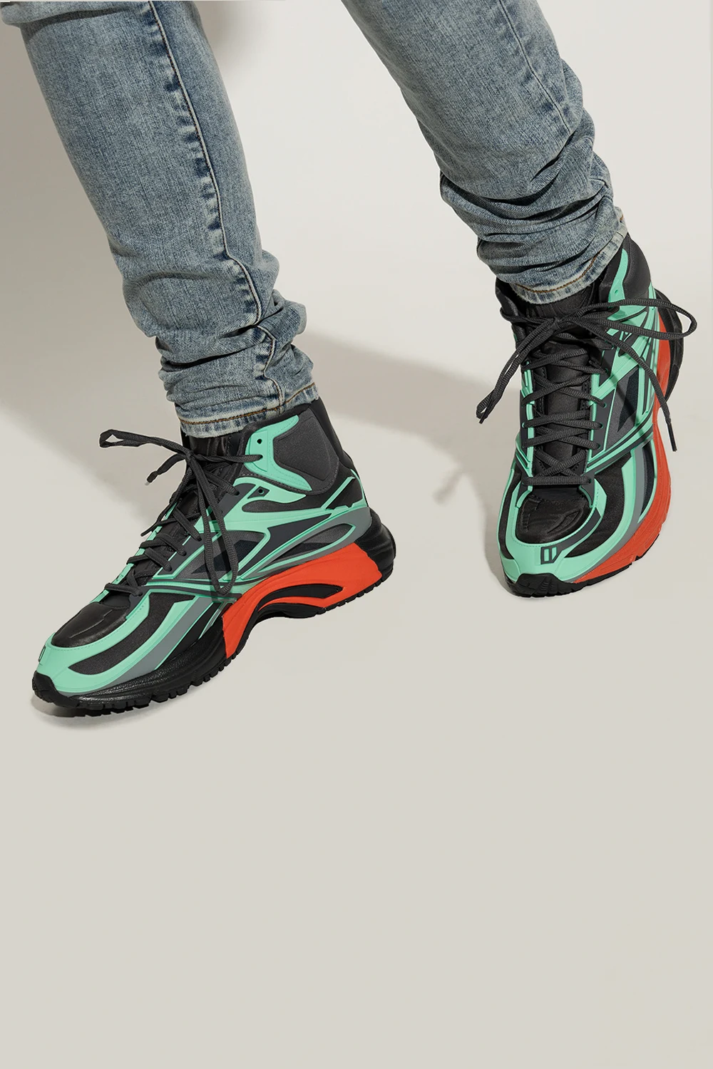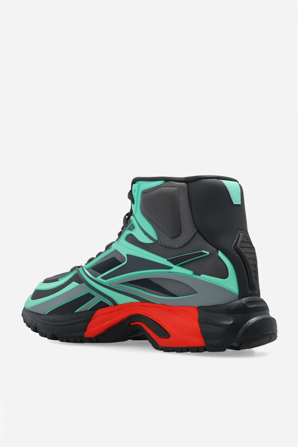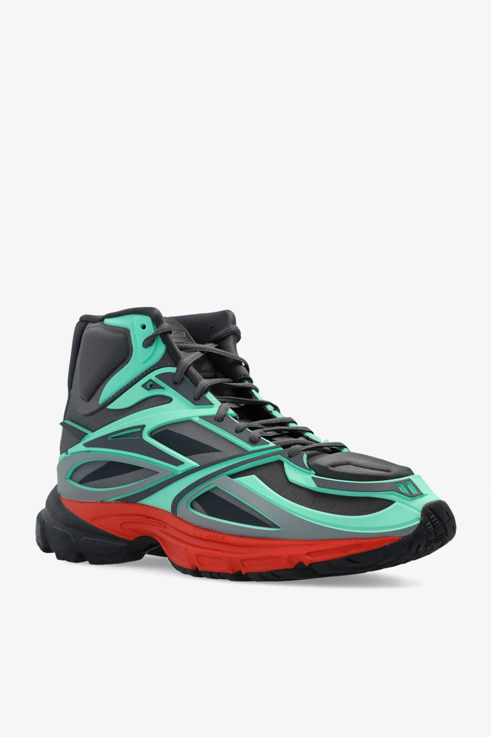 Grey, light green and orange ‘Premier Road Modern Mid’ high-top sneakers from Reebok. Sitting on a grey and orange rubber sole, this lace-up model showcases a tactile rubber appliqué.
