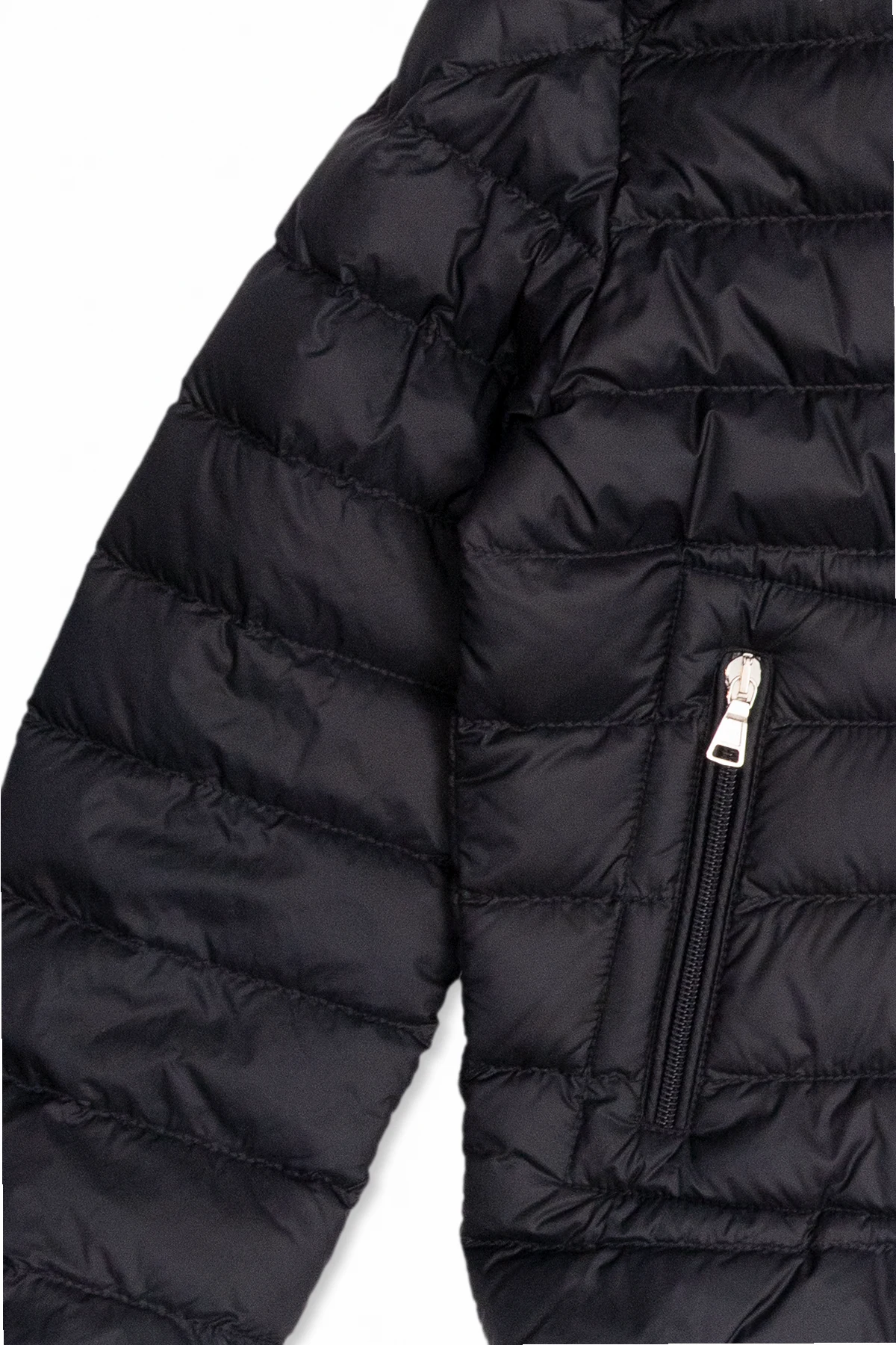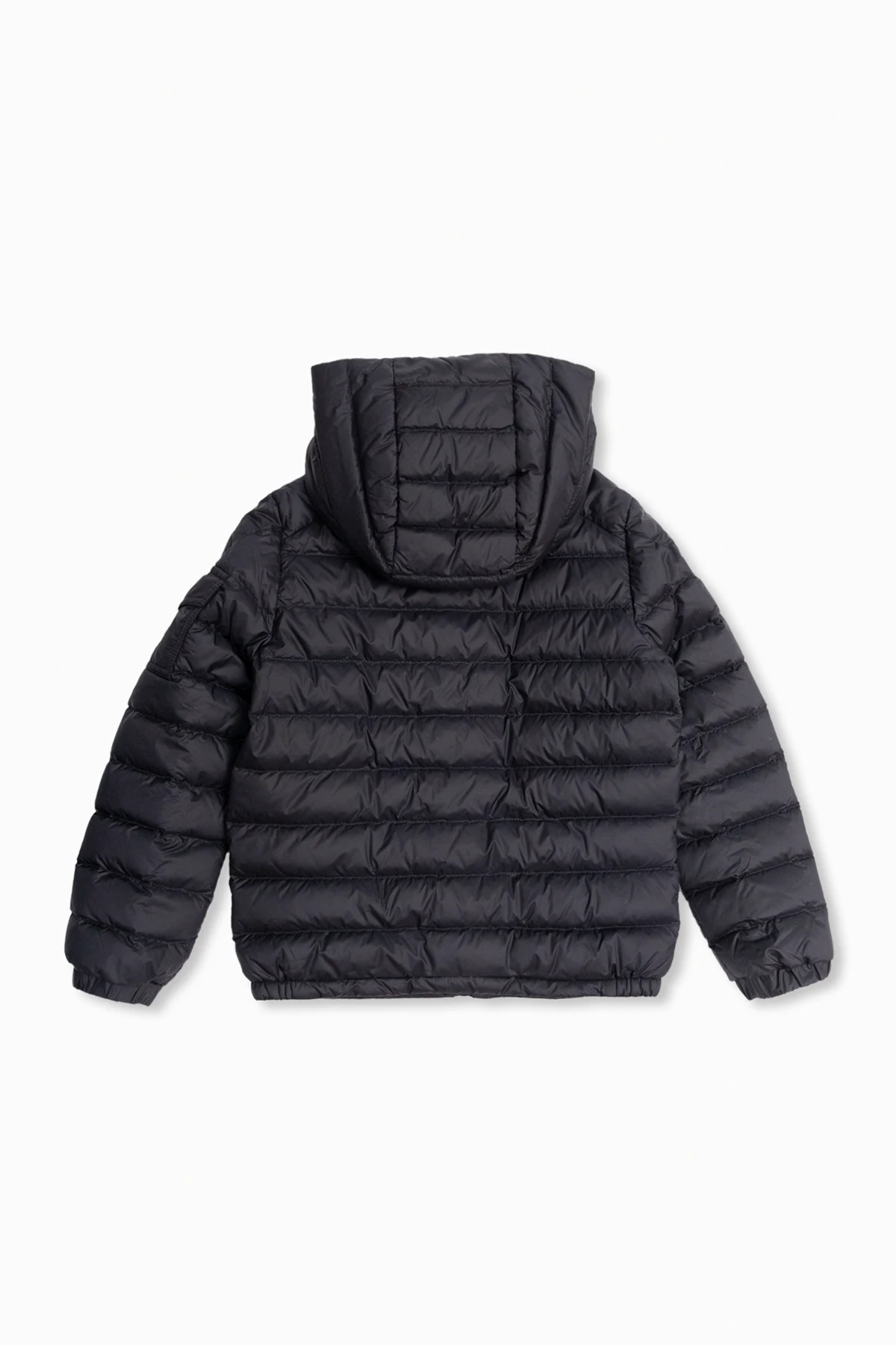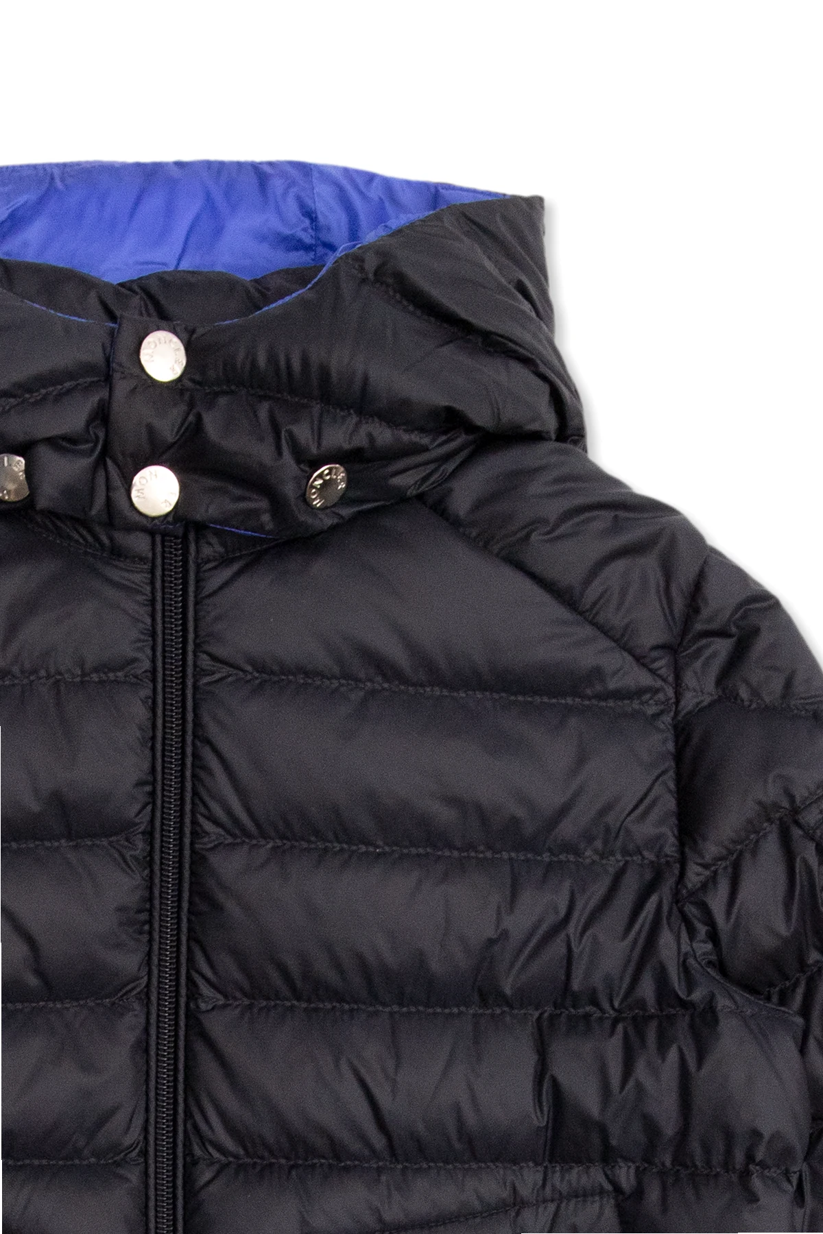 Navy blue jacket with a detachable hood from Moncler Enfant. This style fastens via a zip and features two frontal pockets, down padding, blue lining and long sleeves – one is accentuated with a colourful logo patch and a flapped pocket with a snap.
