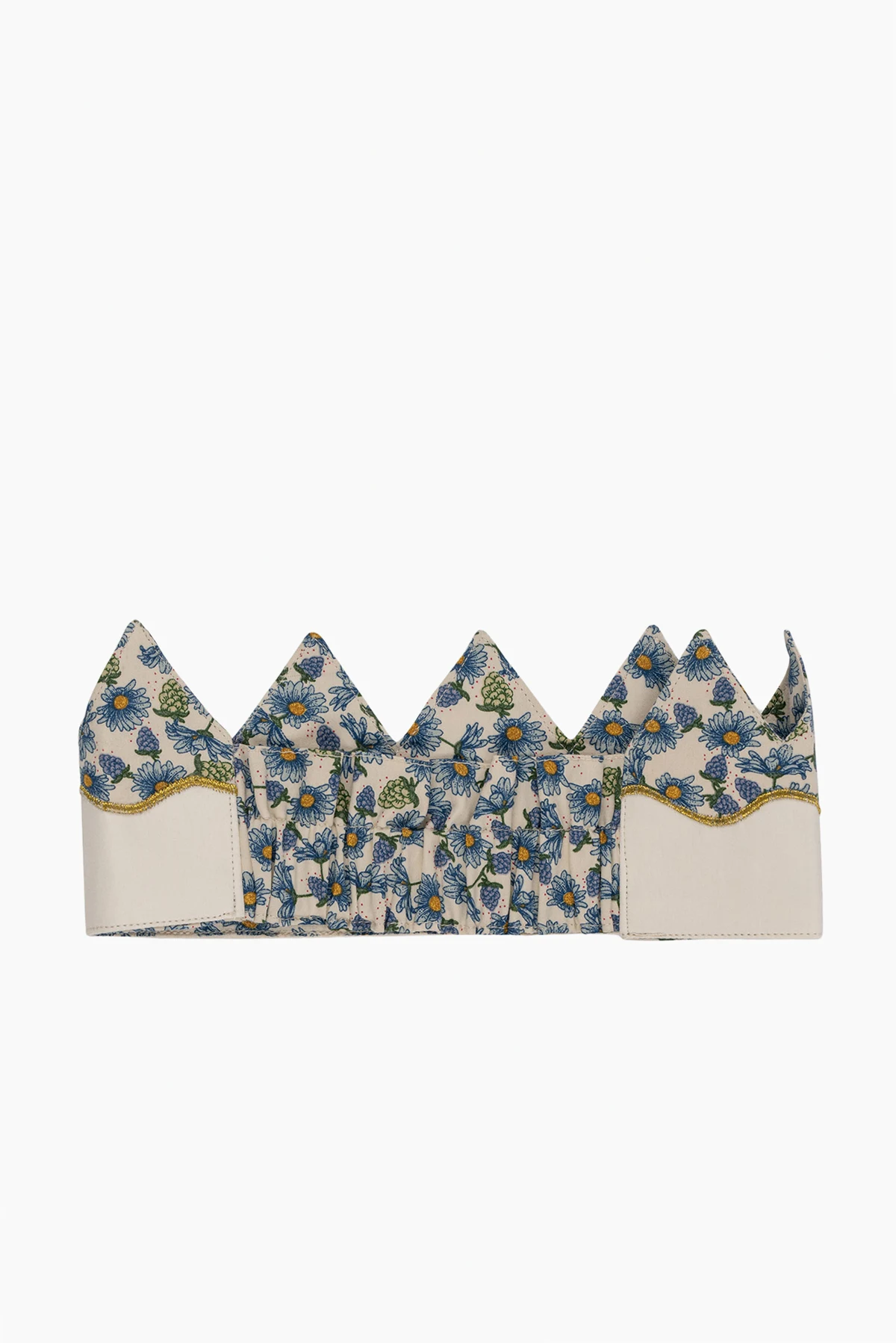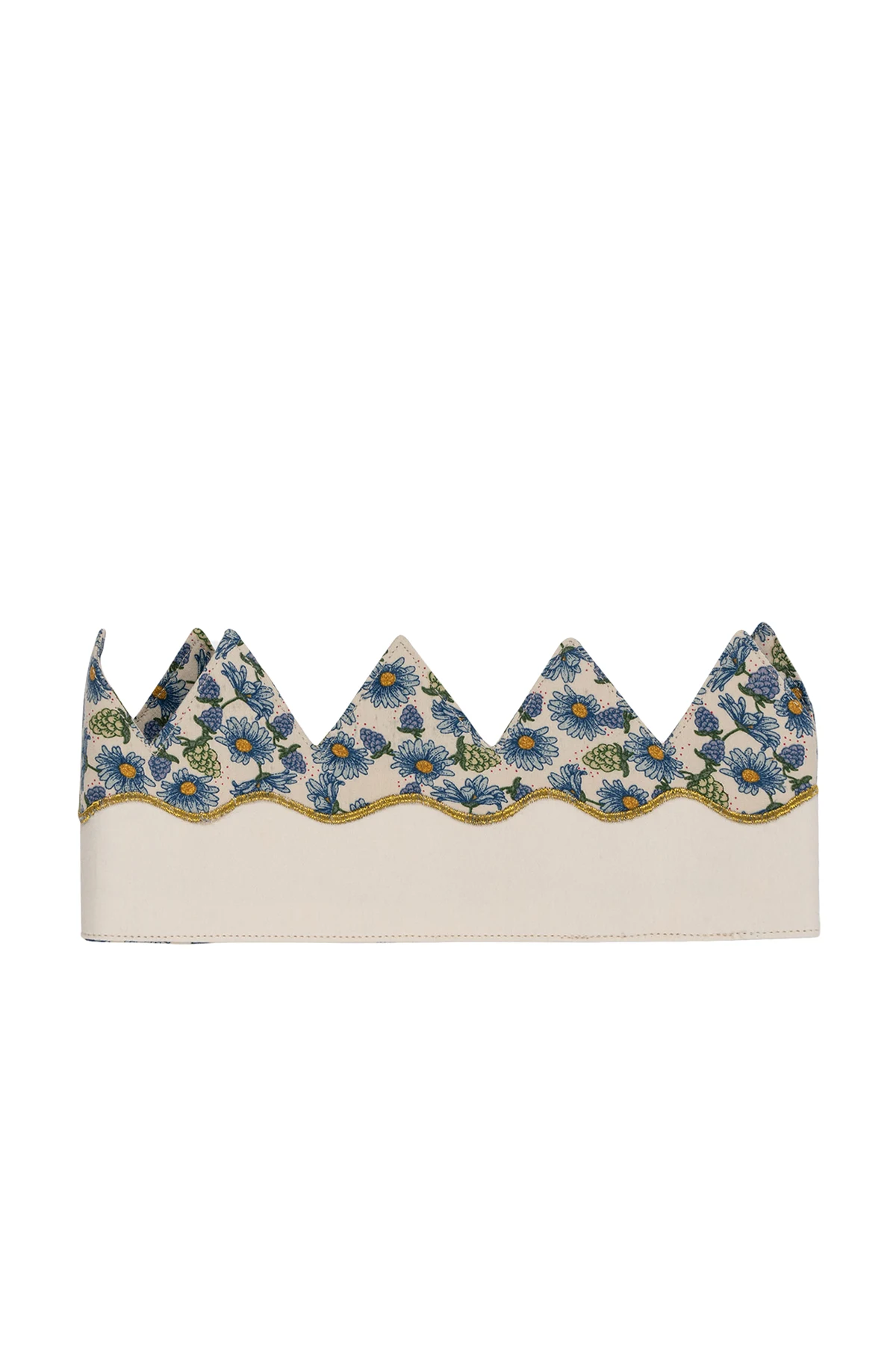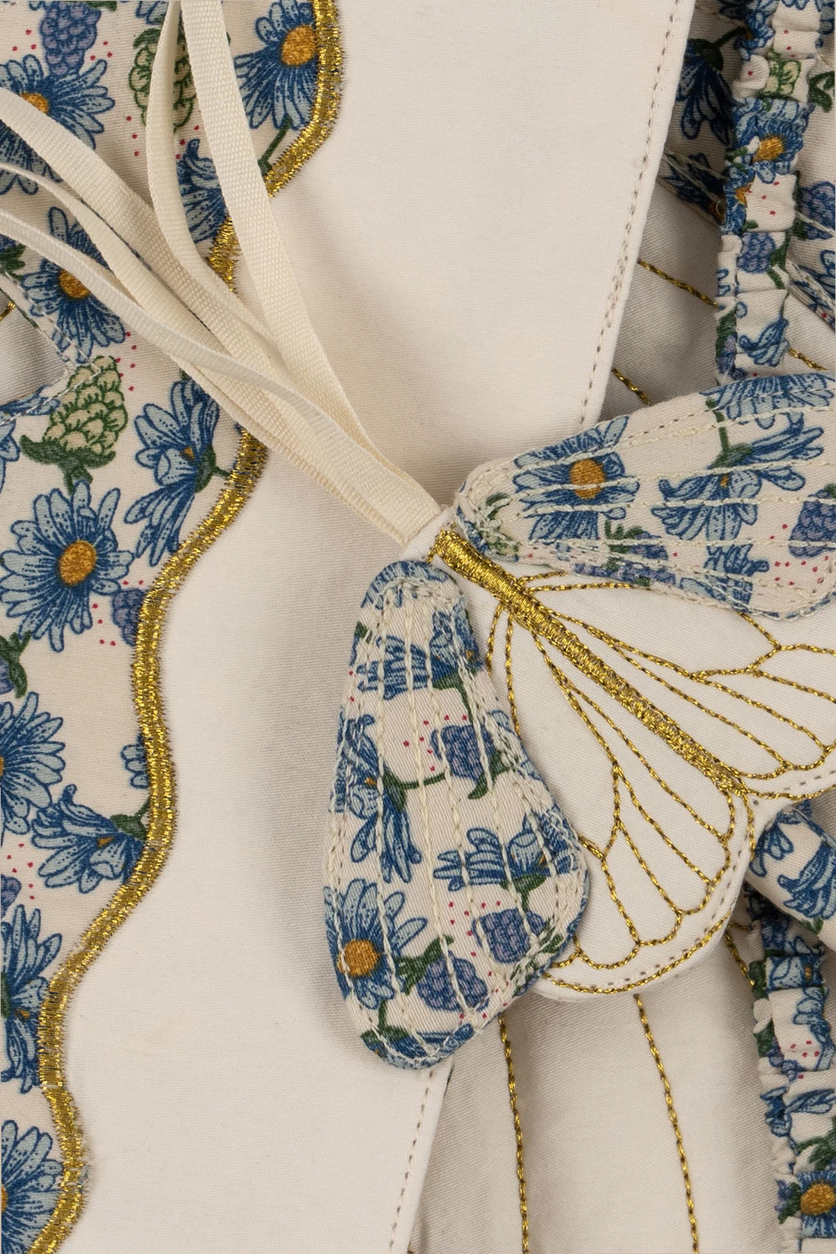 Multicoloured ‘Butterfly Marguerit Blue’ costume from Konges Slojd. Made from organic cotton and decorated with a blue, green and yellow floral motif and gold-tone stitching. The crown and wings feature an elasticized trim.