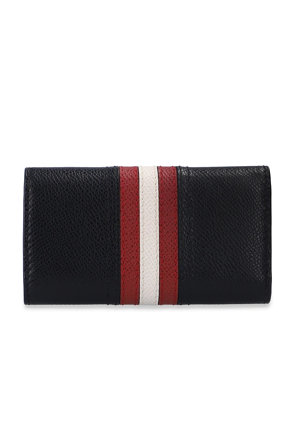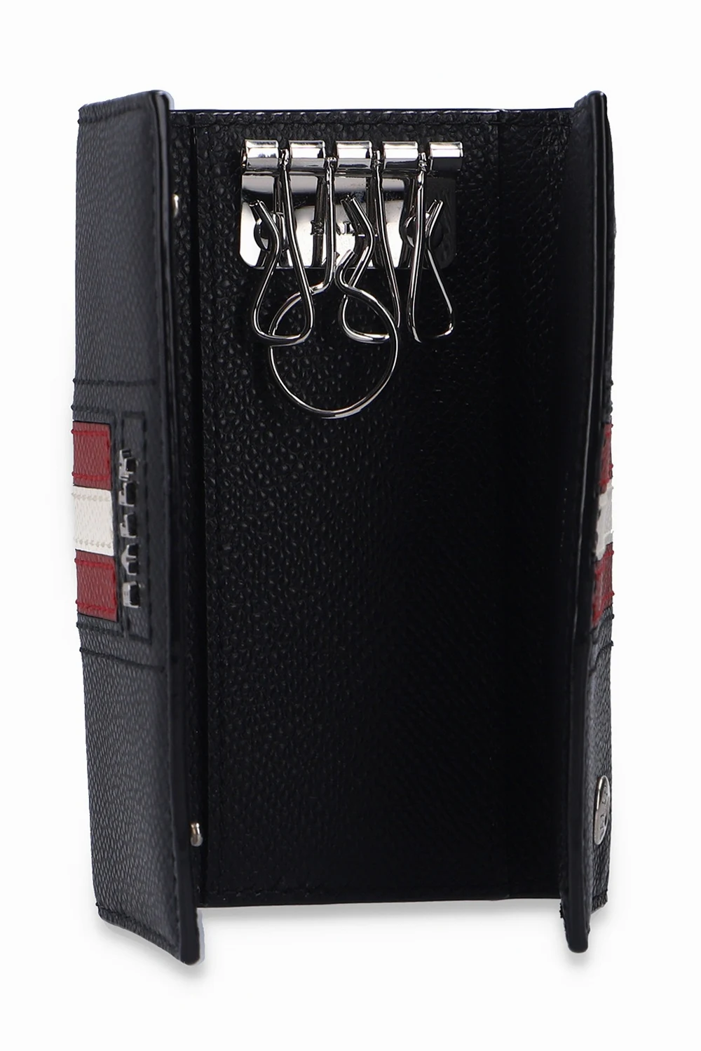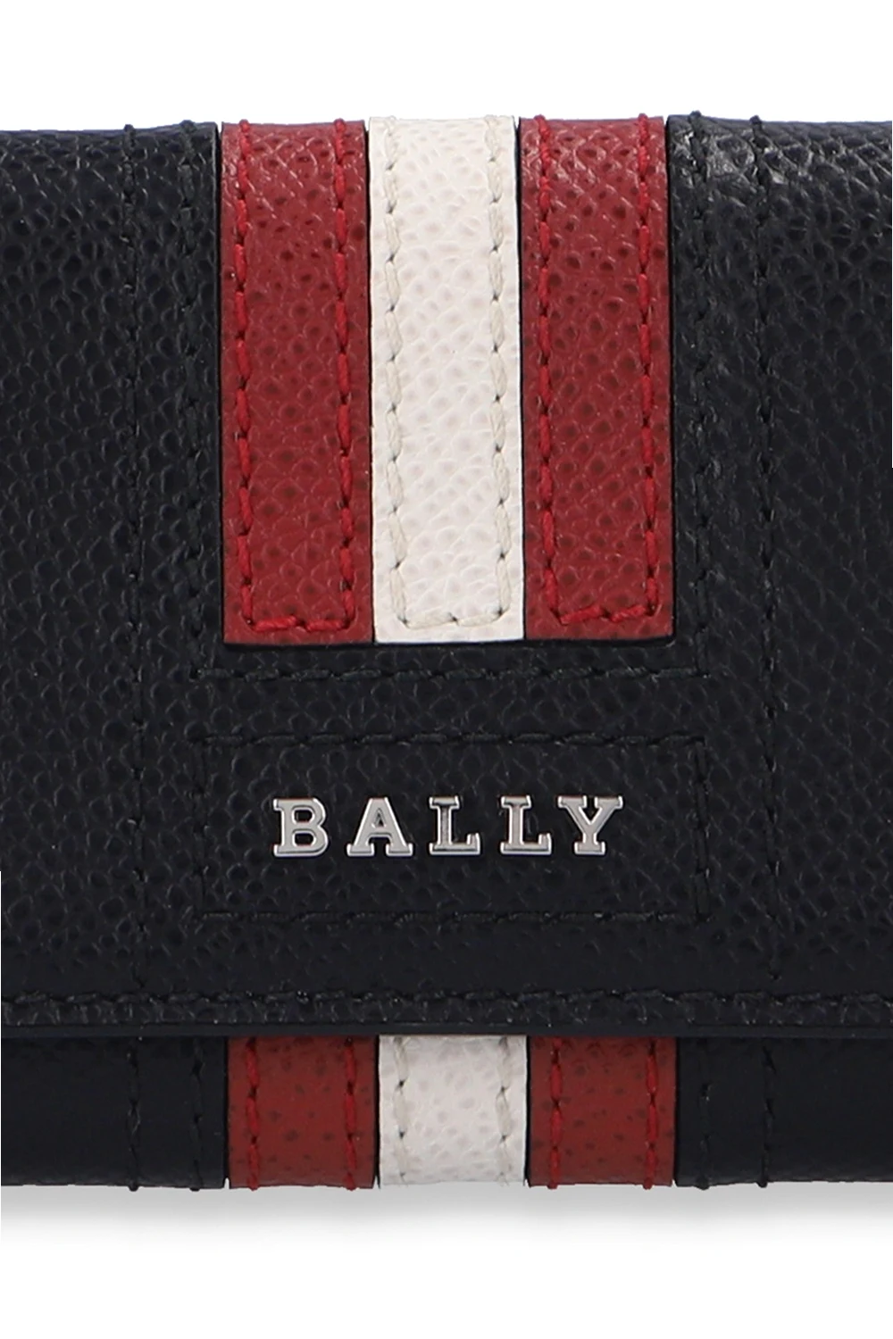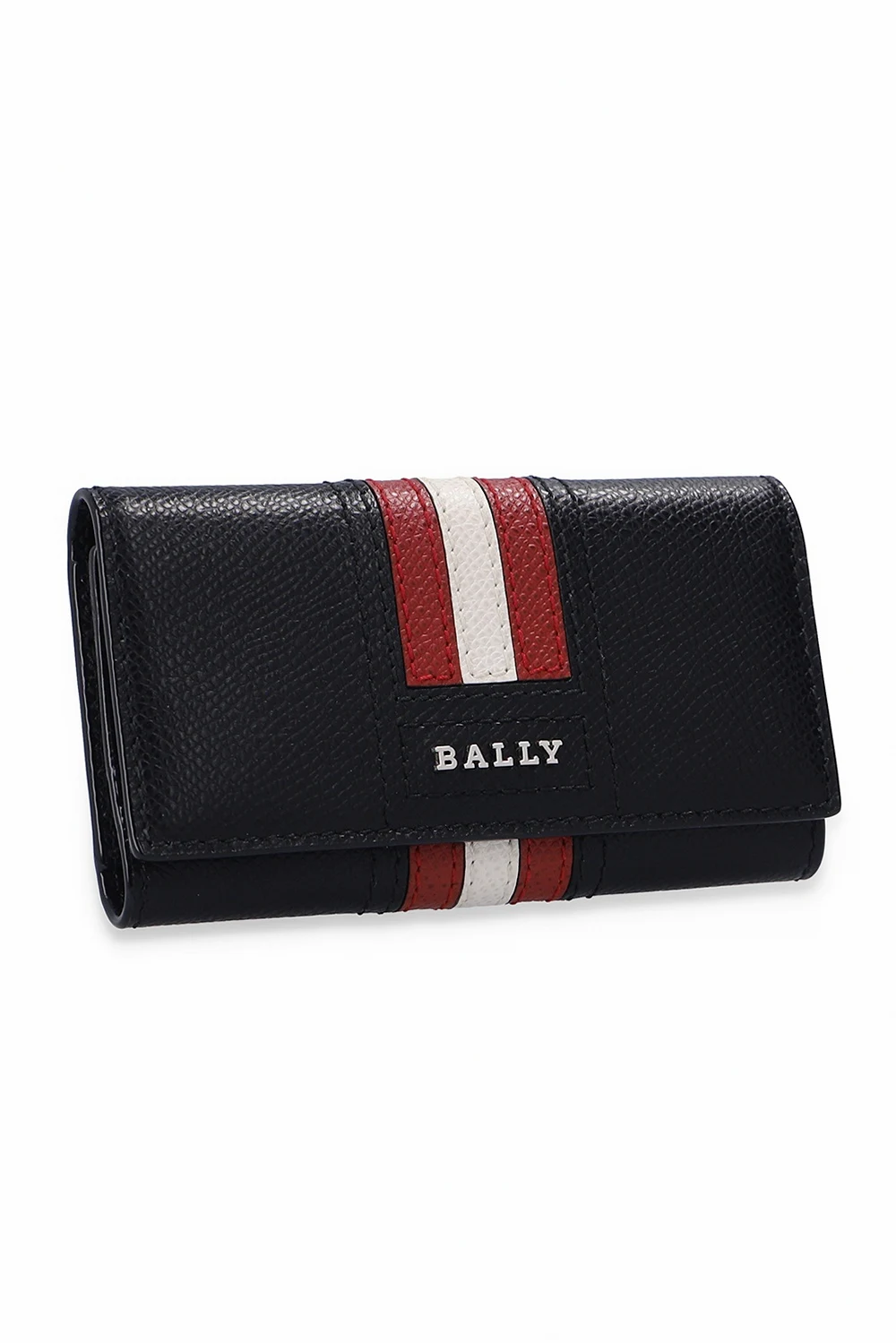 Black key holder from Bally. Emblazoned with a logo appliqué and a red and white stripe, which is highly recognisable for the brand, this accessory fastens via snap-buttons and features two slip pockets and a keyring on the inside.