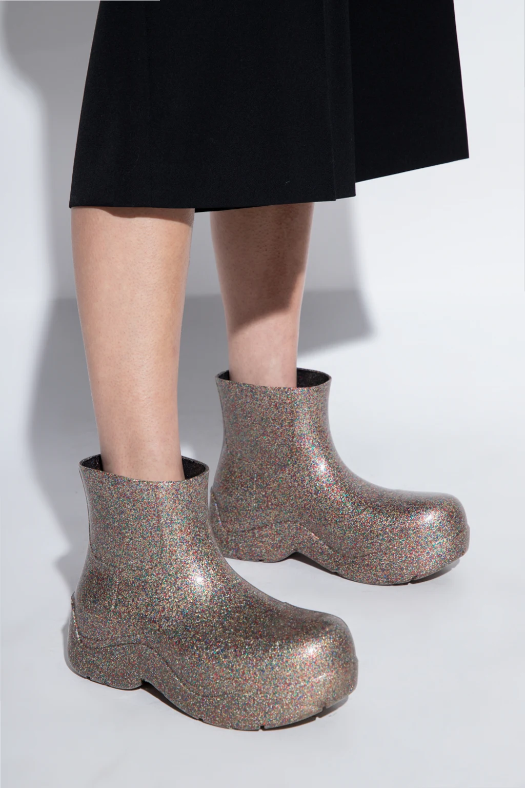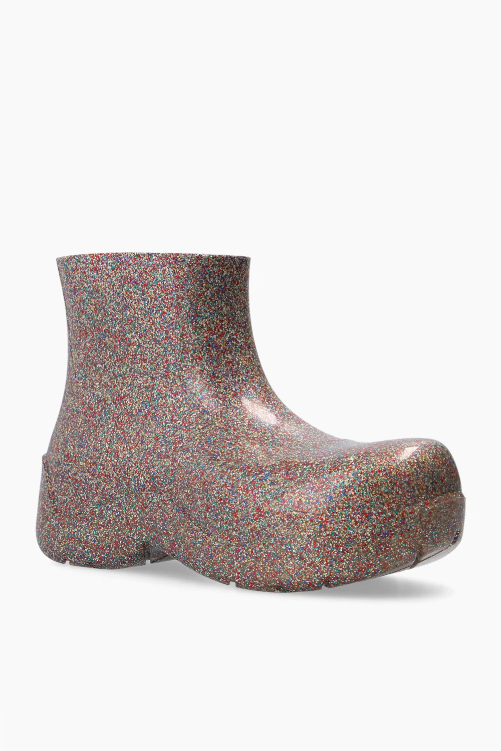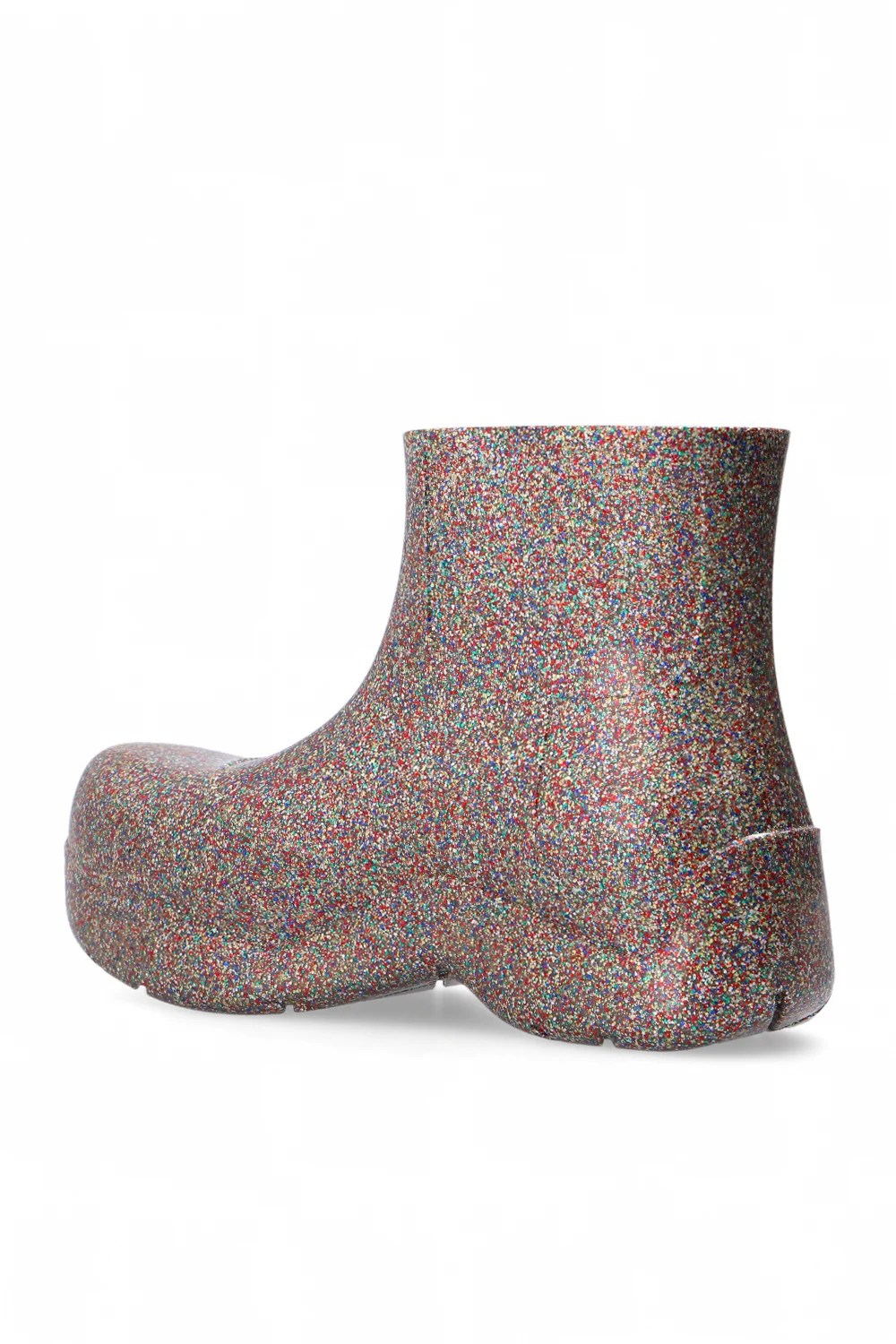Multicoloured ‘The Puddle’ rain boots from Bottega Veneta. Crafted entirely from rubber, this model was spruced up with glitter.