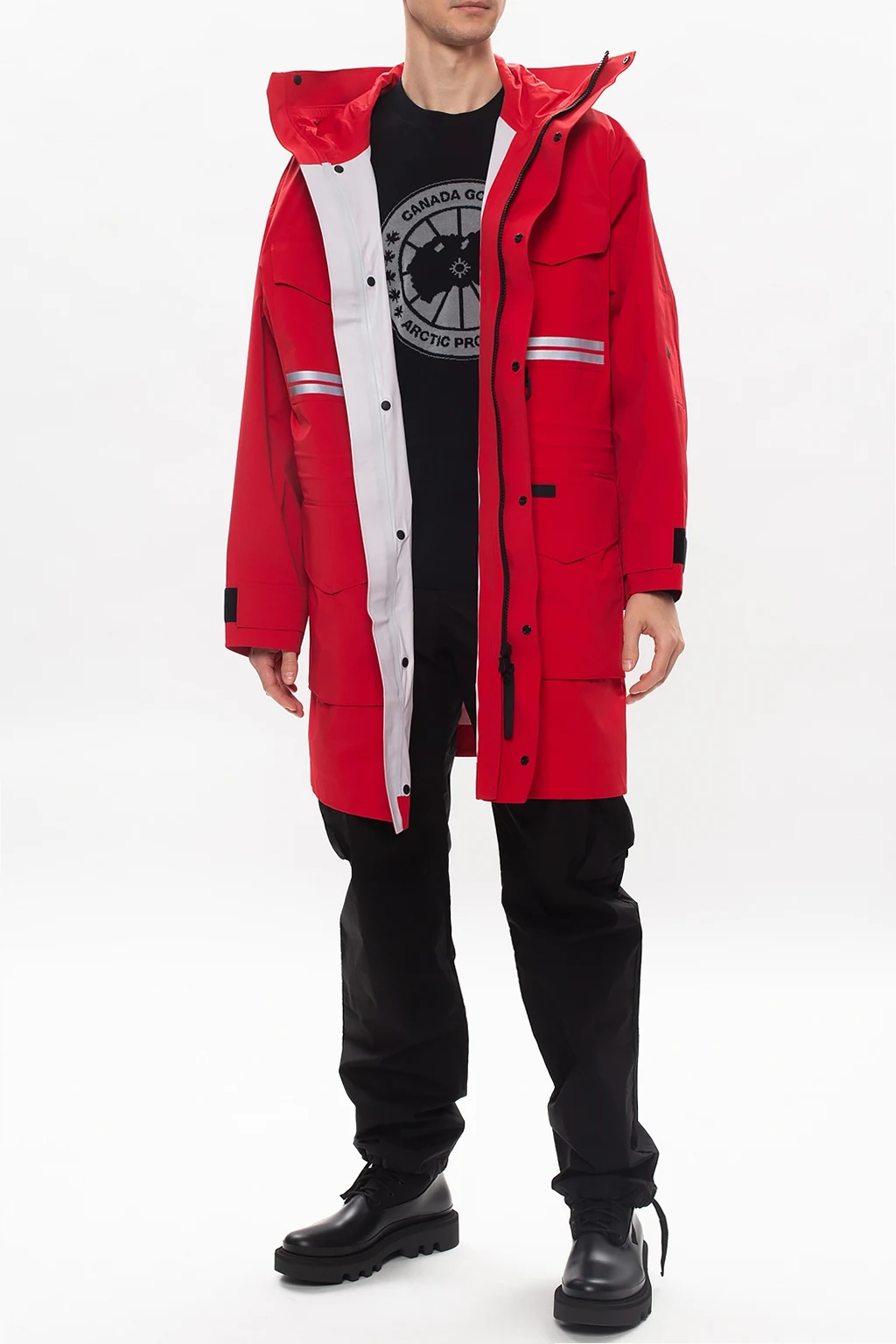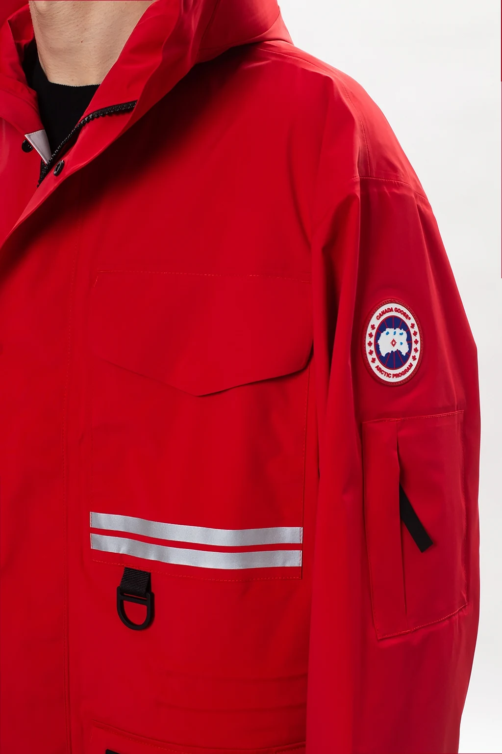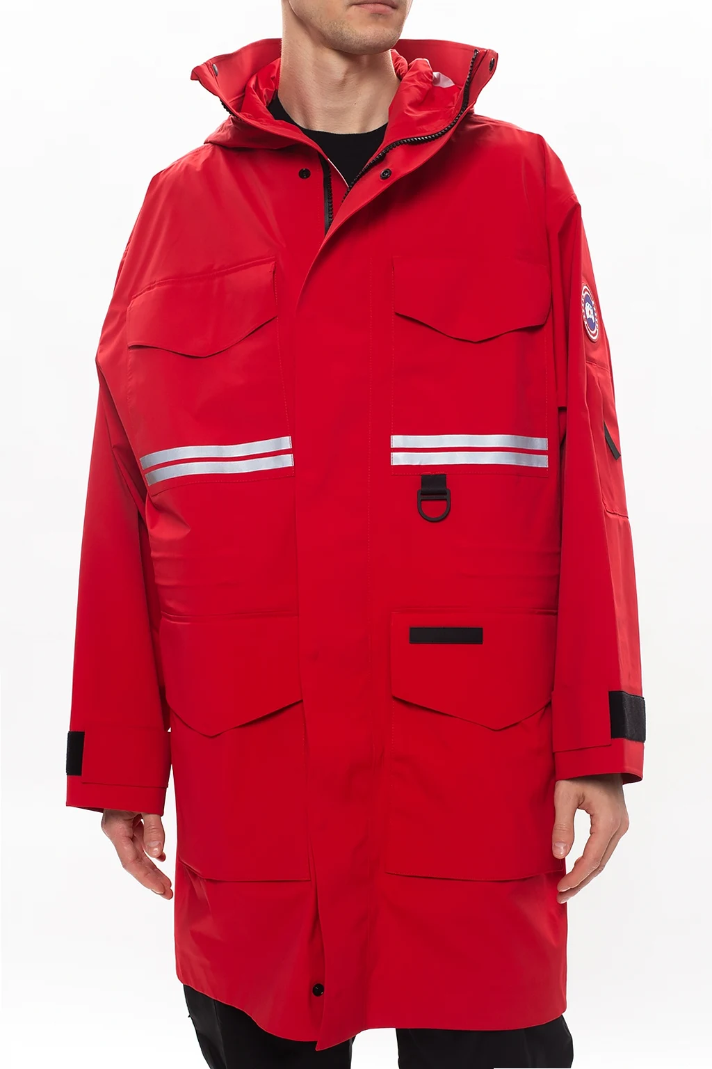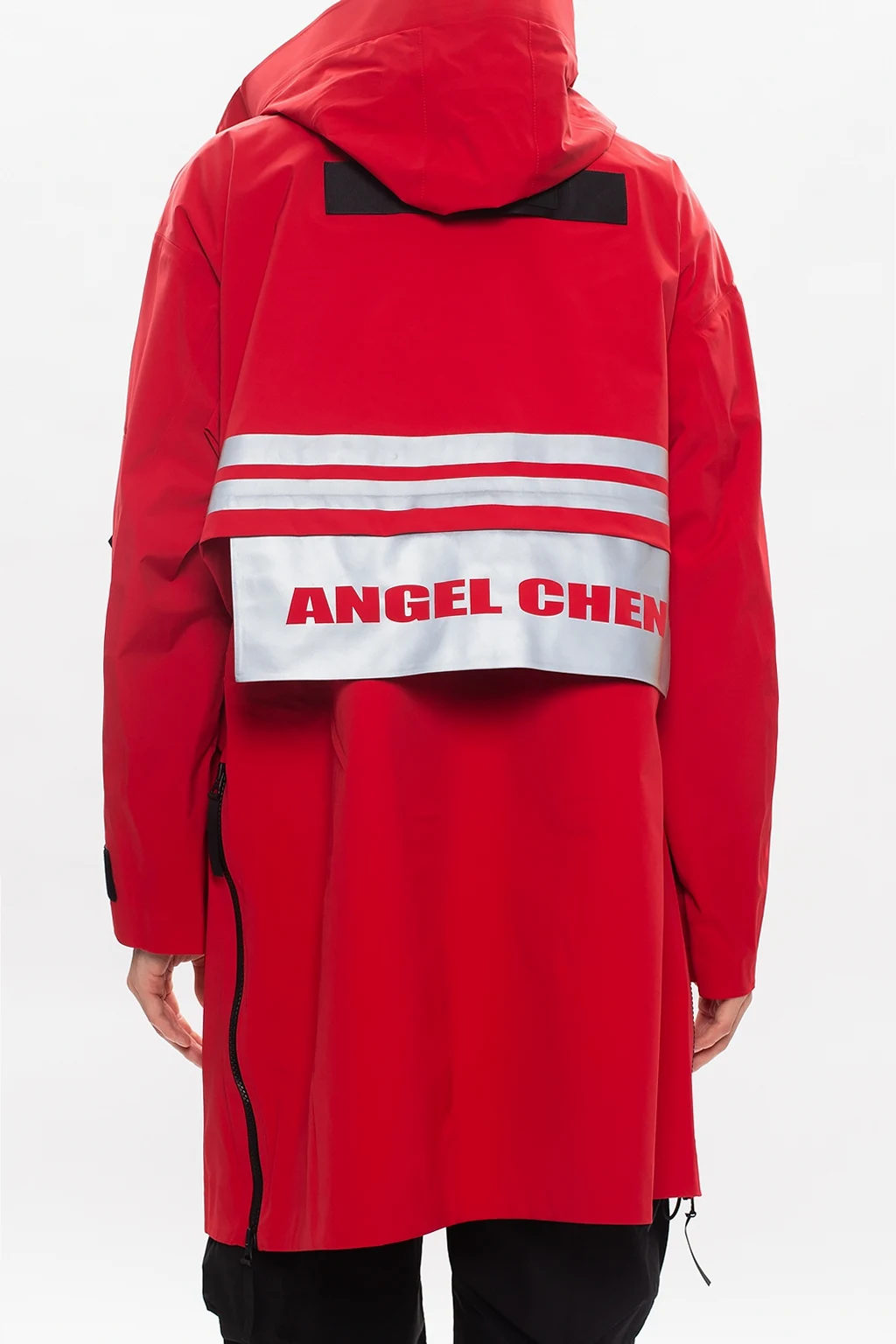Red ‘Mogan’ hooded rain coat from Canada Goose x Angel Chen. Fastened with a zip and snaps, this design is decorated with a logo appliqué on the sleeve. It has with a four snap-fastened flap pockets and two zip pockets on the front as well as a zip pocket on the sleeve, silver-tone reflective inserts and a logo print at the back.