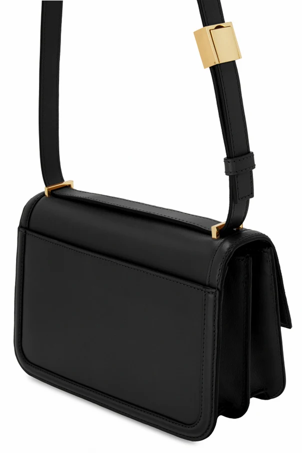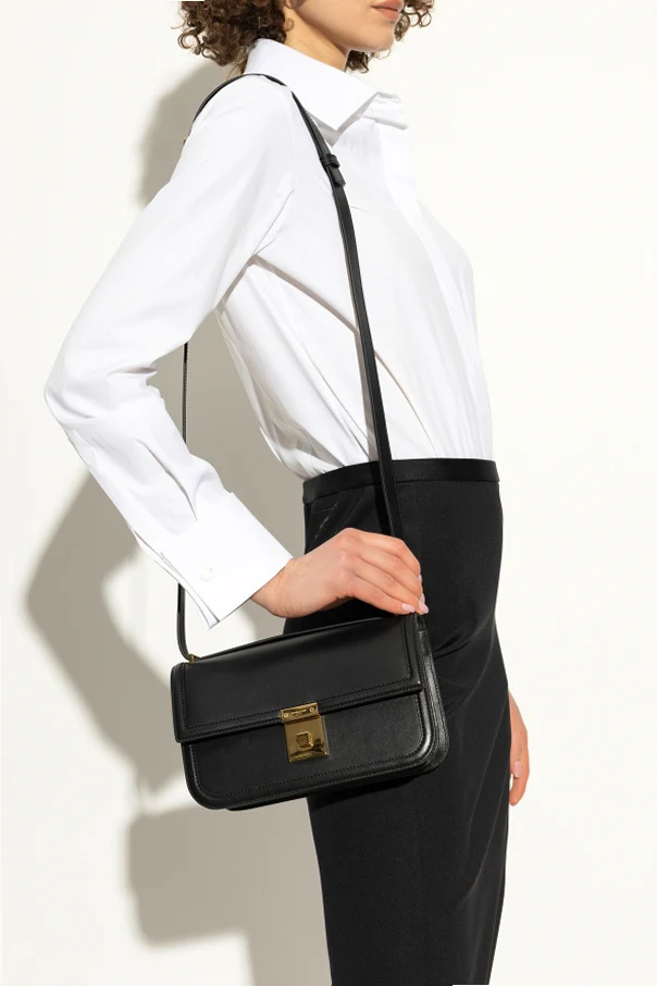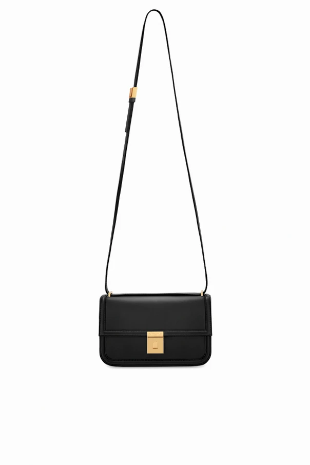 Der verstellbare, ebenfalls aus Leder gefertigte Riemen, verziert mit einem goldenen Element, bietet Tragekomfort. Das Innenleben der Tasche, ausgekleidet mit weicher Baumwolle, birgt zwei separate Fächer und eine Einschubtasche, die eine hervorragende Raumorganisation ermöglicht.
