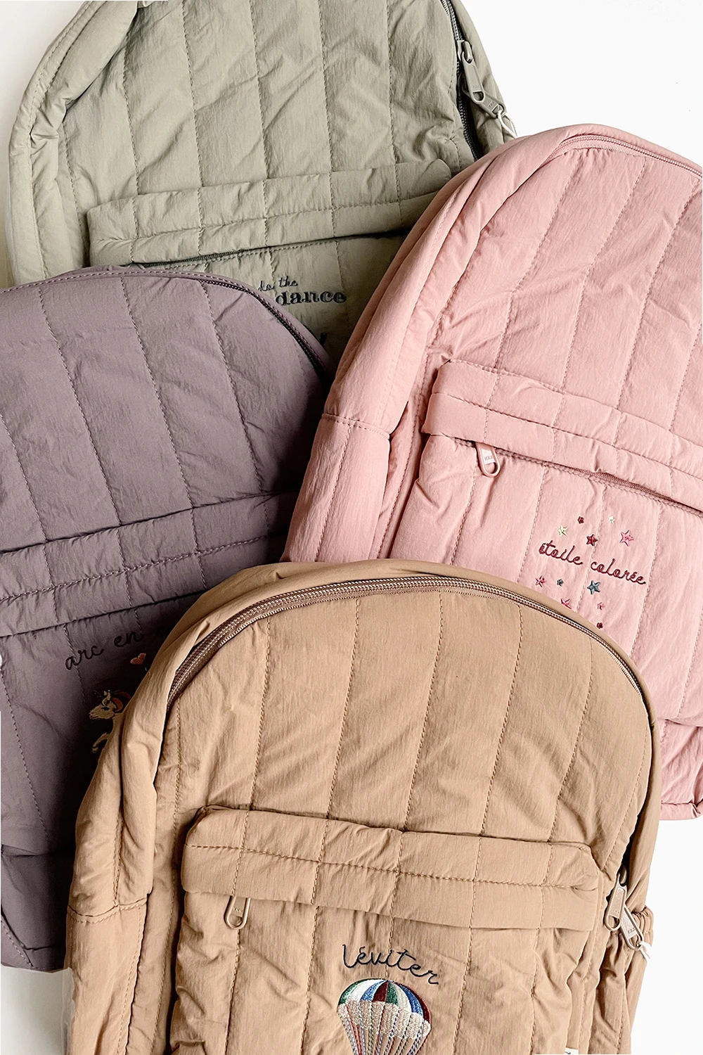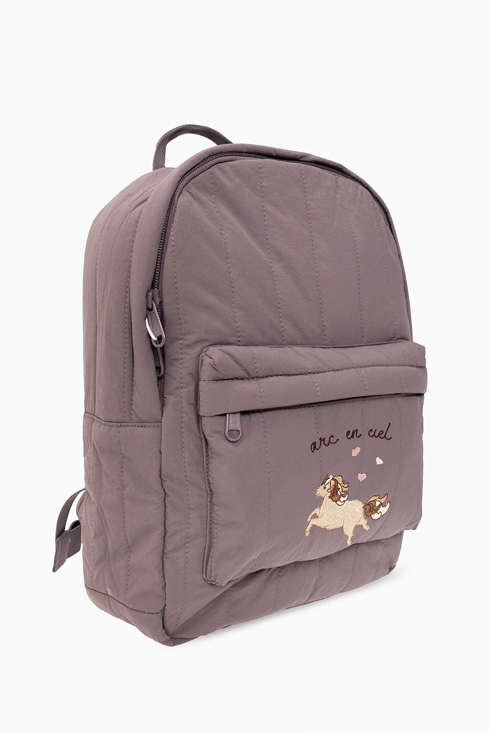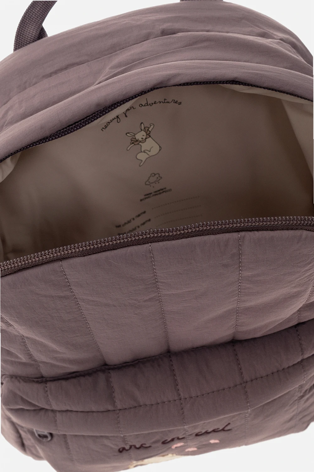 Purple and grey‘Juno’ quilted backpack from Konges Slojd. Made of fabric with the OEKO-TEX® certificate and a BIONIC-FINISH® ECO coating. Fastened with a two-way zip, this garment features an embroidered lettering, dinosaur motif, front pocket with zip fastening, side pocket, top handle, adjustable shoulder straps with buckles and one internal compartment with one slip pocket and two pen holders.