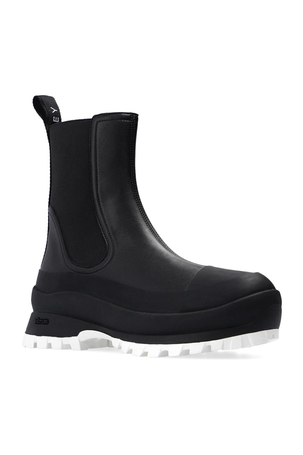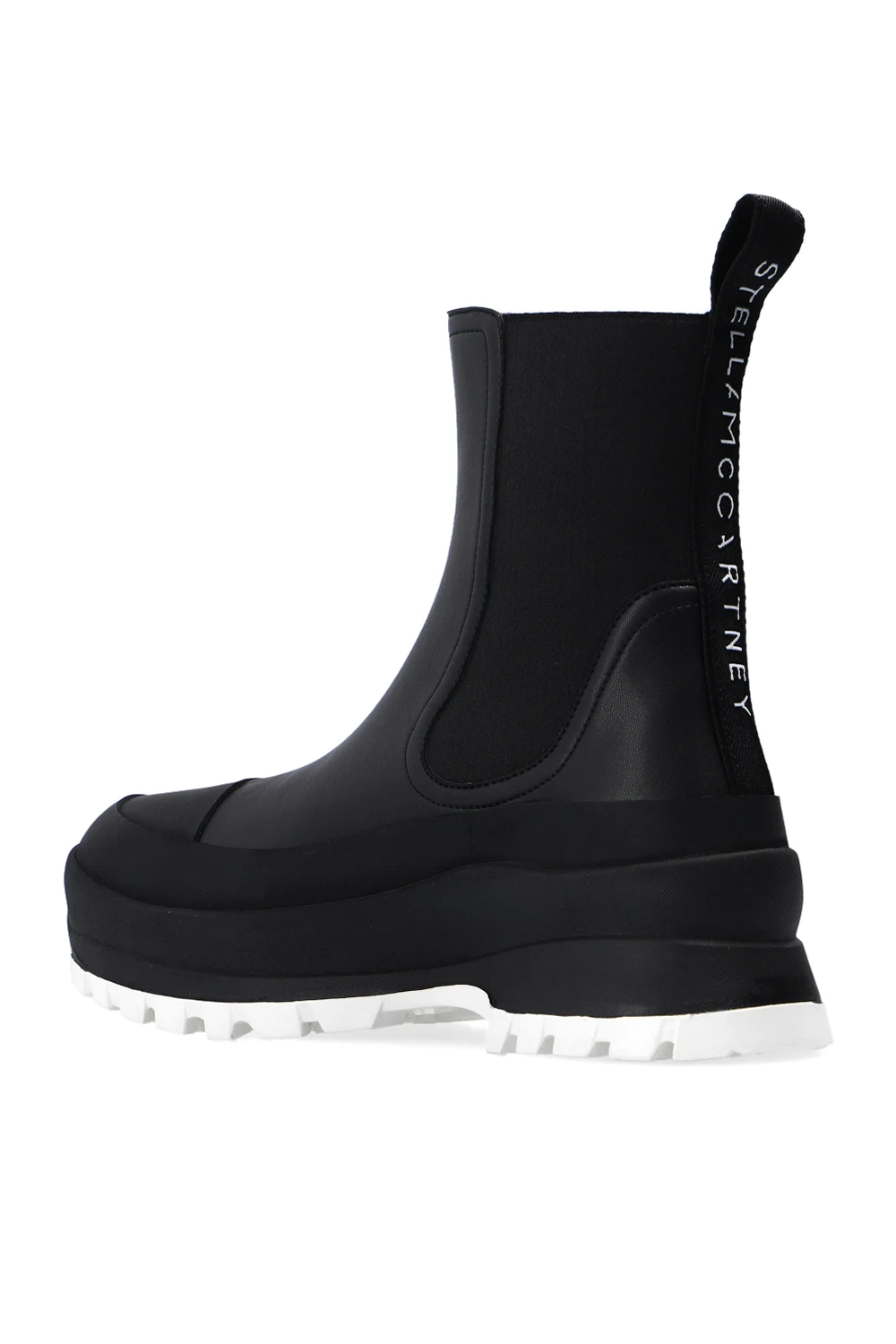 Black Chelsea boots from Stella McCartney. Resting on a white rubber sole, this pair features elastic side panels and a white logo embroidered at the back.