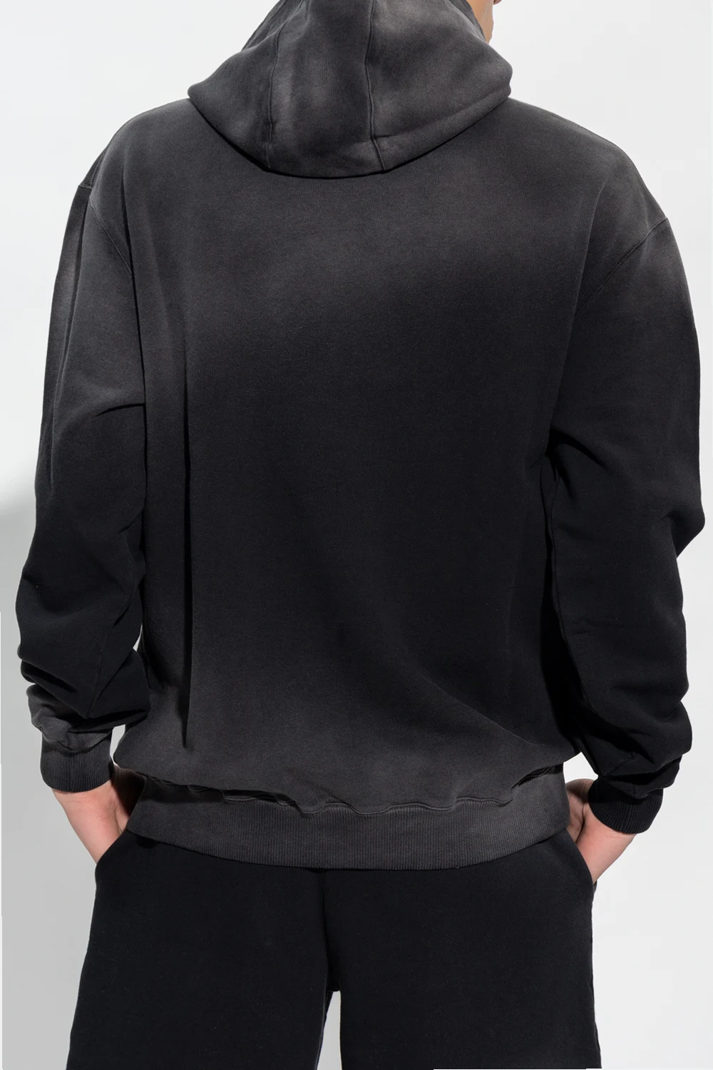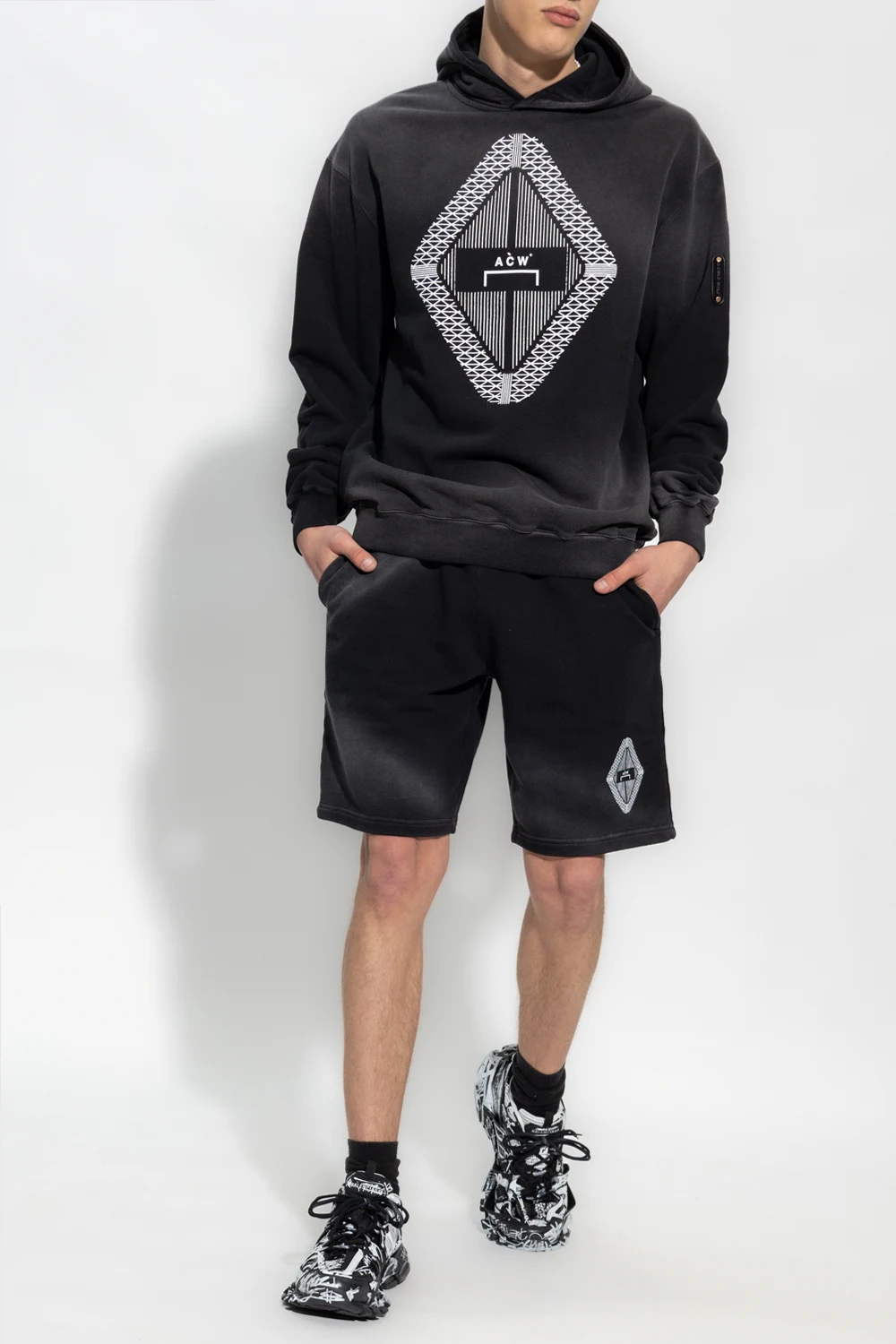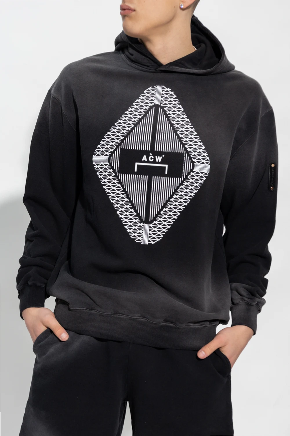 Black and grey sweatshirt with a drawcord-adjustable hood from A-COLD-WALL*. Crafted from cotton jersey, this style features a white logo print on the front, a sleeve patch with a logo and ribbed trims on the bottom hem and cuffs.