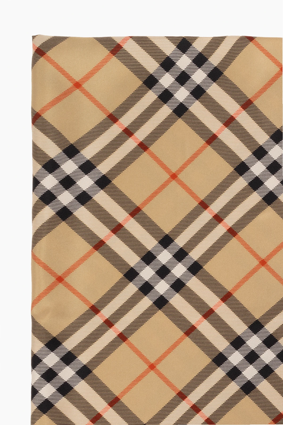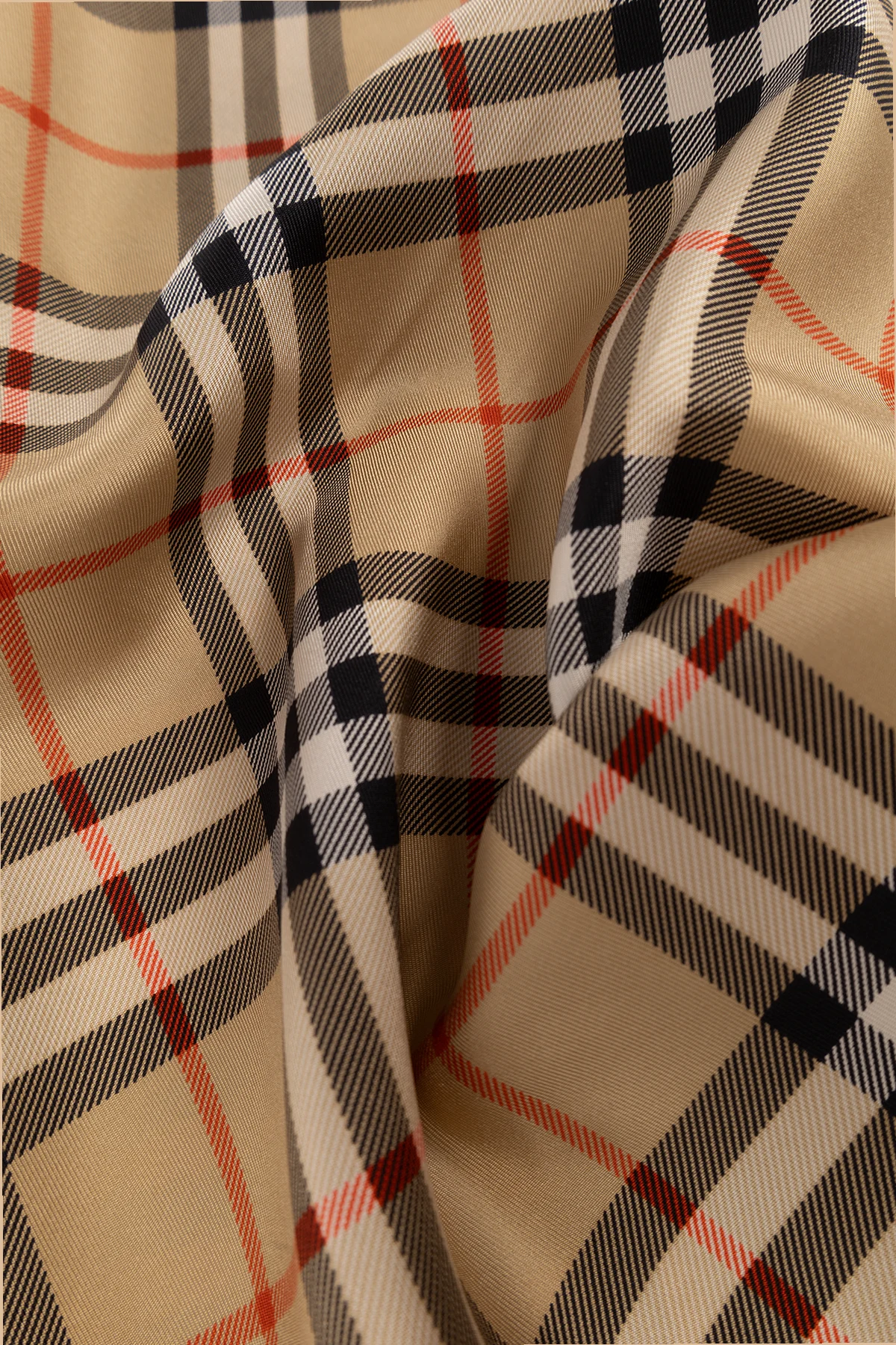 Beige, black and red shawl from Burberry. Made of silk, this item showcases a check pattern and red piping on the edges.