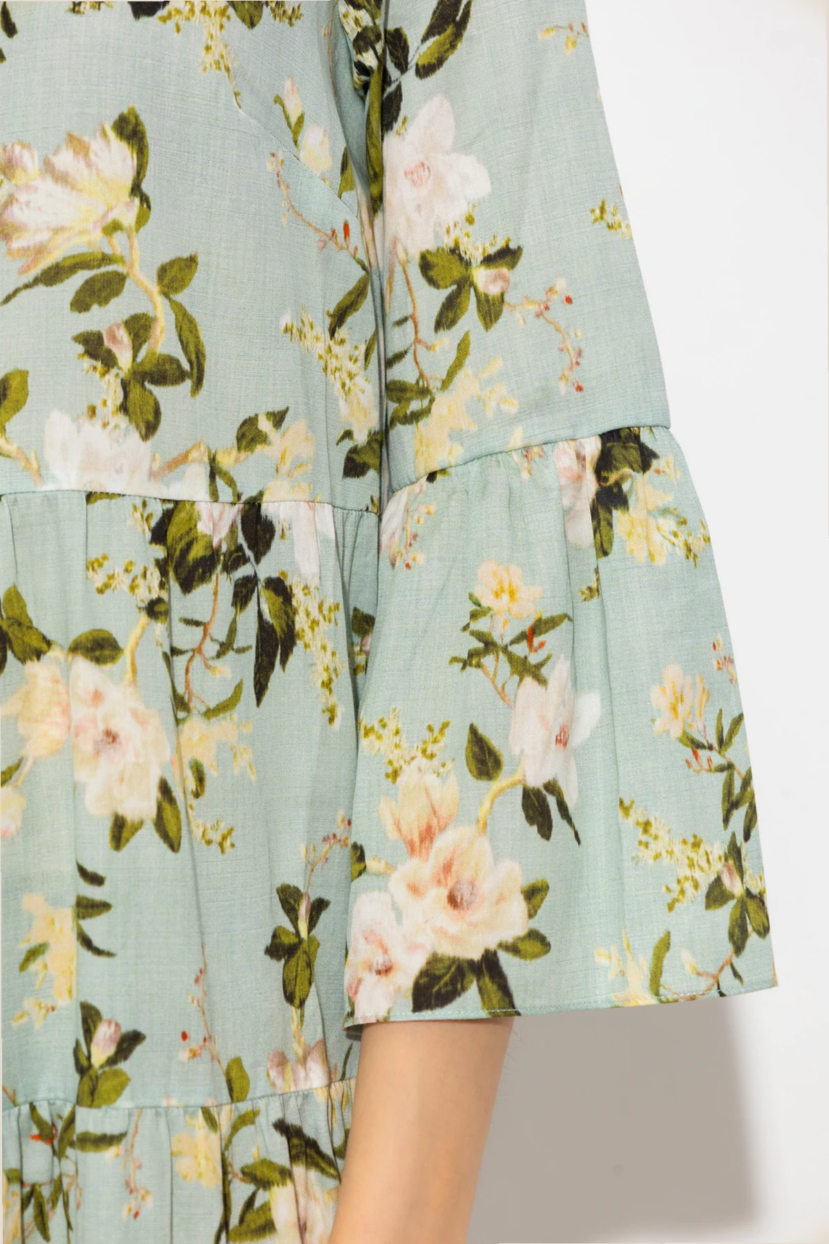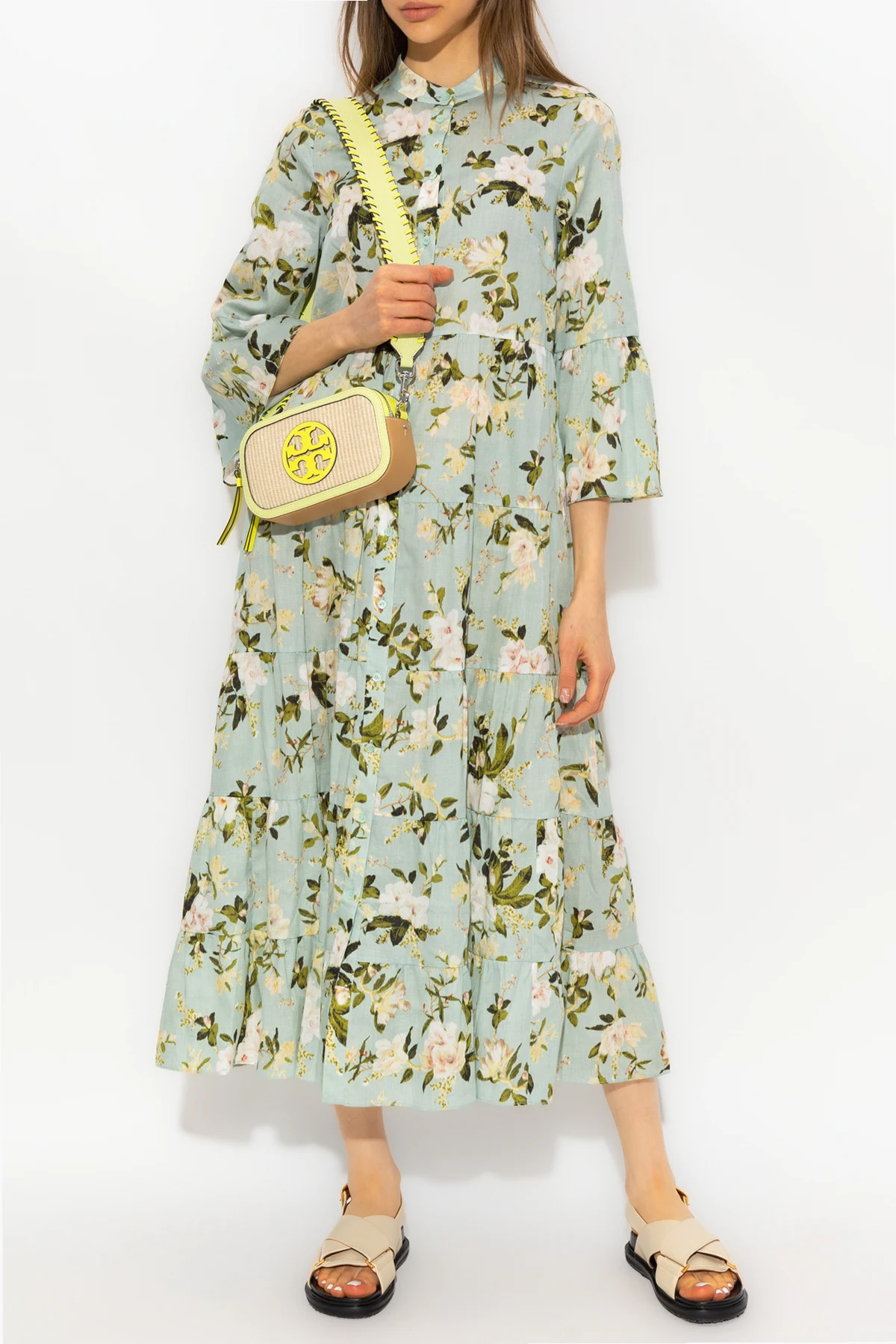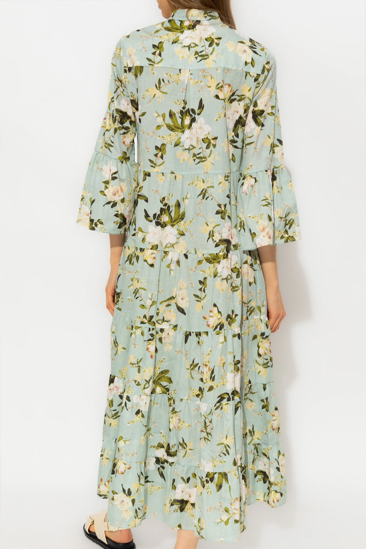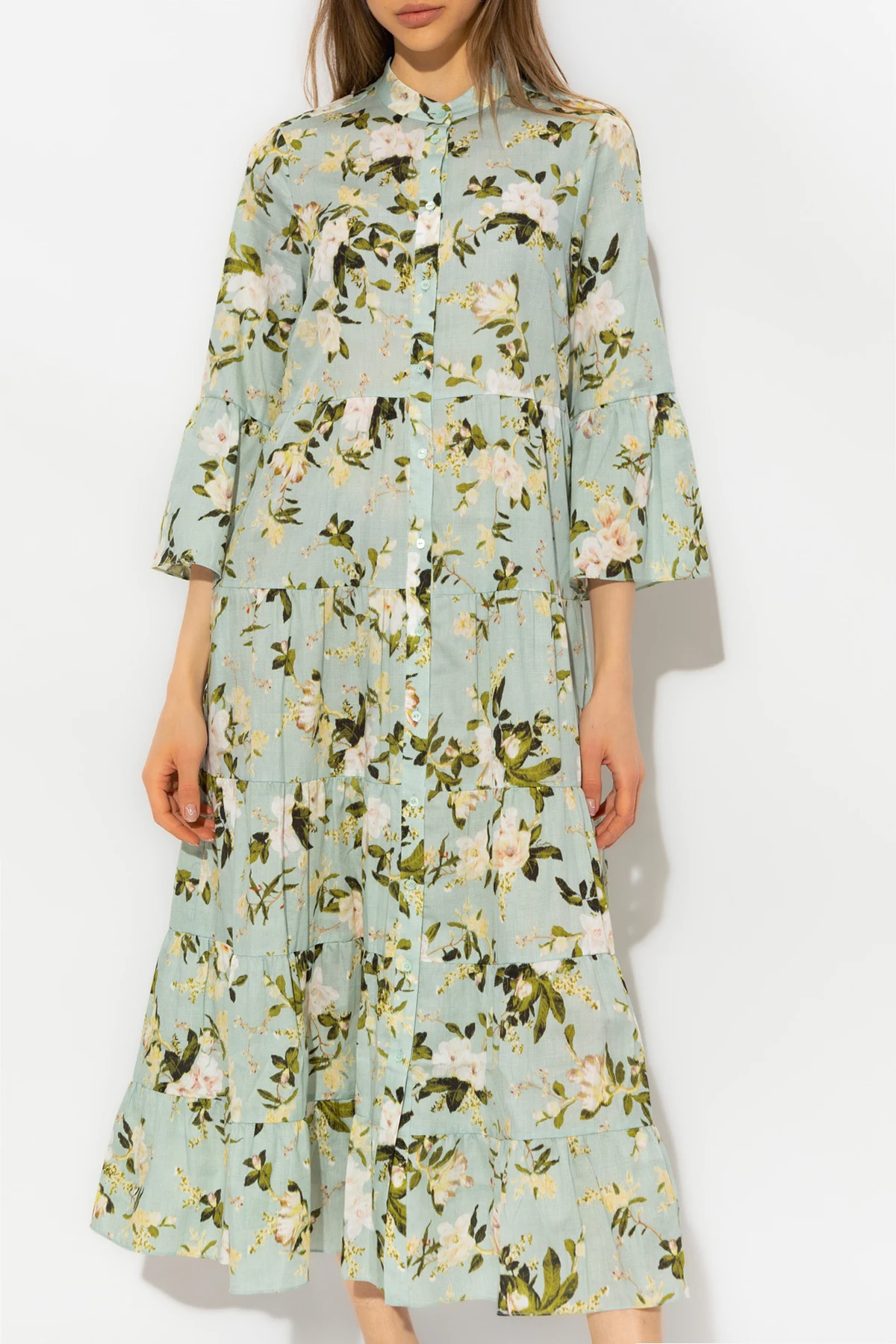 Blue ‘Panthea’ dress from Erdem. Made of cotton with a flared hem, this style fastens with buttons on the front and showcases a floral pattern. It is complete with a round neck, two slip pockets and ruffles on the sleeves.