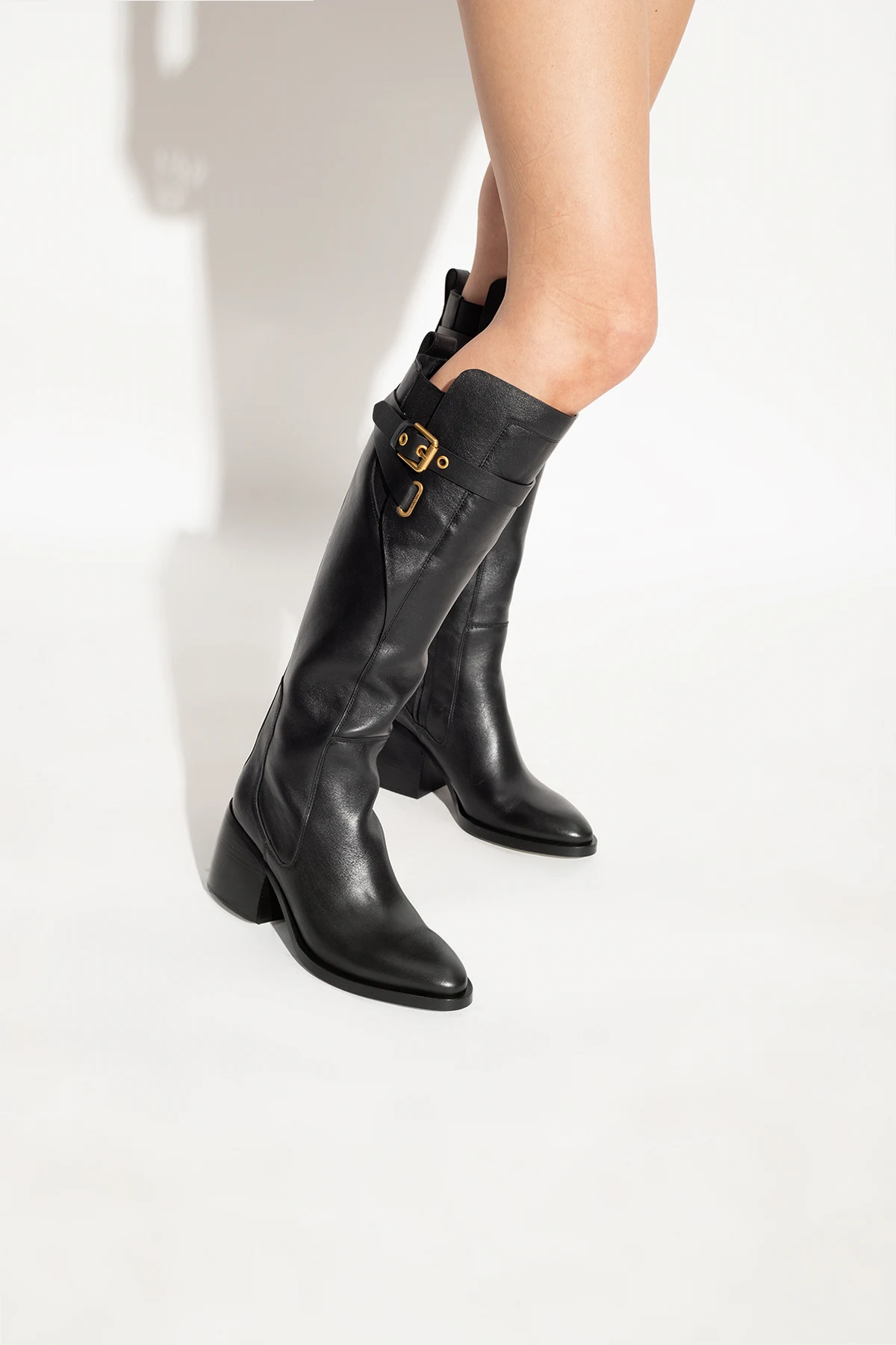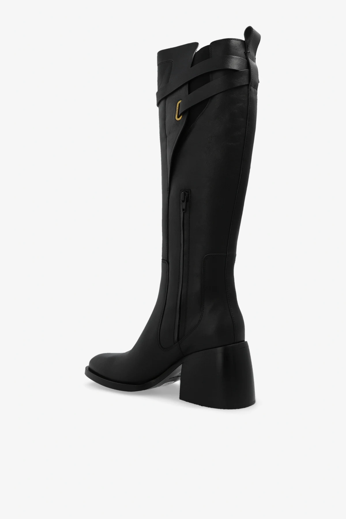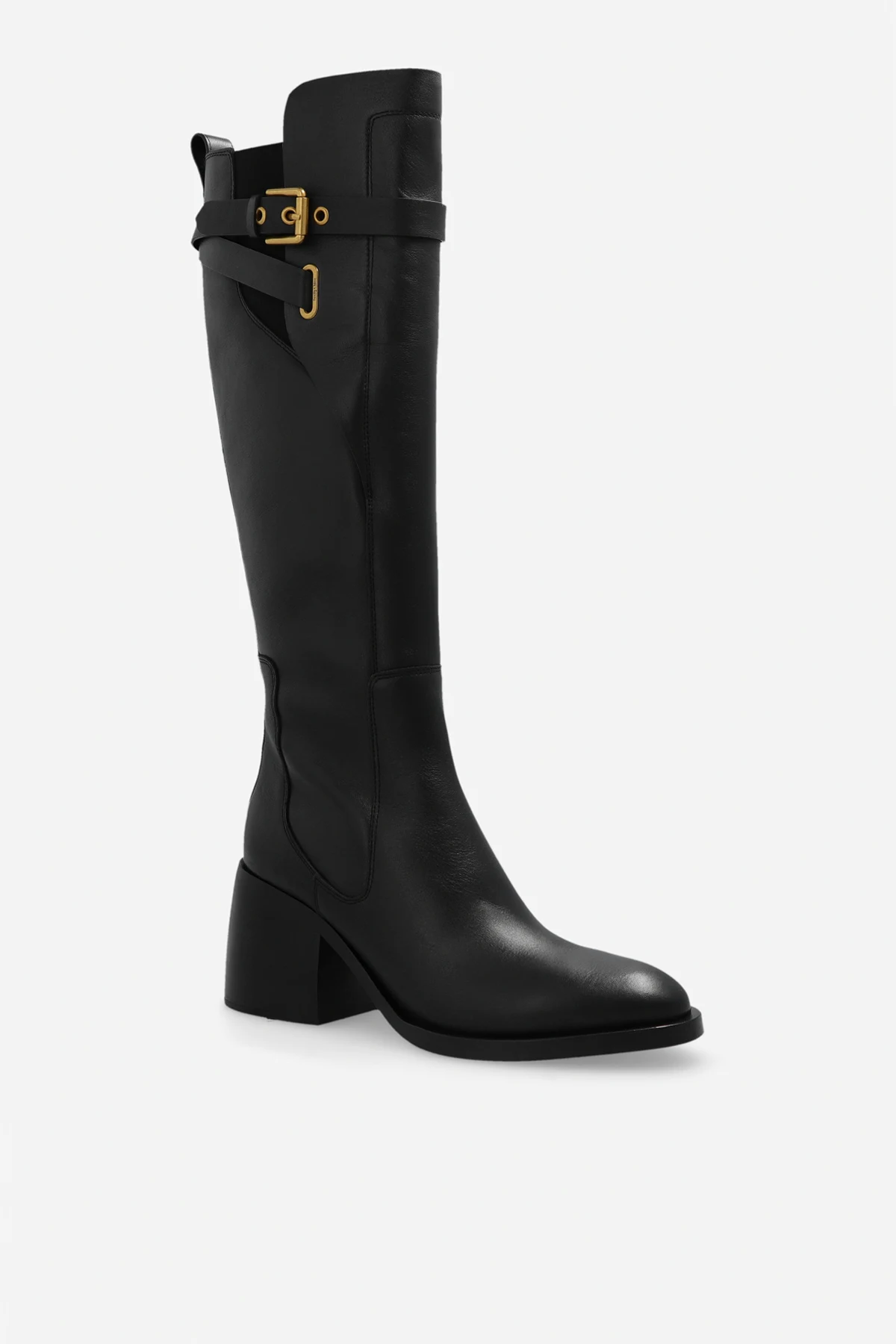 Black ‘Averi’ heeled knee-high boots from See By Chloe. Made of leather with an almond-shaped toe, this model sits on a black leather sole and features an adjustable strap with a logo-engraved buckle and elastic panels accompanied with a zip closure on the sides.