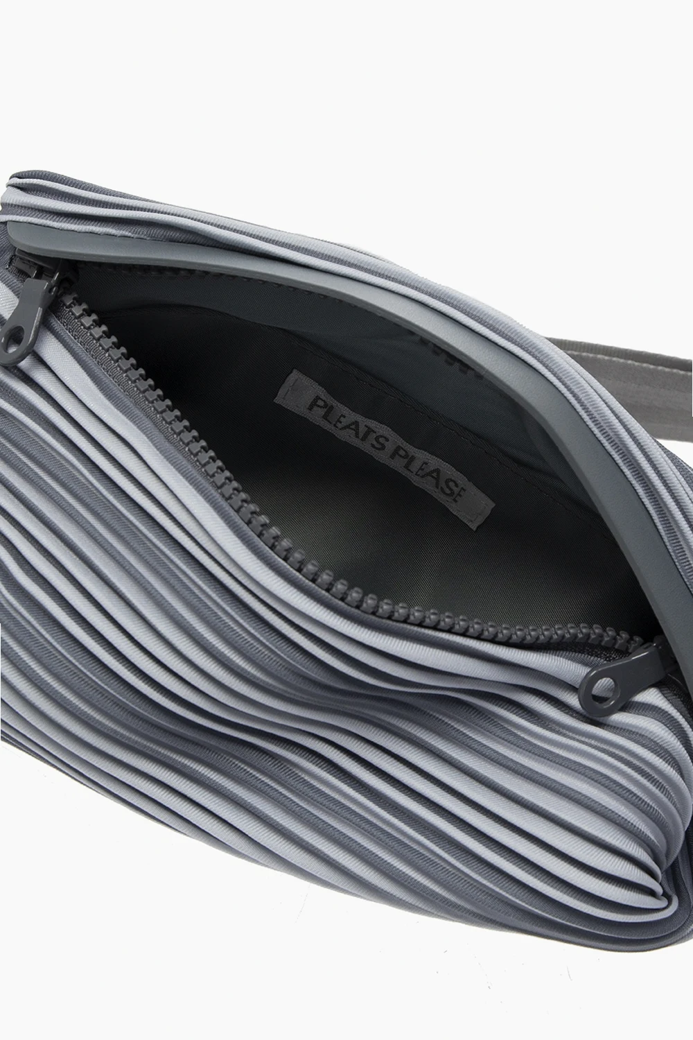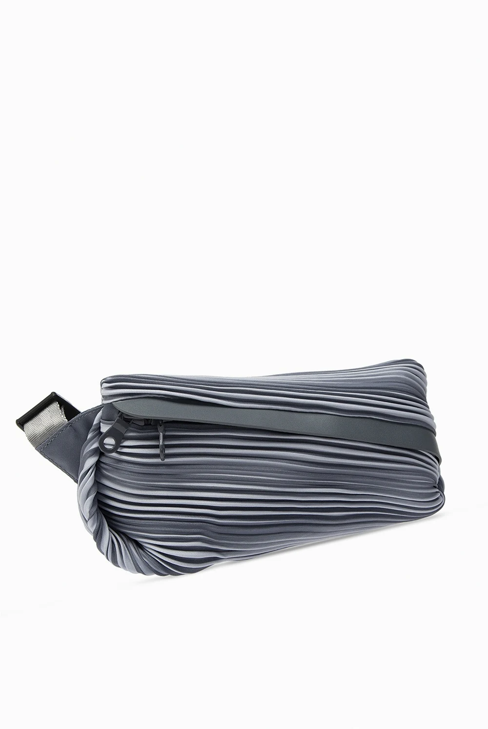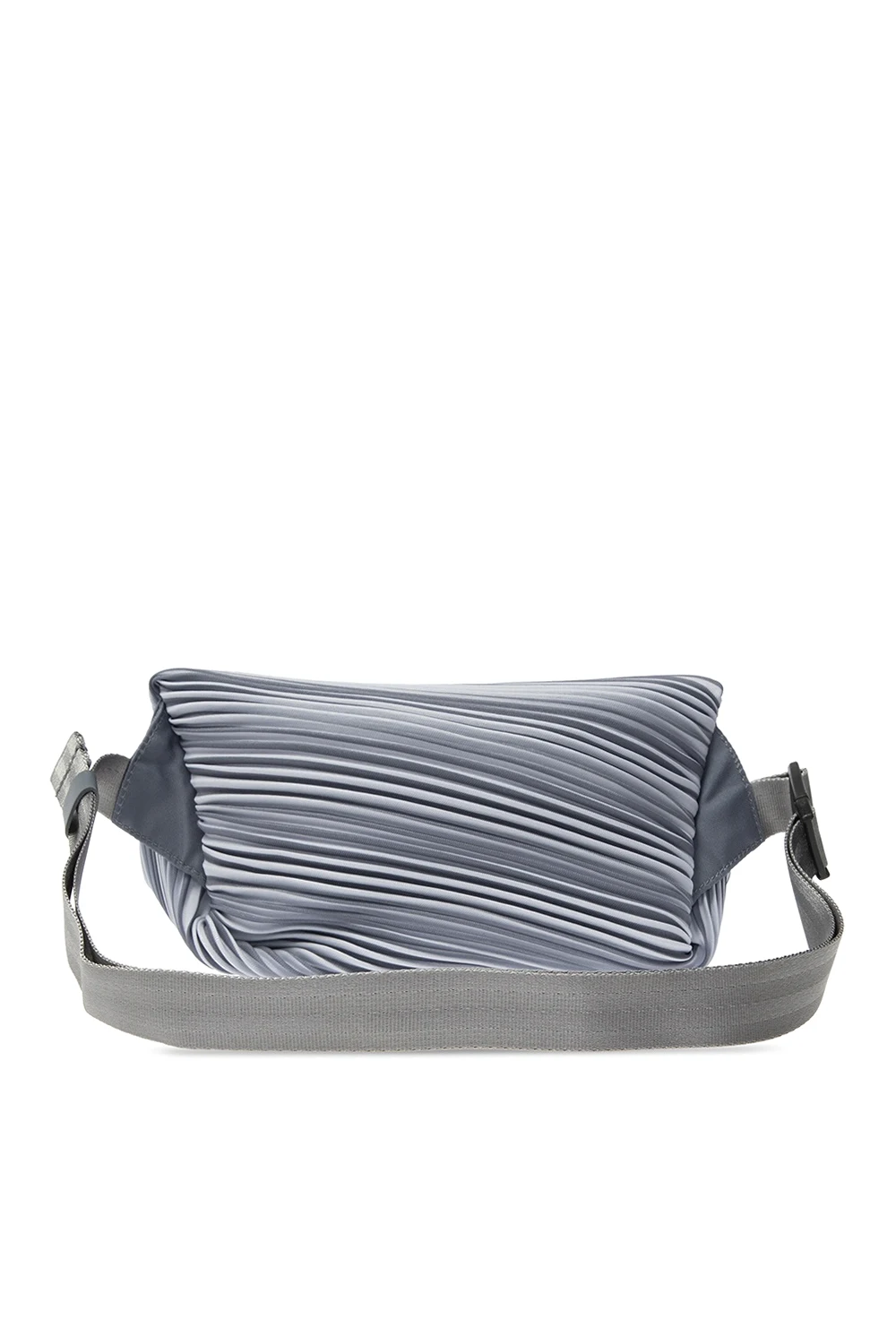 Grey belt bag from Issey Miyake Pleats Please. Designed with the label's signature pleating, this item has zip fastening, an adjustable strap and interior with one compartment and one slip pocket.