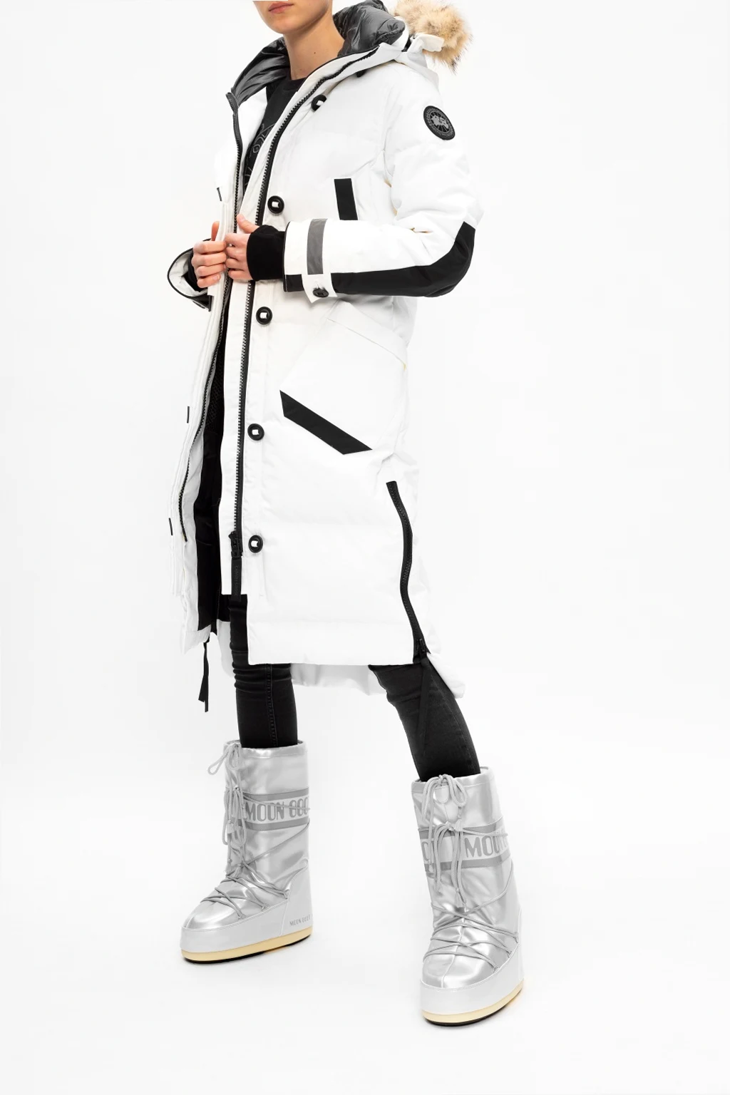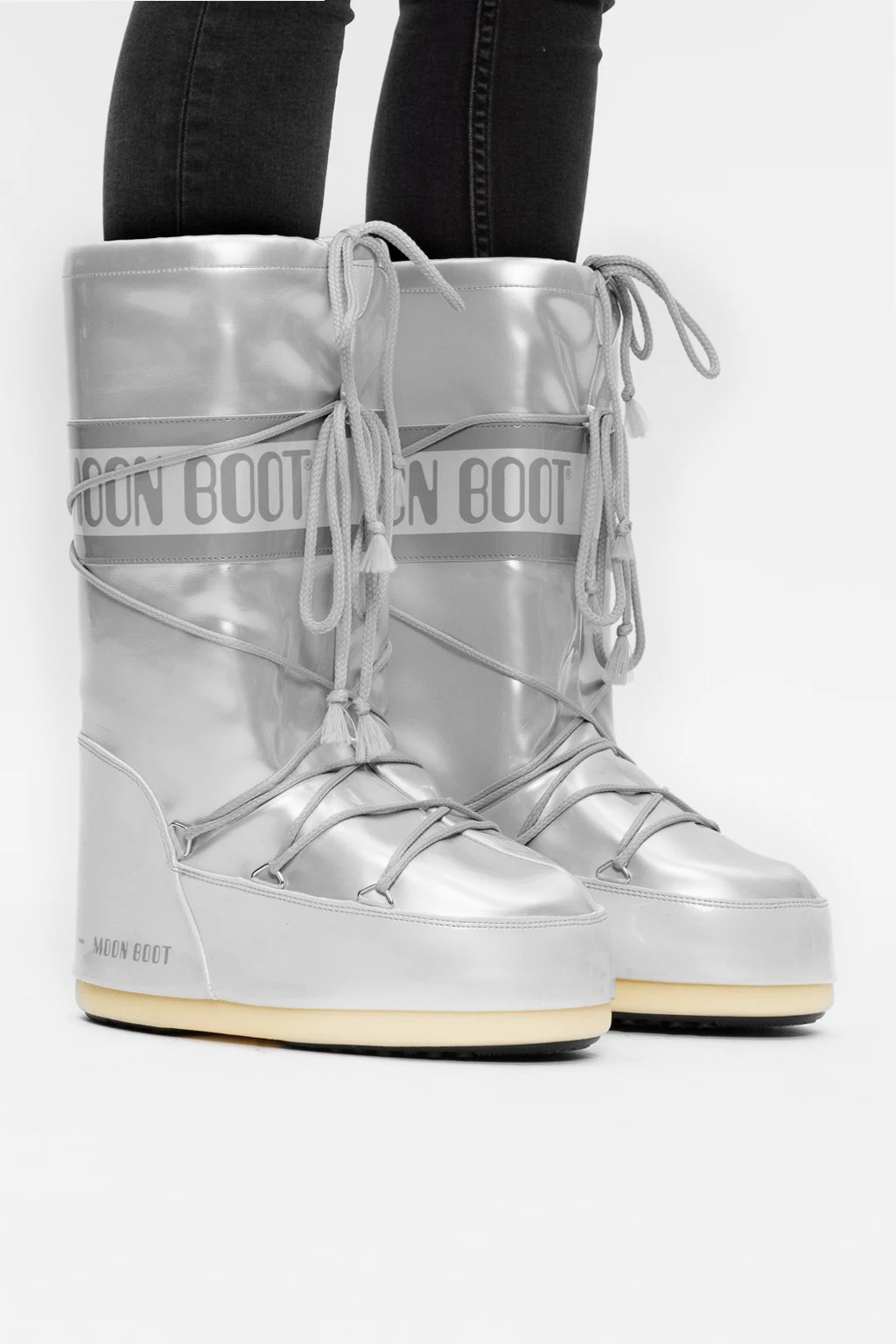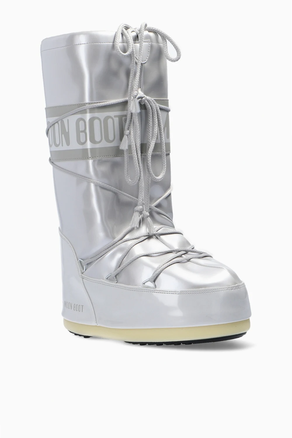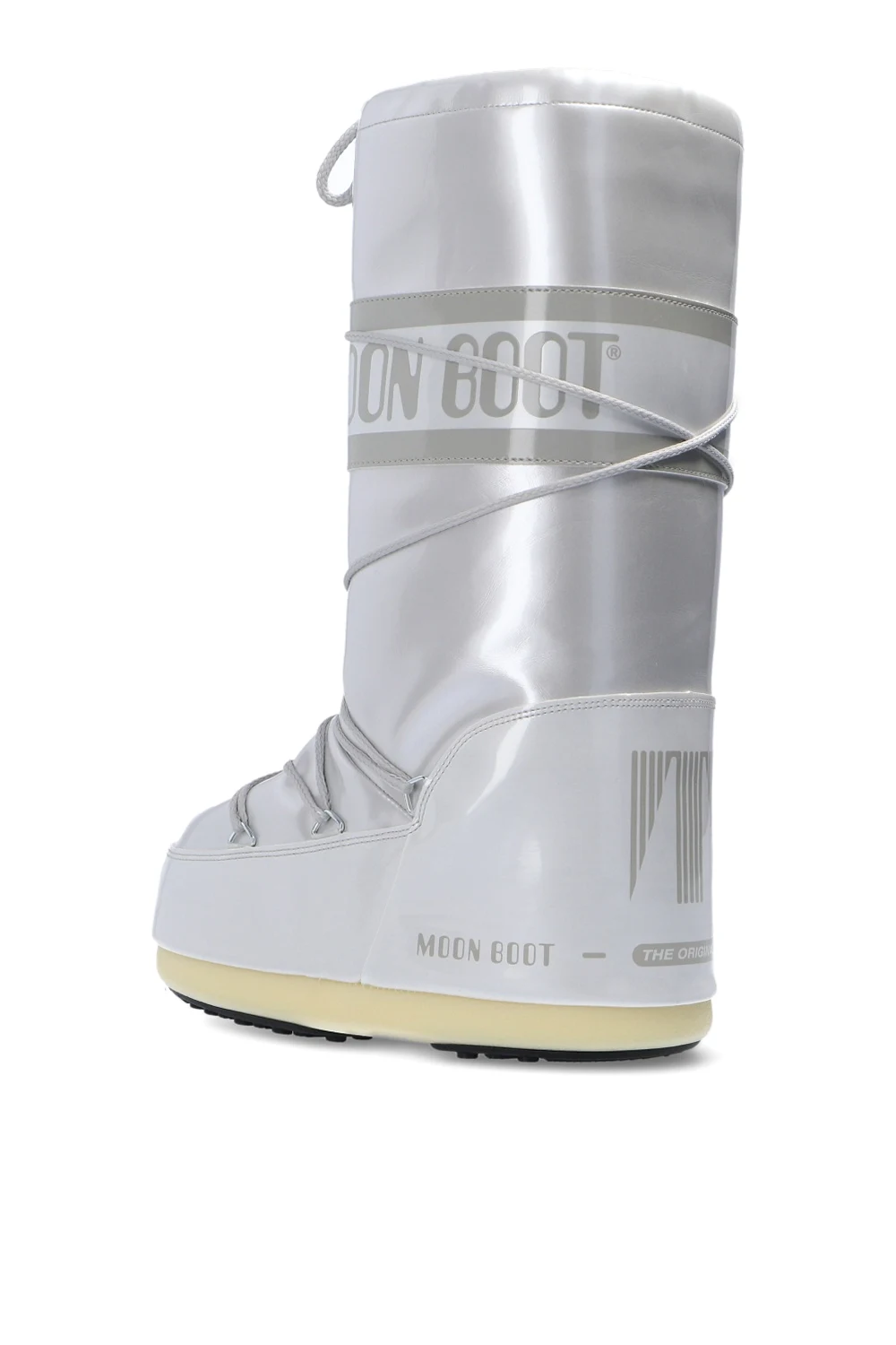 Silver-tone ‘Vinile Met’ lace-up snow boots from Moon Boot. This high-top design features a logo print, metallic finish, silver-tone metal hardware and a rubber sole in beige and black. Inspired by the peculiar shape and technology of the astronauts’ boots, the iconic style was designed in 1969 after the first Moon landing.