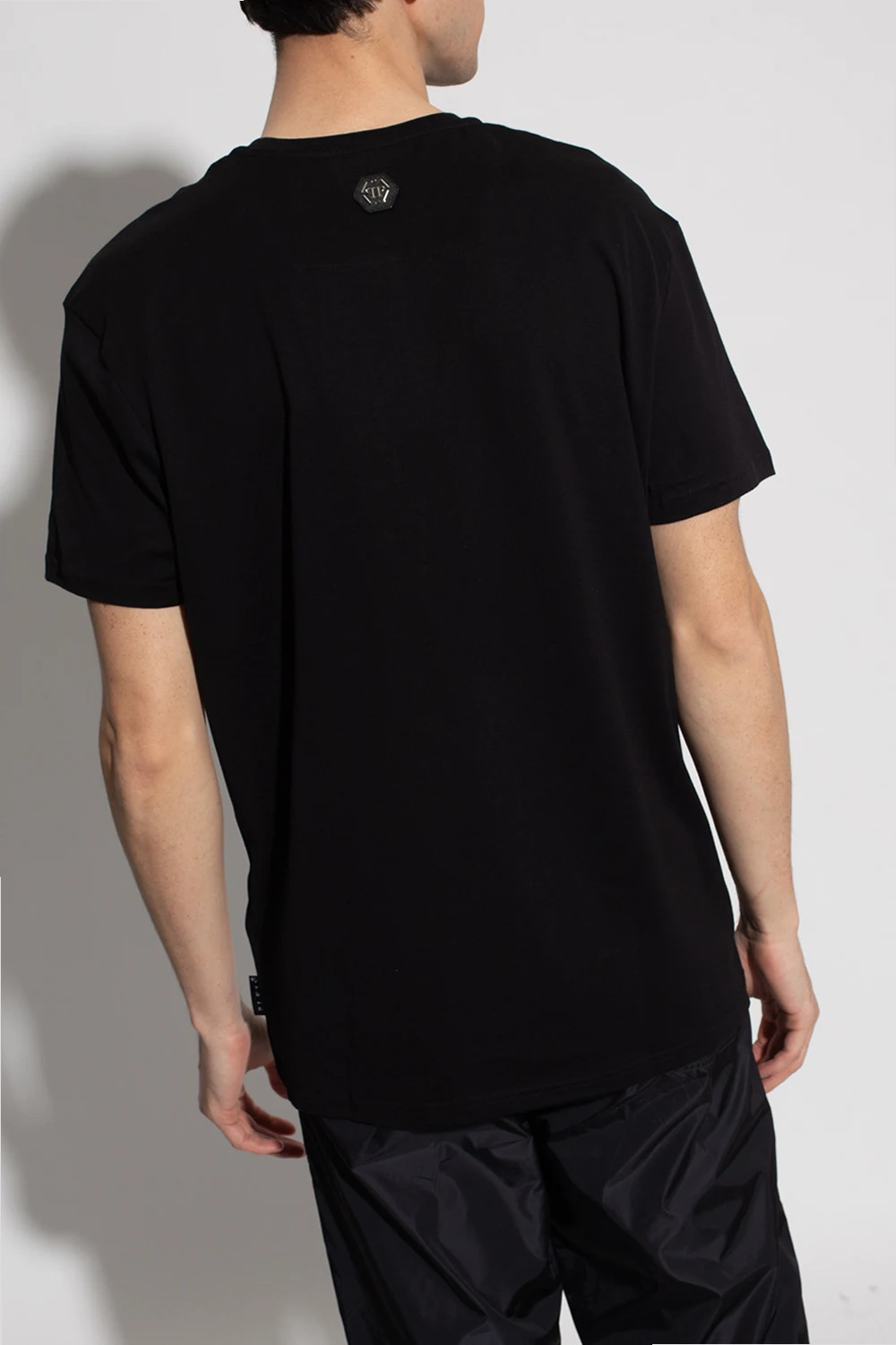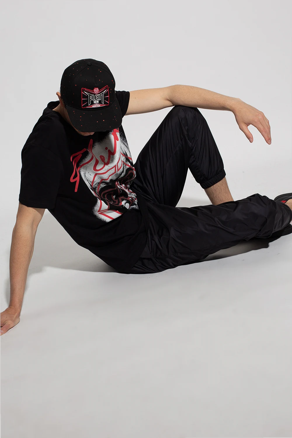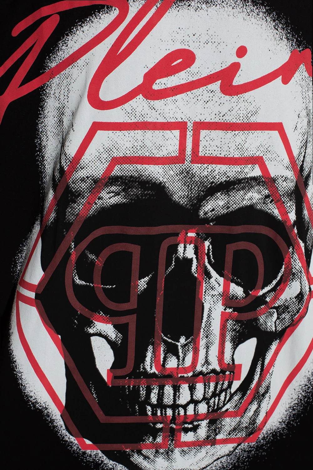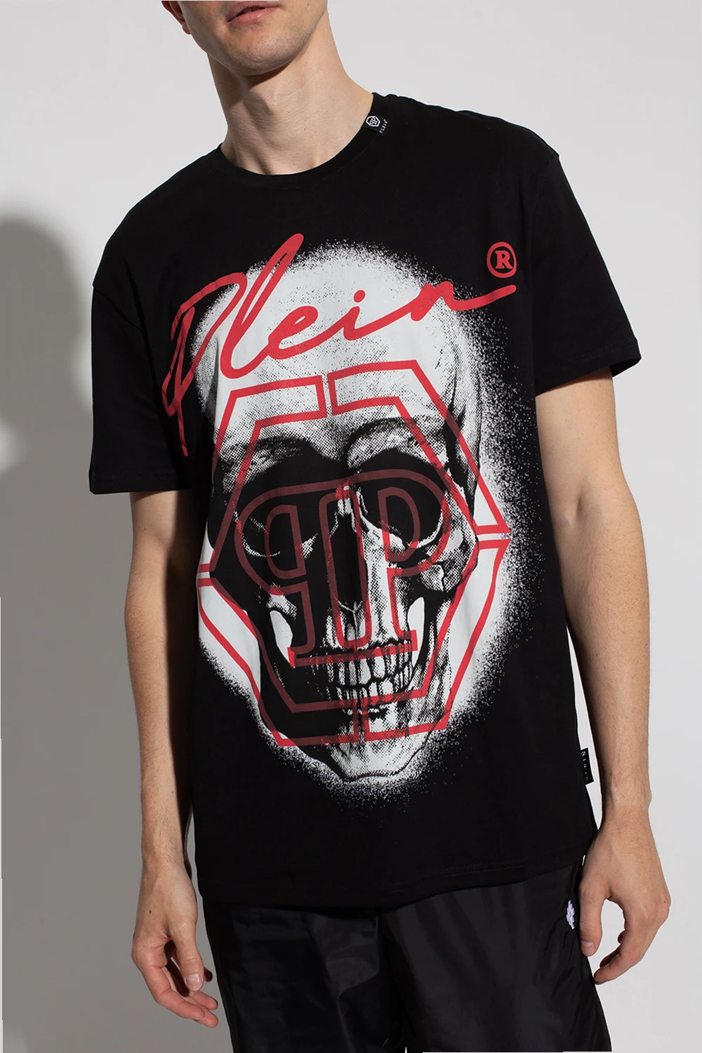 Black crewneck T-shirt from Philipp Plein. Made of cotton, this style showcases short sleeves, rib detailing on the collar and a white, red and black graphic print with the brand's logo.