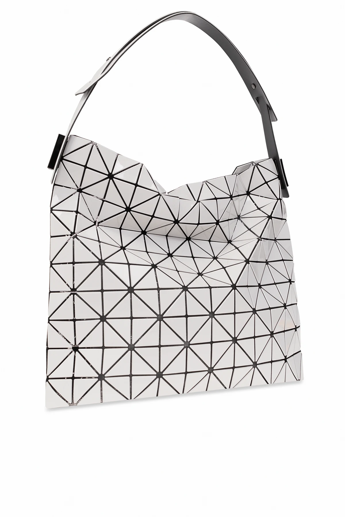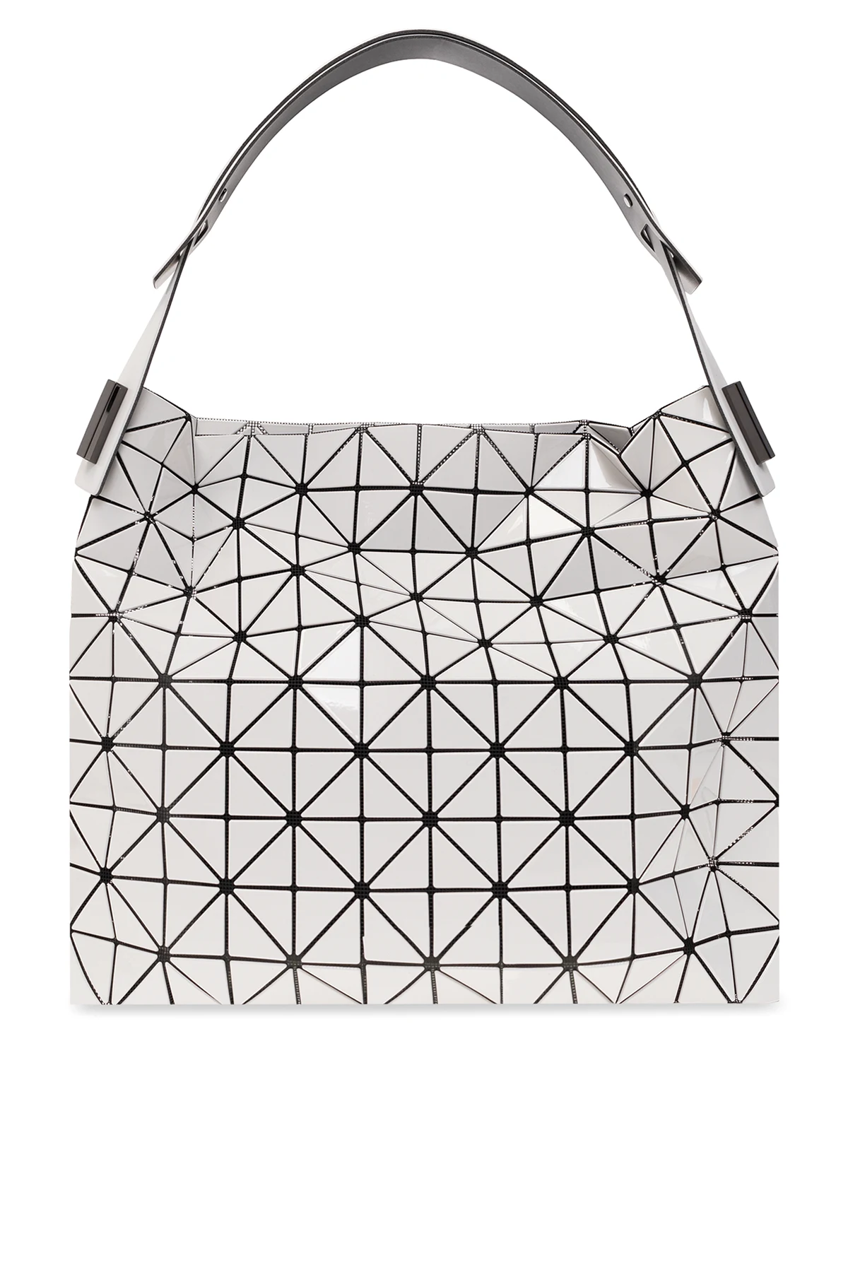 White and black shopper bag from Bao Bao Issey Miyake. Decorated with geometric inserts, this model features a shoulder strap, black metal hardware and one internal compartment with one slip pocket.