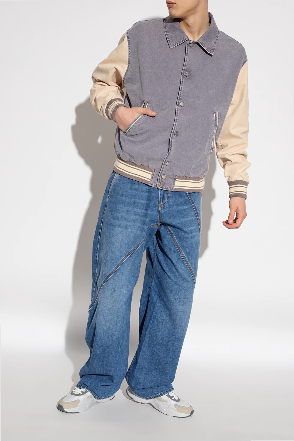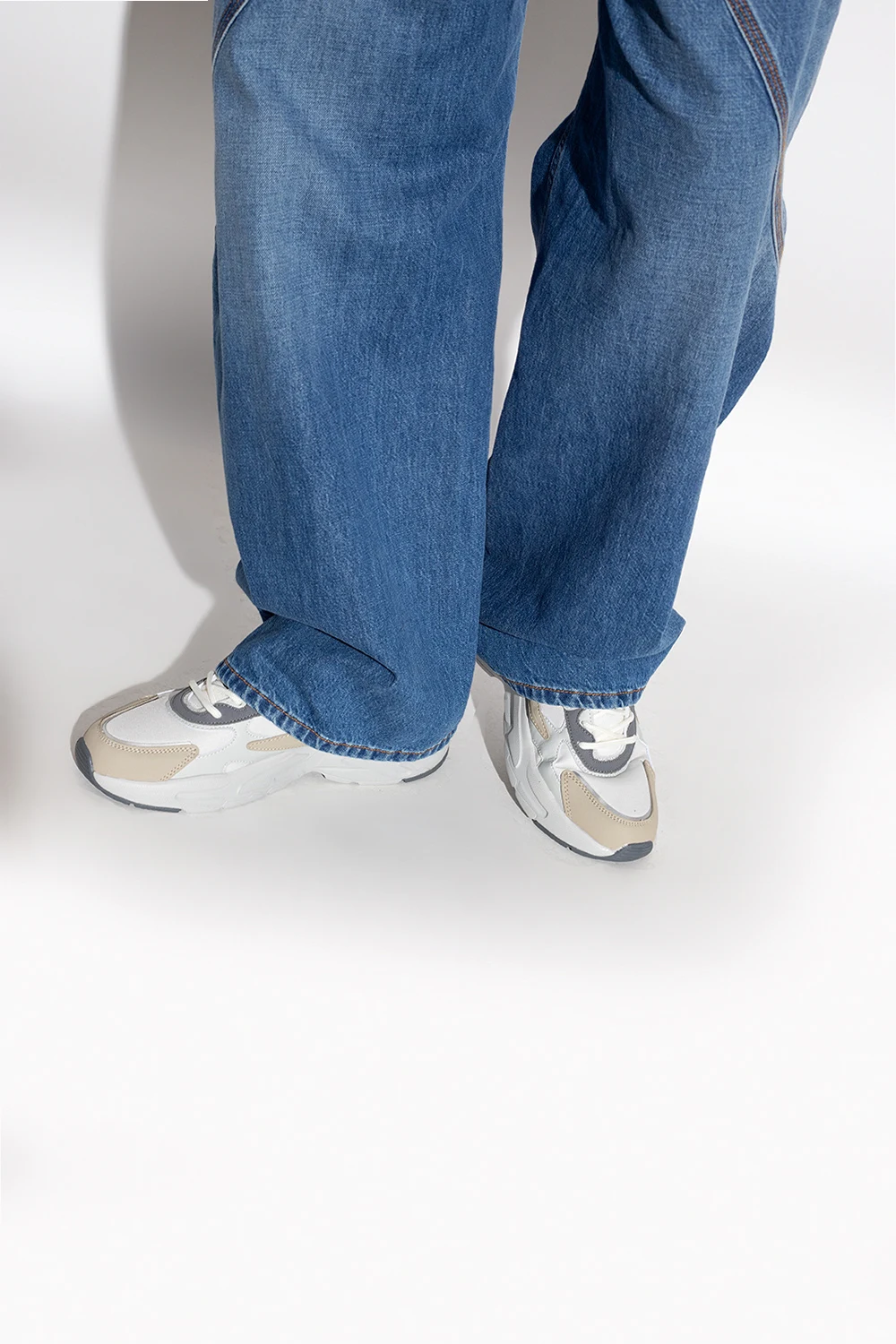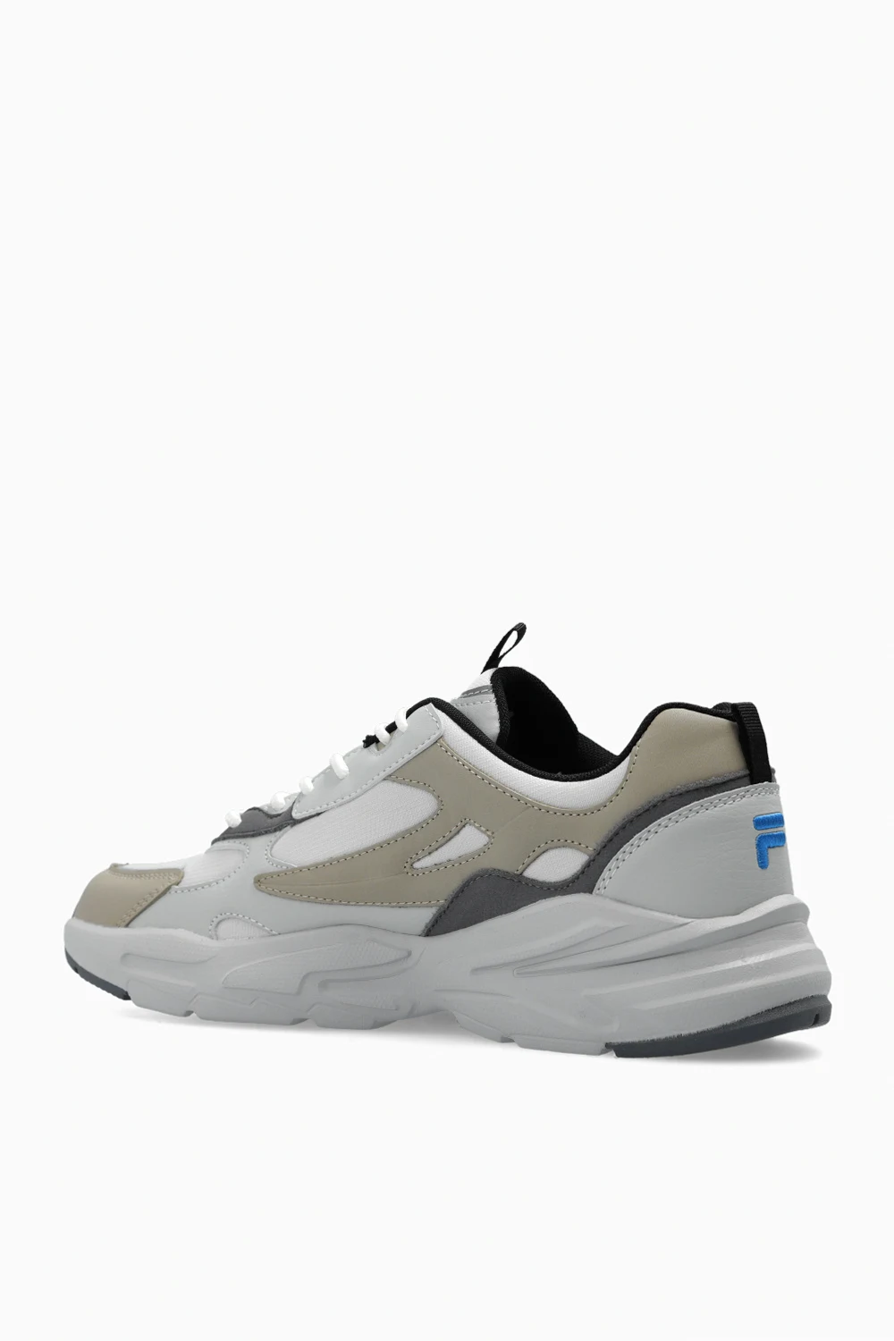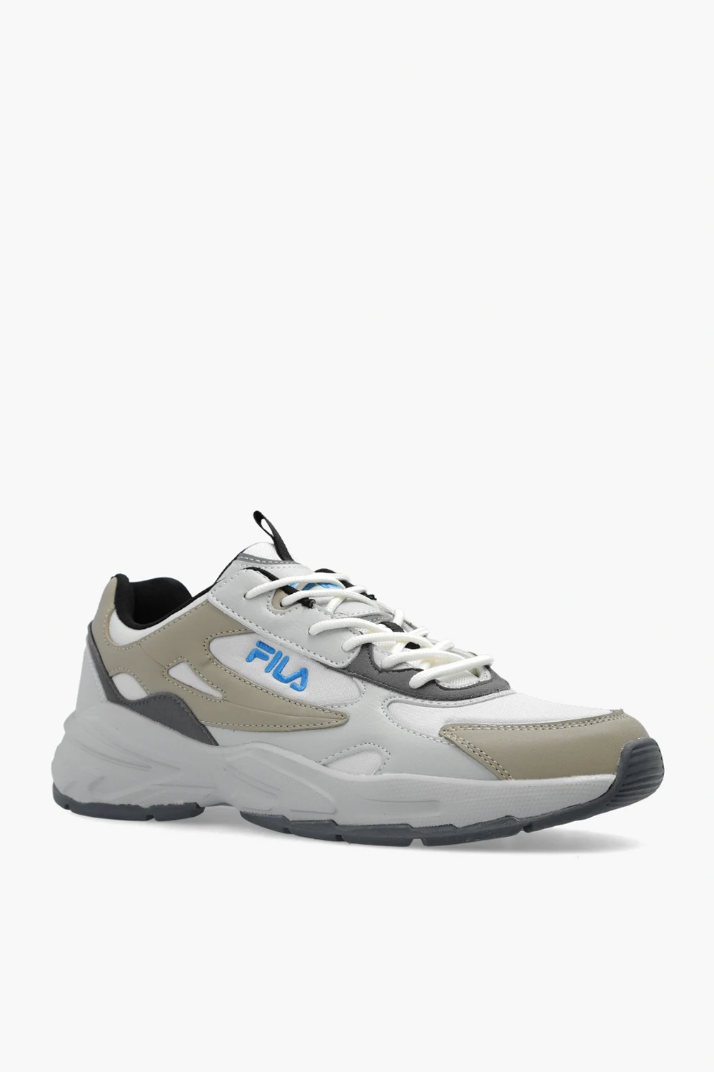 Grey and beige ‘Novarra’ sneakers from Fila. Crafted from fabric and faux leather, this lace-up model sits on a grey rubber sole and features blue logo embroidery on the front, side and back.