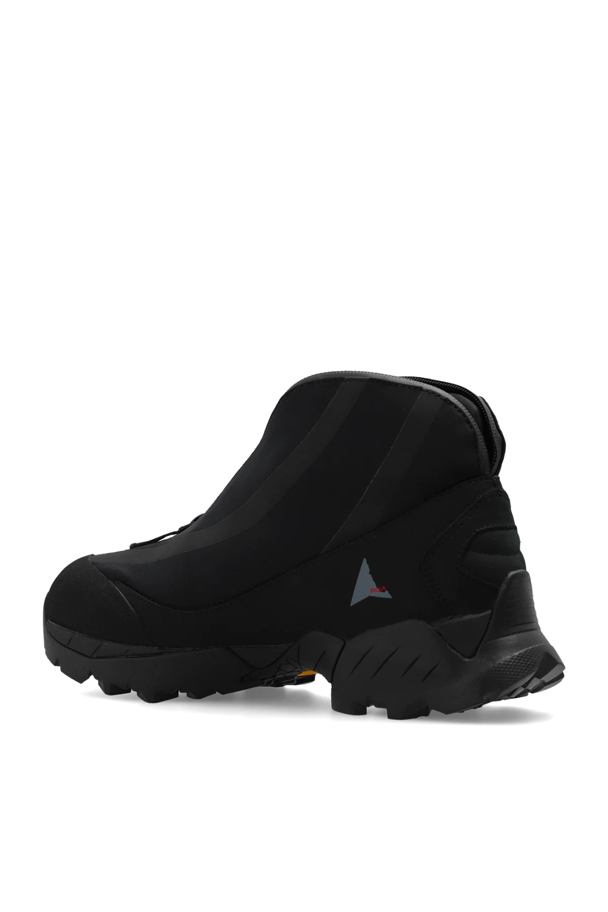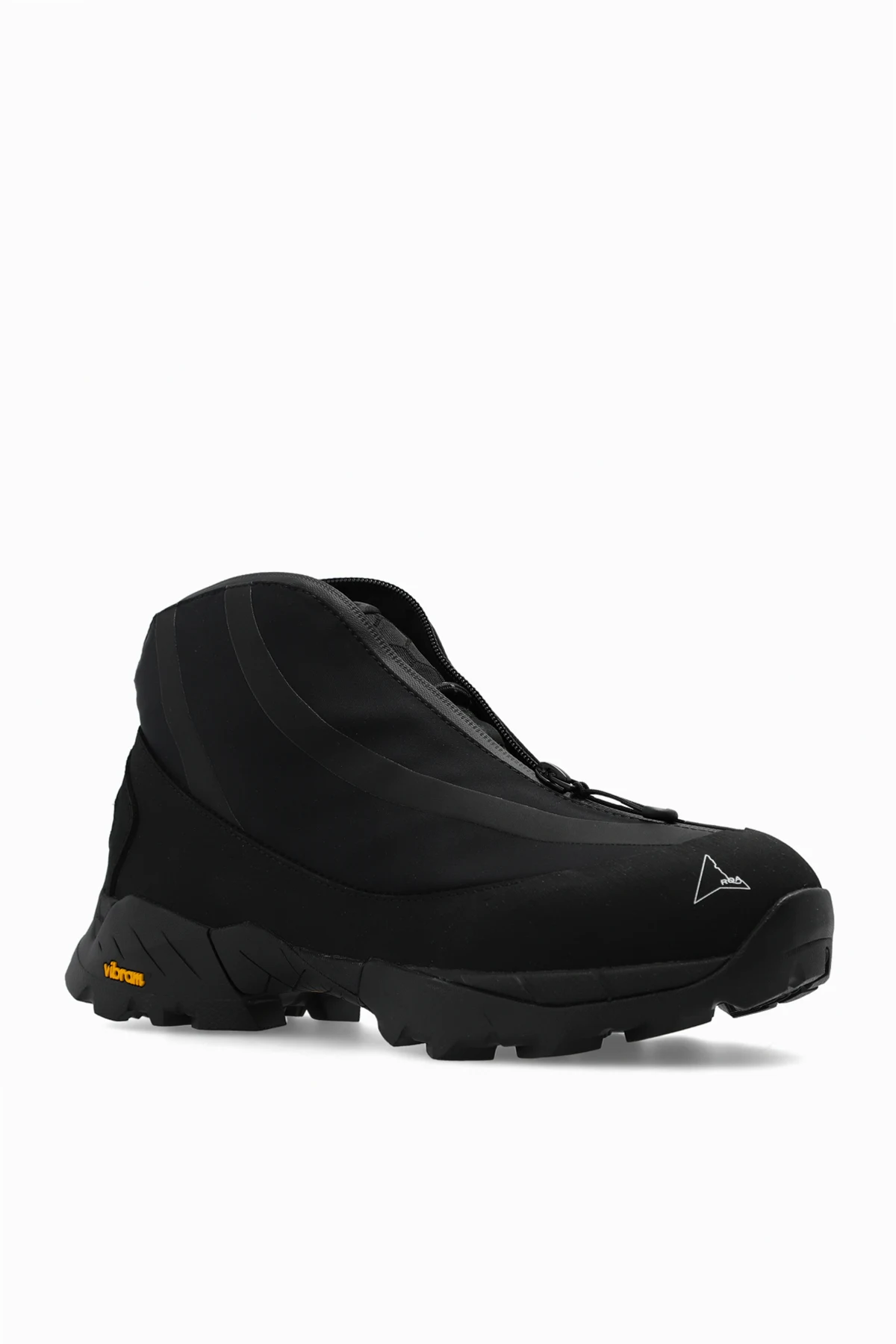 Black ‘Teri’ lace-up boots from ROA. Crafted from contrasting fabrics, this lace-up pair features a zip fastening, logo print on the toe and side, and sits on a black Vibram® rubber sole with a tread pattern sole designed for optimal traction and to ensure high resistance to use on roughest surfaces.
