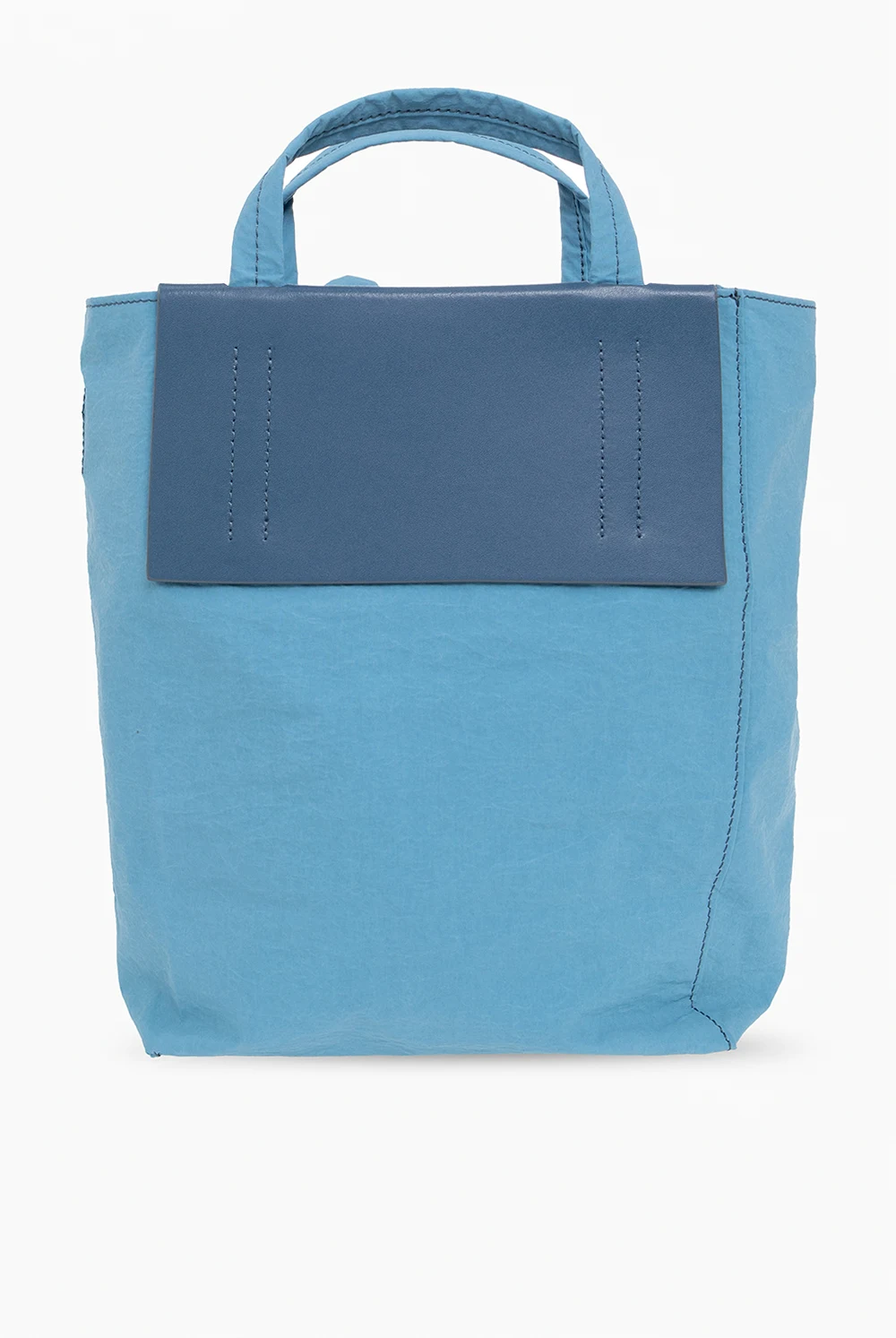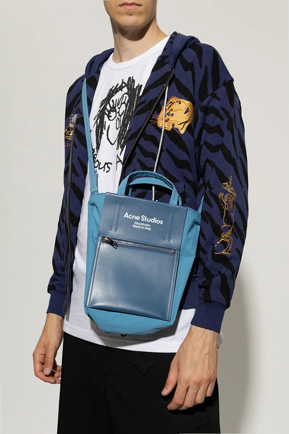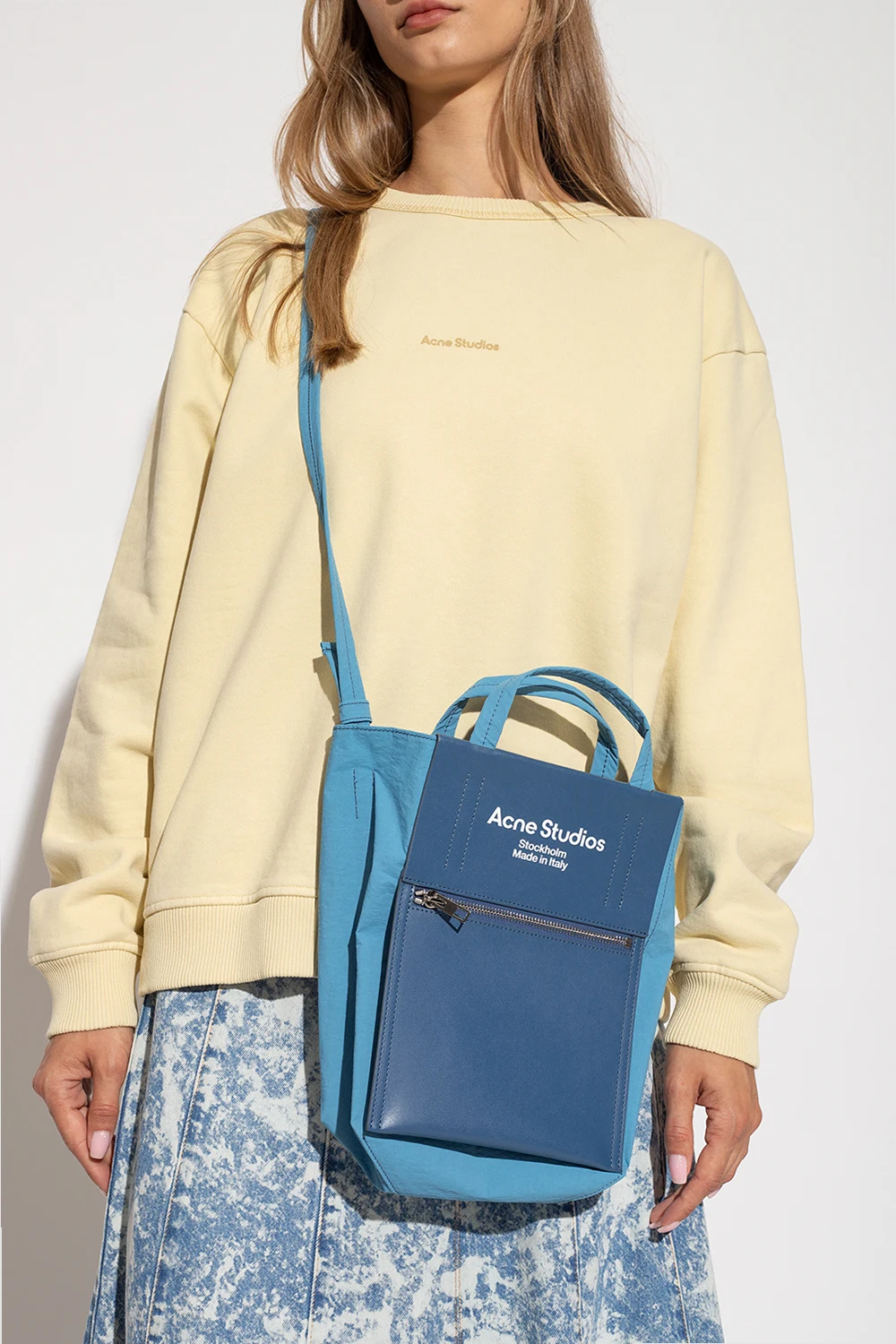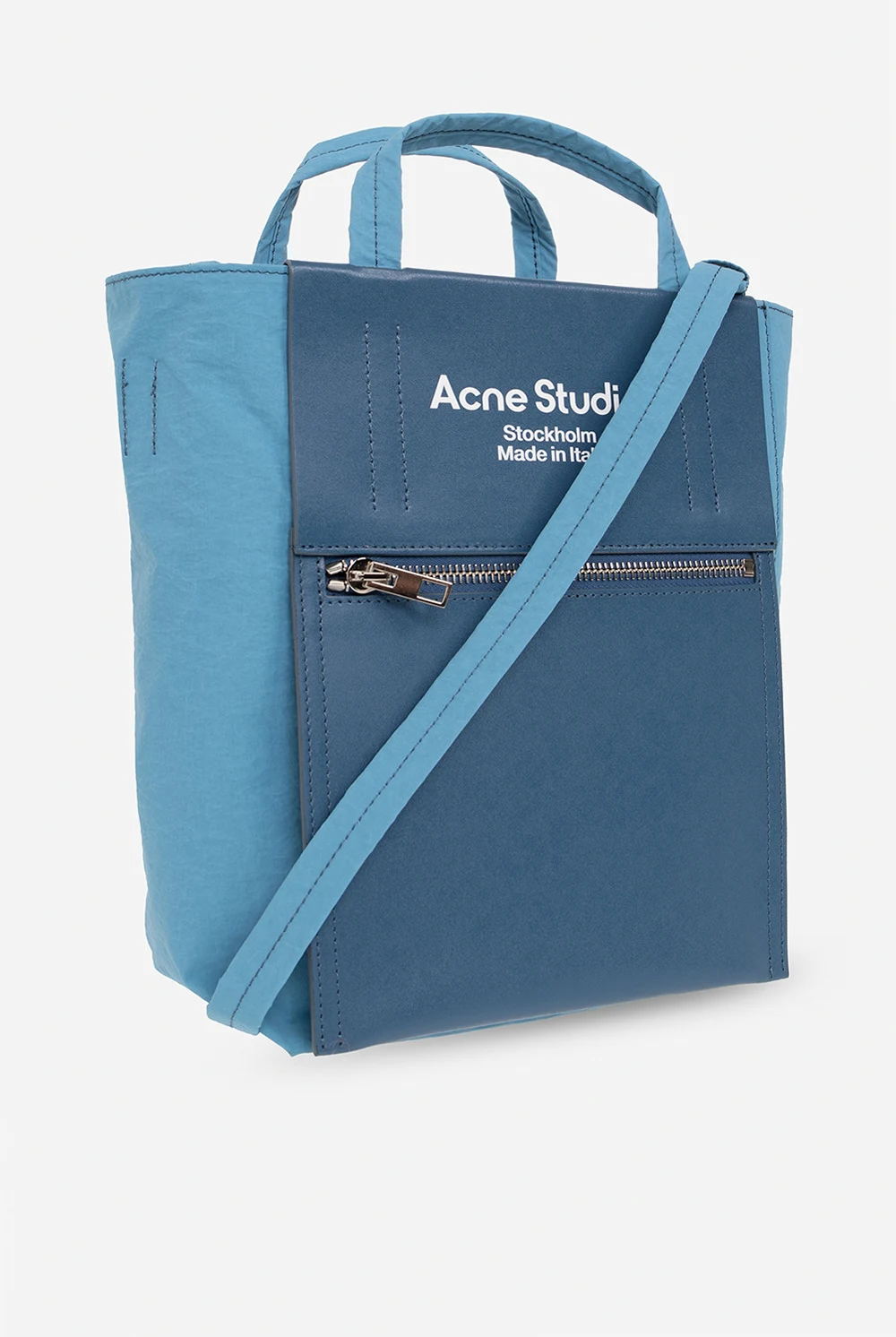 Blue shopper bag from Acne Studios. Made of textured fabric with calf leather trims, this model features a front zip pocket, white logo print, two half-round handles, detachable shoulder strap, one internal compartment and silver-tone metal hardware.