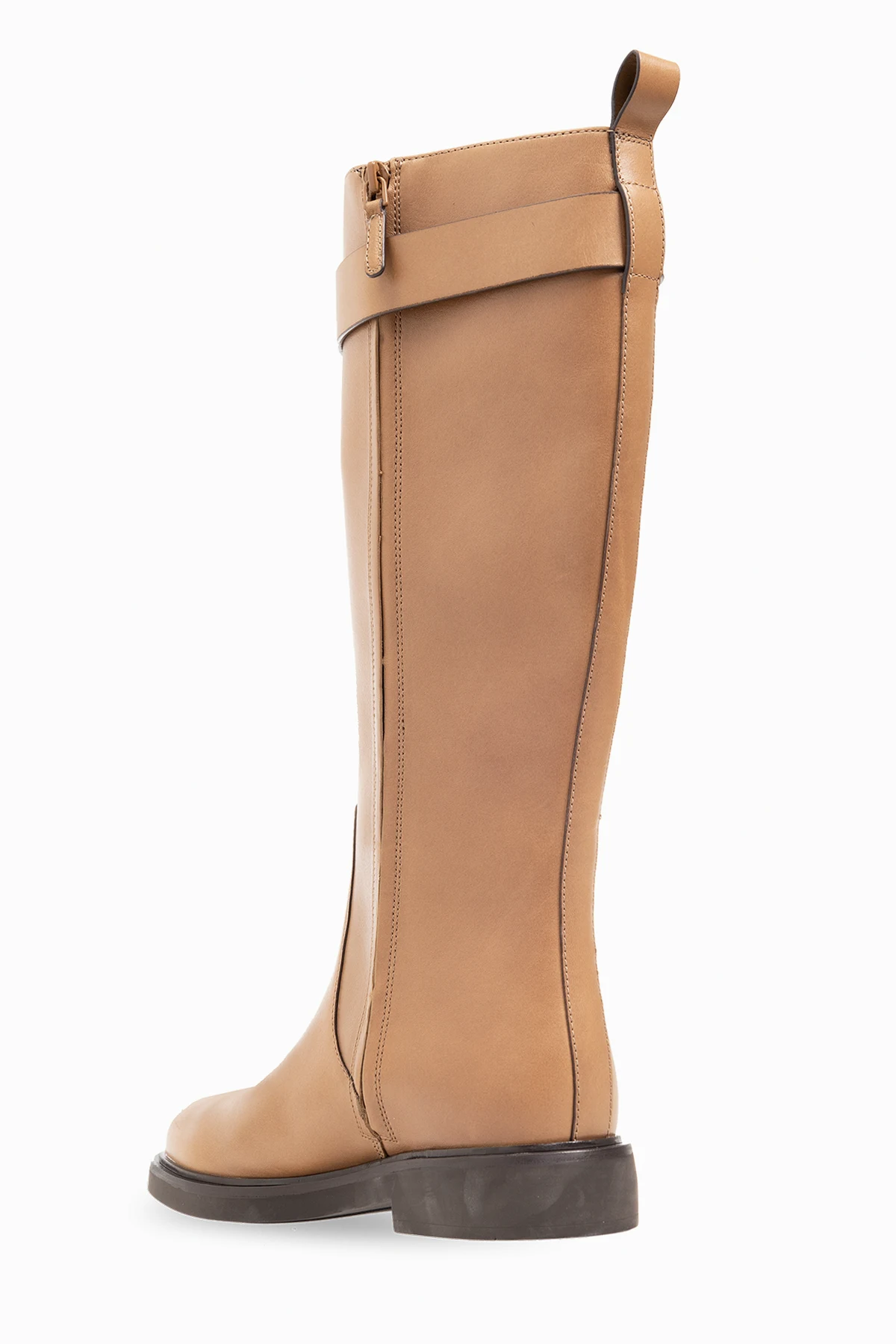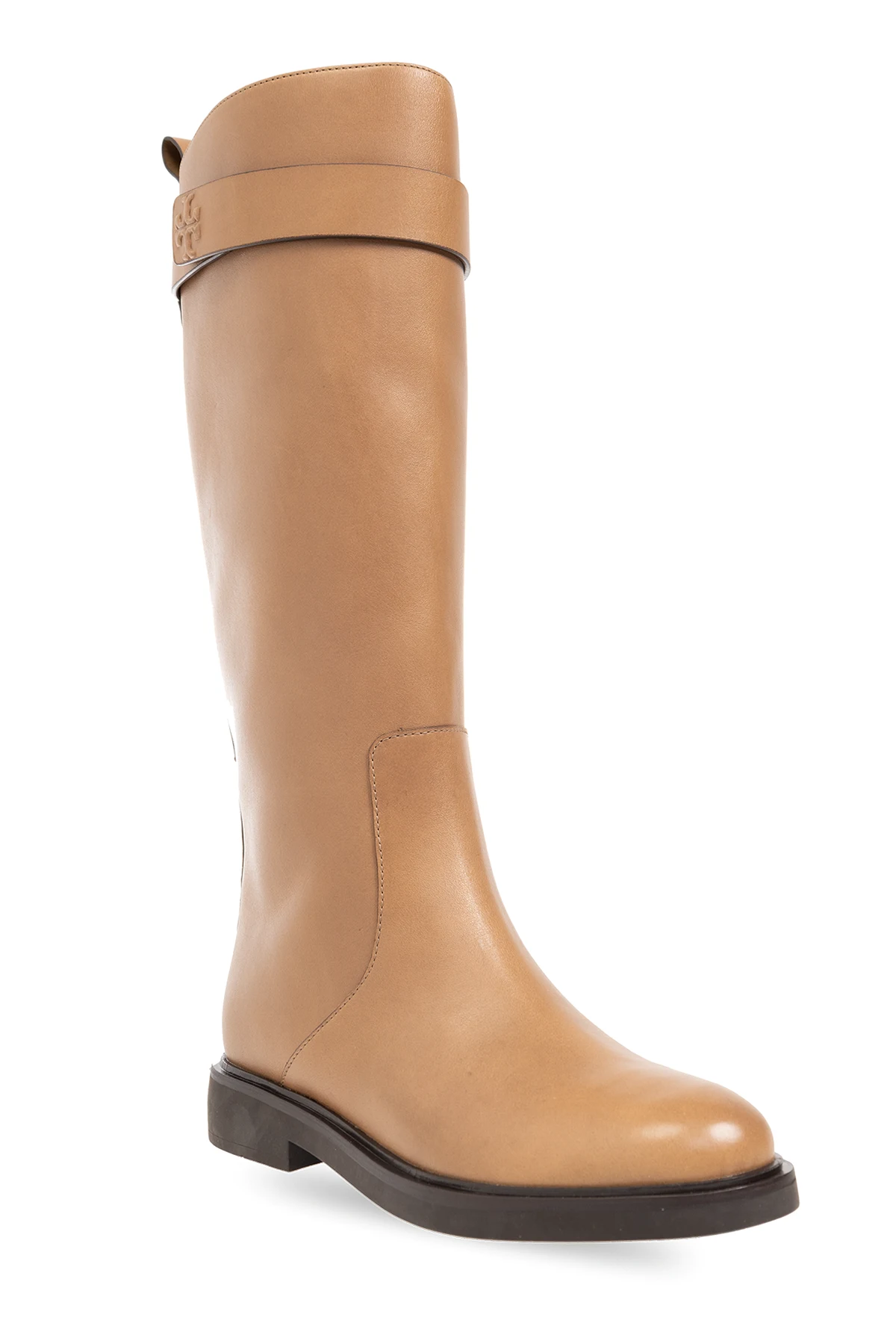 Light brown knee-high boots from Tory Burch. Made of leather with a round toe, this model sits on a dark brown rubber sole and features a side zip accompanied by a velcro-fastened strap and a tactile logo.