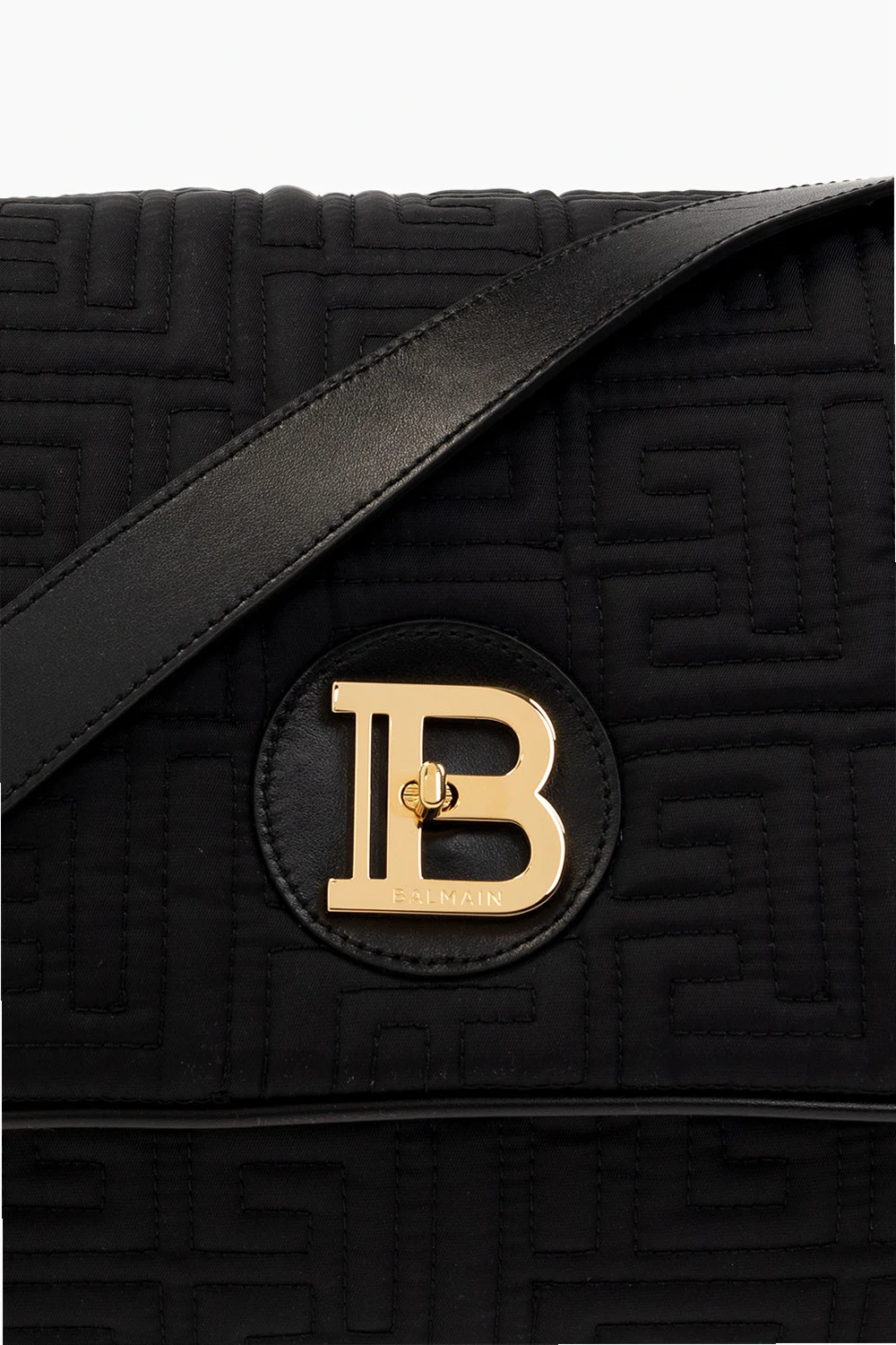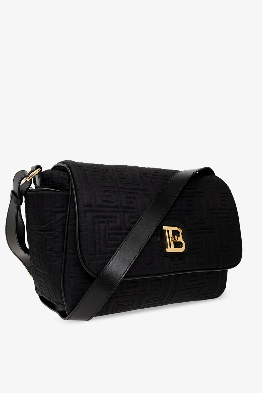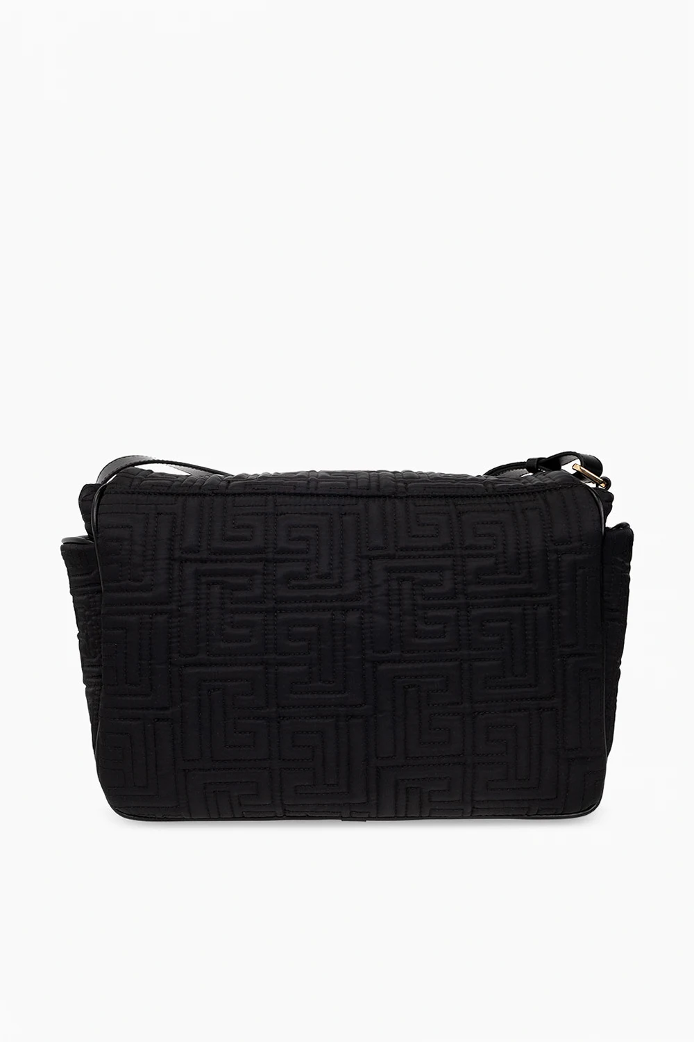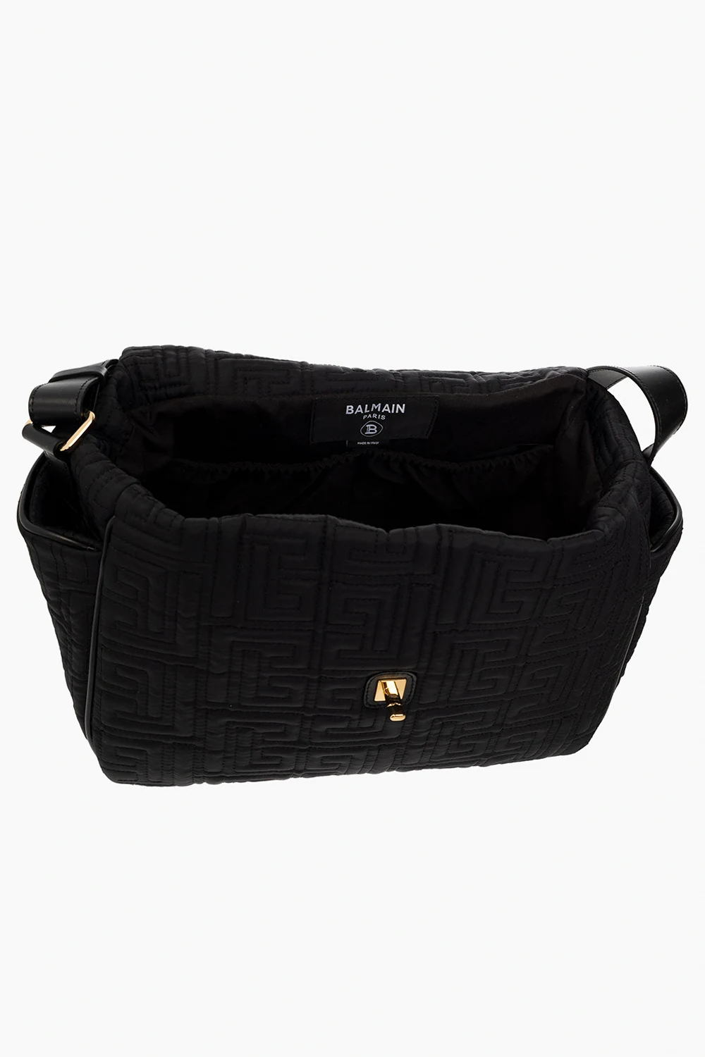 Black changing bag from Balmain Kids. Fastened with a snap button, this model features an embroidered logo pattern, two side pockets, shoulder strap, gold-tone metal hardware and one internal compartment with two slip pockets.